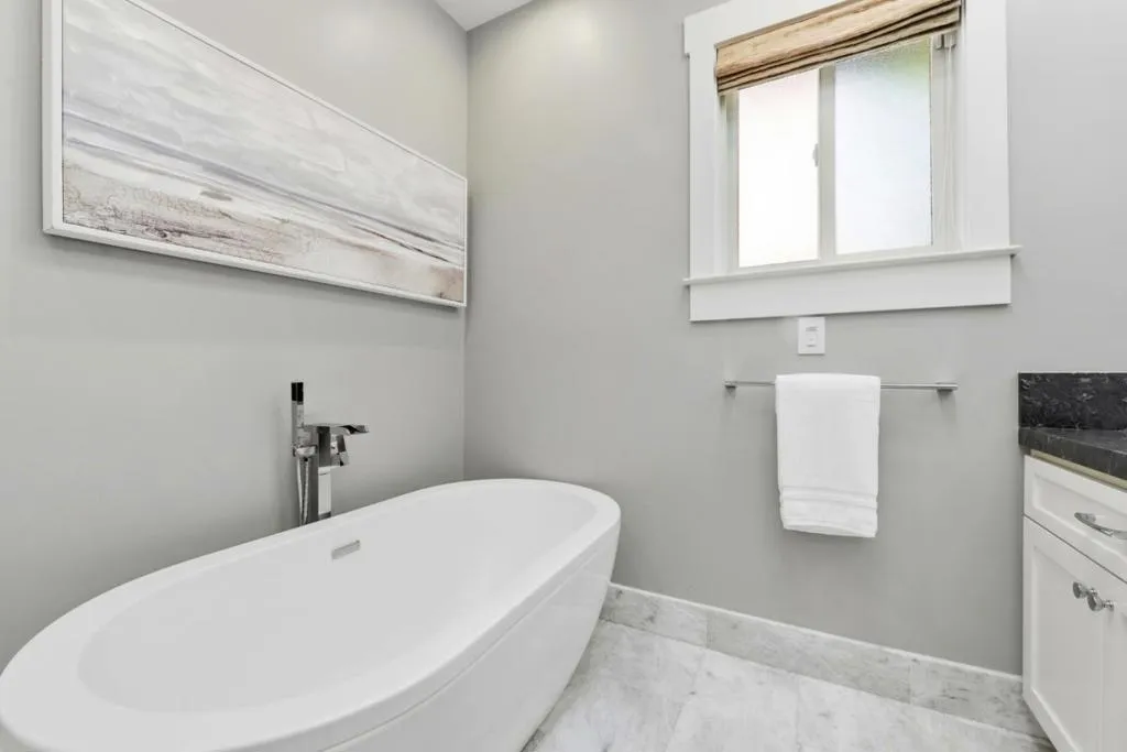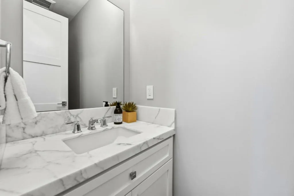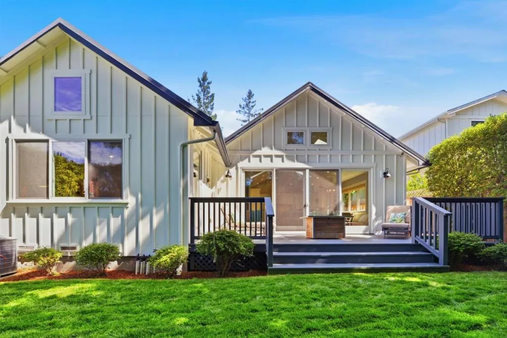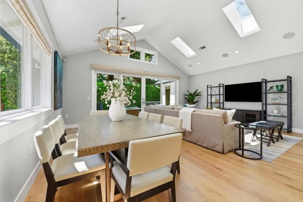 Special street in Menlo Park! This approximately 2,486 square foot single-level home offers four bedrooms and three and a half bathrooms. The modern farmhouse-style design features vaulted ceilings, skylights and transom windows, to list just a few details creating a spacious and airy atmosphere throughout the living areas. The Calcutta marble island and Quartz countertops, and stainless appliances in the kitchen provide a sleek and functional space for the discerning chef, complemented by the vaulted ceilings, skylights and abundant windows that flood the space with natural light. The home's expansive primary bedroom suite includes dual closets, and a generously sized en-suite bathroom, with dual vanities, tiled shower, and standalone tub. Another bedroom has an adjacent bath, and the other two bedrooms are connected with a walk-through bathroom with separate vanities. Modern details and convenience include Nest thermostats, dual tankless water heaters, air conditioning, and Sonos sound system. The Connecticut bluestone porch entrance and intimate back deck extends the living space outdoors, providing a tranquil setting for relaxation or gatherings.