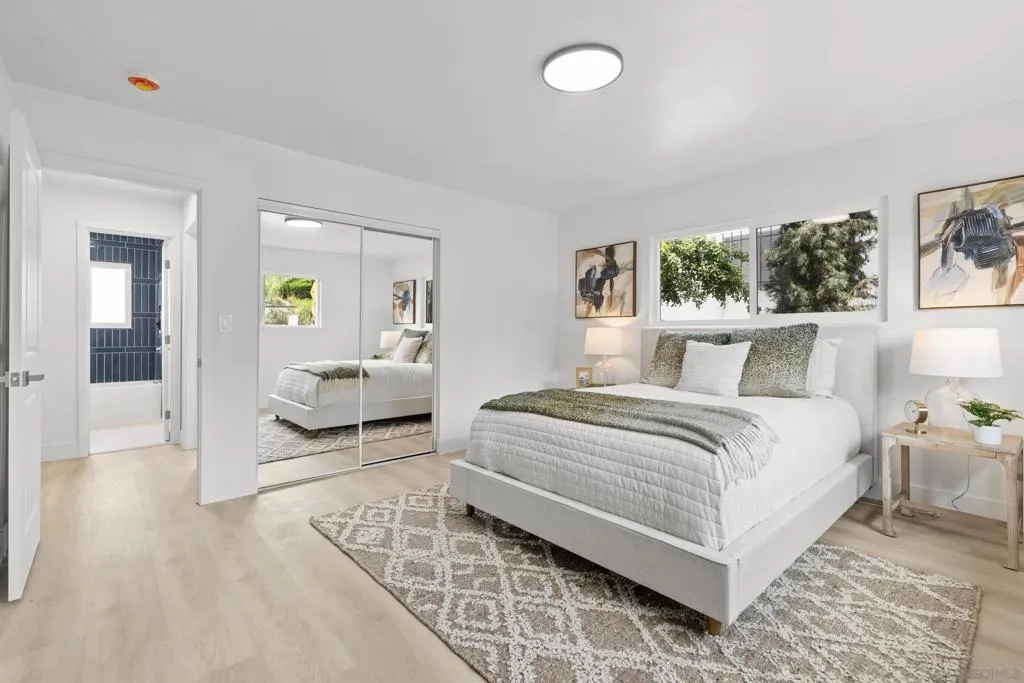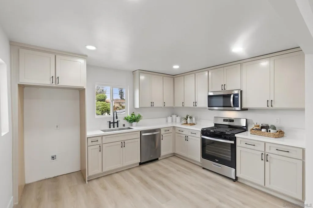 Stunning remodeled Valencia Park home with sunset views, over 1,800 sq ft, and incredible flexibility including 3 bedrooms plus up to 2 optional bedrooms. Featuring a downstairs layout ideal for multigenerational living or potential ADU conversion, plus PAID SOLAR for energy efficiency. The home offers a spacious and functional layout with a large chef’s kitchen featuring abundant cabinetry, generous counter space, and a walk-in pantry, flowing seamlessly into the main living areas. The lower level includes the primary suite with a large walk-in closet and built-in bench seating, along with two optional rooms and a separate living space—perfect for extended family, guests, or future conversion opportunities. Additional highlights include dual pane windows, central HVAC for year-round comfort, and a walk-in basement providing valuable extra storage. A rare opportunity to own a move-in ready home with space, versatility, and beautiful views in San Diego.