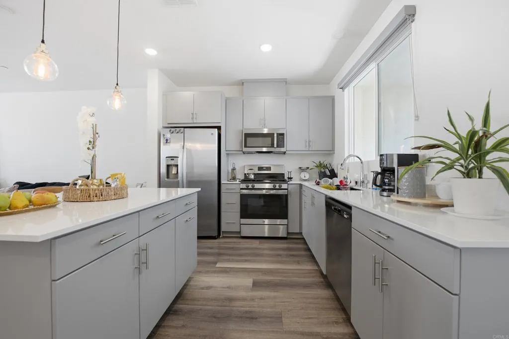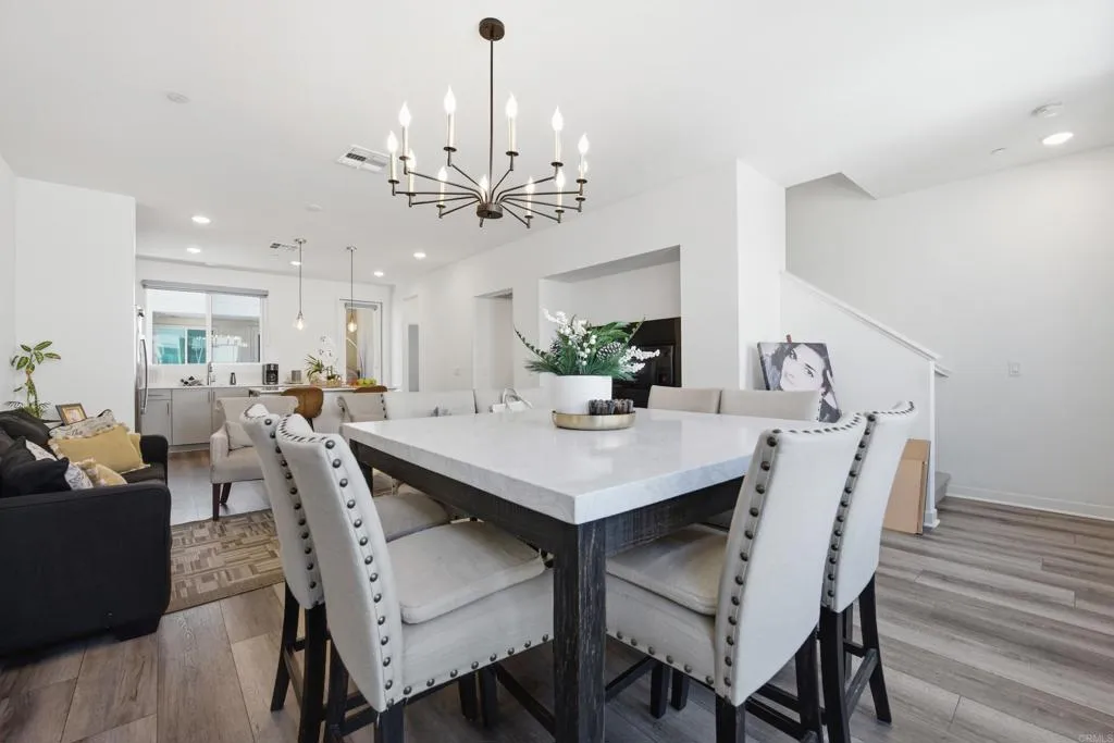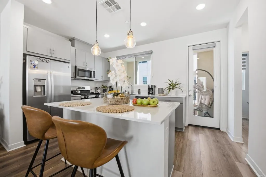 Welcome to La Brisa, one of Otay Mesa's most sought-after newer communities, built in 2022 by TRI Pointe Homes. This stylish 3-story townhome offers 3 bedrooms, 2.5 bathrooms, and 1,703 sq ft of thoughtfully designed modern living. The entry level features a versatile flex space perfect as a home office, gym, or guest area, along with direct access to your attached 2-car garage. The main living level showcases an open-concept great room with a chef-inspired kitchen featuring quartz countertops, stainless steel appliances, a large center island, and seamless flow into the dining and living areas. Upstairs, the primary suite offers a private retreat with a spa-like bathroom, while two additional bedrooms and a full bath complete the top floor. Enjoy low-maintenance living in a well-kept, VA approved community with scenic walking paths and picnic areas. Conveniently located near the 905 and 5 freeways, the Otay Ranch outlets, and the US-Mexico border crossing, ideal for commuters and those who love the energy of the South Bay.