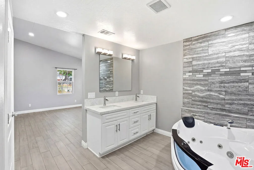 Welcome to this beautifully refreshed Hesperia home offering space, style, and flexibility. Featuring an open floor plan and two private primary suites on opposite sides of the home, this layout is ideal for multigenerational living, guests, or added privacy. The oversized kitchen is a standout with extensive cabinetry, expansive counters, and a seamless flow into the living area. The spacious primary suites feature spa-inspired bathrooms with dual vanities and a soaking tub. Additional highlights include an indoor laundry room, detached garage, and fenced dog area. With generous interior spaces and a versatile lot, this property offers the comfort and function today's buyers are looking for.