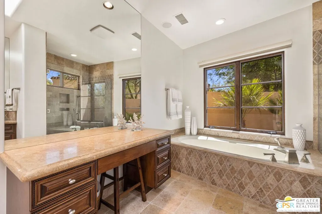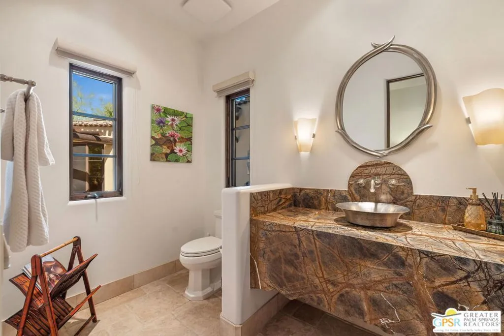 Perfectly positioned on an oversized south-facing lakefront lot at Stone Eagle Golf Club, this beautifully designed 3 bedroom + optional 4th bedroom residence captures panoramic water and mountain views in a setting defined by privacy and elegance. Located within one of South Palm Desert's most exclusive guard-gated communities, the home offers a seamless blend of indooroutdoor living and refined desert lifestyle. A private front courtyard welcomes you into a formal entry that opens to a light-filled great room with vaulted ceilings, floor-to-ceiling windows, and expansive sliding doors that frame the lake and mountains beyond. The living spaces flow effortlessly to the outdoors, where a pool, separate spa, and covered cabana create a true resort-style experience overlooking the water. The expansive kitchen is designed for both everyday living and entertaining, featuring granite countertops, a large island, walk-in pantry, and built-in wine refrigeration, all connected to formal dining and living areas with direct access to the patio. The Primary Suite offers a private retreat with fireplace, sweeping views, outdoor access, a generous walk-in closet, and a spa-like bath with split vanities, soaking tub, and walk-in shower. An adjacent media room with nearby bath provides flexibility as a fourth bedroom or guest space. On the opposite side of the home, Junior Ensuites Two and Three each enjoy views, patio access, and private baths. Additional features include an inside laundry room and attached two-car plus golf cart garage. Stone Eagle is known for its elevated lifestyle, offering a secluded setting surrounded by lakes, streams, and waterfallsyet just minutes from El Paseo's renowned shopping, dining, and entertainment. A rare opportunity to own a south-facing lakefront home with scale, views, and exceptional indooroutdoor living in one of the desert's most coveted communities.