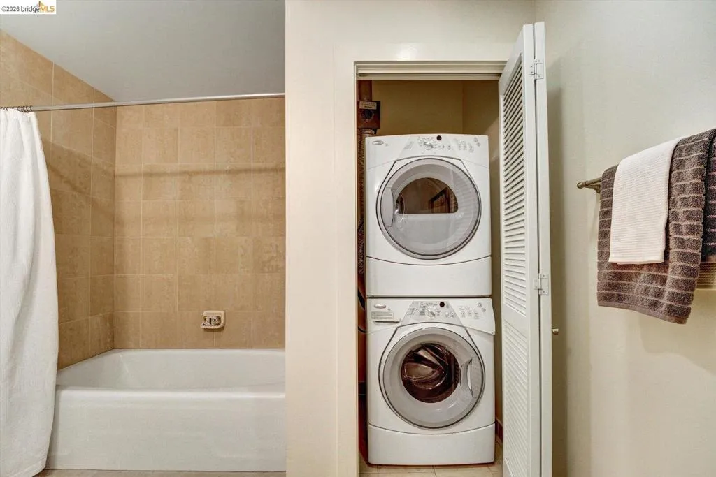 With a peek-a-boo view of the Port of Oakland and the San Francisco skyline from its private terrace, this immaculate fifth story two-bedroom condominium at Market Square shines with beautiful hardwood floors, new bedroom carpeting and two full bathrooms. Bedrooms are separated by living space, giving great flexibility. Generous closets, handsome kitchen, in-unit laundry, secure parking for one (with adjacent EV charger.) Pet friendly. Market Square is rich with amenities including a serene bamboo garden and a furnished rooftop with outdoor grill, fitness and business centers, sauna, steam room, community library and conference space. Proximate to 12th Street BART, Jack London's waterfront bicycle and walking trails, Chinatown, Old Oakland's cafes and restaurants including historic Swann's Market and downtown's entertainment centers as well as year-around farmers' market.