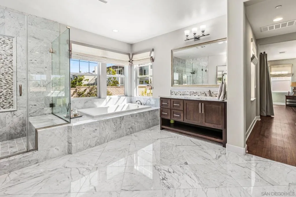 Located in the highly sought-after Pacific Highlands Ranch community and within a top-rated school district, this exceptional two-story home blends comfort, style, and functionality. Designed for both everyday living and entertaining, the backyard is a true retreat—featuring a sparkling pool and spa, large covered patio, and seamless indoor-outdoor flow. Inside, you’ll find a formal living room with a cozy fireplace, along with a main-floor junior suite—ideal for guests or multigenerational living. The beautifully appointed kitchen showcases stainless steel appliances, quartz countertops, a large island with breakfast bar seating, and opens effortlessly to the spacious family room. Upstairs, a versatile loft offers additional living space perfect for a media room, office, or play area. The expansive primary suite is a private retreat, complete with balcony access, a walk-in closet, and a spa-inspired bathroom featuring dual vanities, a soaking tub, and a walk-in shower. Additional highlights include an attached 3-car garage and access to resort-style community amenities including a clubhouse, pool, spa, fitness center, and recreation areas. Ideally located near shopping, dining, parks, open space trails, golf, and with easy access to Highway 56—this home truly has it all.