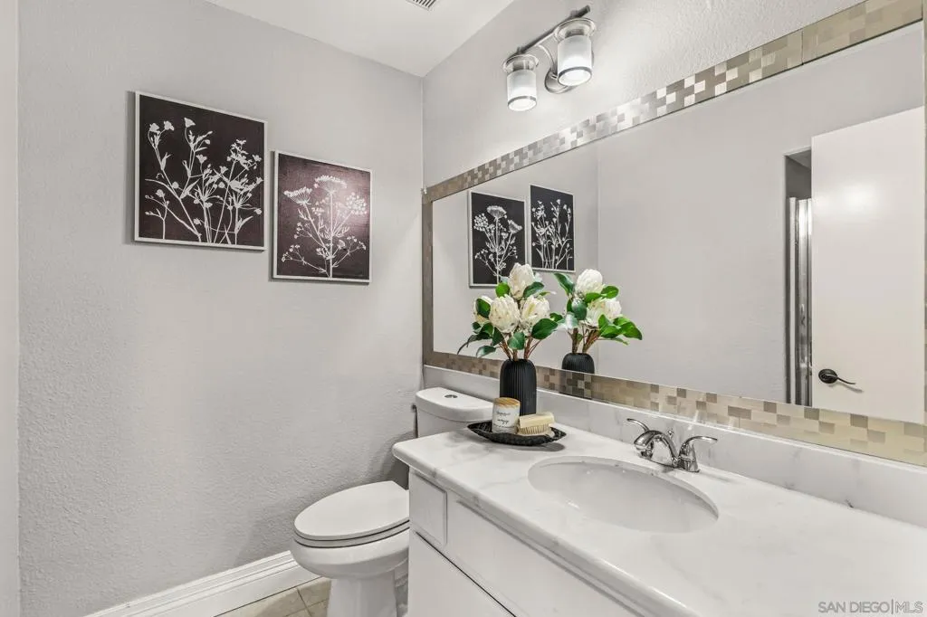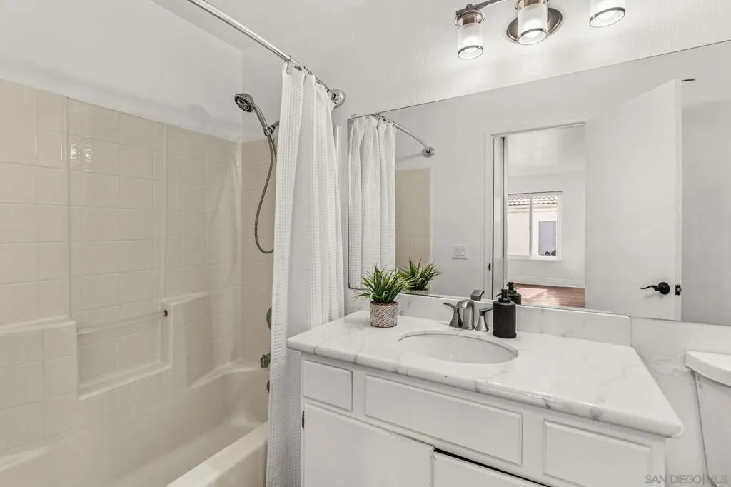 Move-in ready and beautifully refreshed, this two-story Terra Nova townhome lives like a single family home with attached private garage and only one shared wall. Fresh paint, central A/C, and wood-laminate flooring throughout create a clean, modern feel, while vaulted ceilings and abundant natural light enhance the open, airy layout. The well-appointed eat-in kitchen features granite countertops, crisp white cabinetry, and ample storage, flowing seamlessly into the living space highlighted by a cozy fireplace. A downstairs bedroom and full bathroom provide flexibility for guests or a home office. Upstairs, the spacious primary suite offers a relaxing retreat with a walk-in closet and en-suite bath. Step outside to a private, low-maintenance backyard—perfect for enjoying indoor-outdoor living with minimal upkeep. Additional features include a supplementary assigned parking space, ample guest parking, and convenient in-unit laundry room. Residents of Terra Nova enjoy access to community amenities including a pool and playground, all in a well-maintained neighborhood close to everyday essentials. Steps from the shops, dining, and amenities of Terra Nova Plaza, and easy access to the 805 freeway.