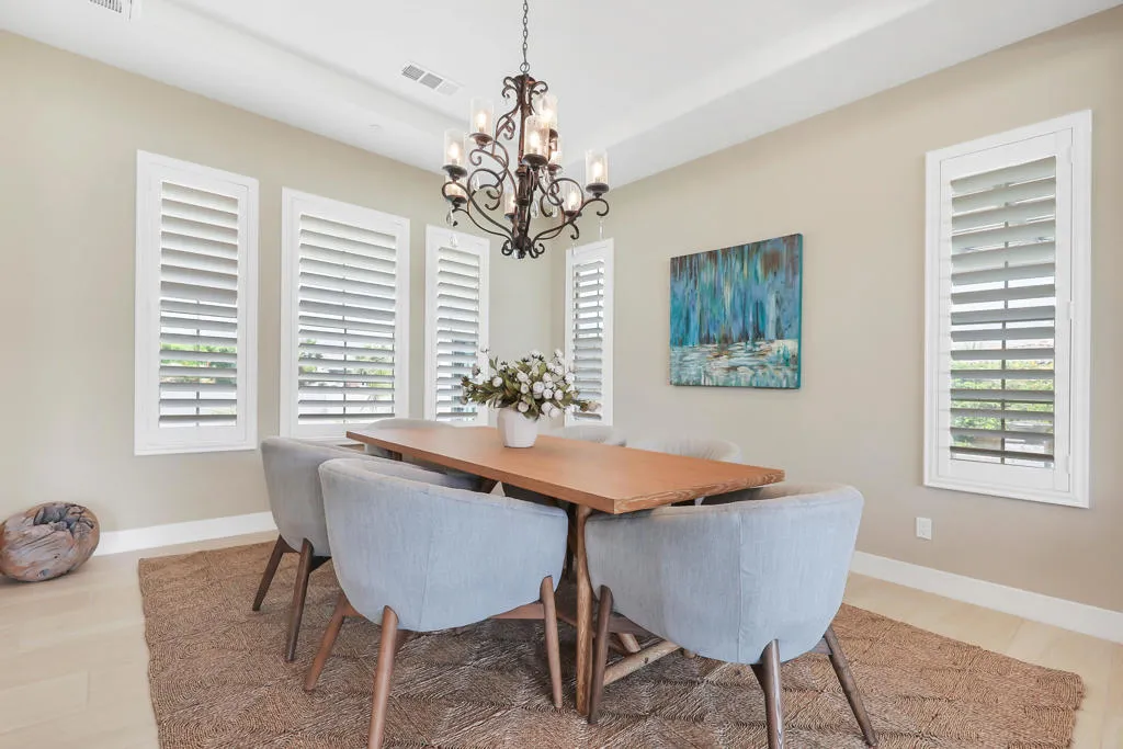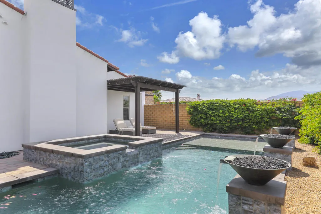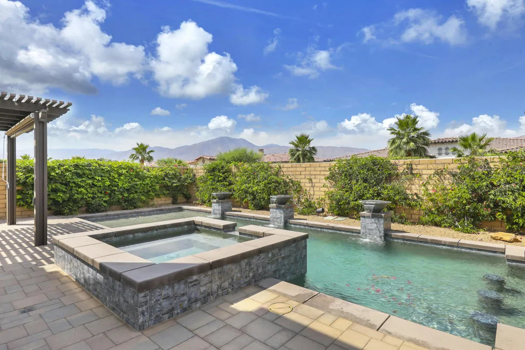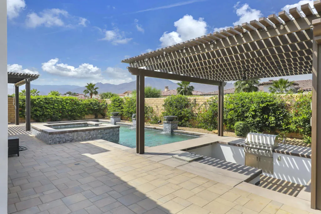 I've said it before and will say it again: Great home, great location and an amazing View of the Santa Rosa Mountains. This home has so many wonderful features, the pool, spa & sunken barbecue all face South toward the Santa Rosa Mountains. The secondary entertainment area with Bocce Ball & covered Veranda face North making this truly the best of both worlds. Cool when you want it, Sunbathing and swimming or floating in this sun soaked pool with fire features, swim up bar & water Descents all day long. The home features 3 bedrooms, all en suite, upgraded cabinets with clean current Quartz counters. The office/Den/TV room features a spectacular work at home or relax on home space. The Garage has a brand-new epoxy floor with mini split A/C. Additional features include a whole home soft water system, Alkaline water purification under the kitchen sink, custom beams in the great room, for you sound & audio buffs the home is equipped with 'control 4'. The sellers took a standard Encore 1 floor plan and turned it into one special home. Griffin Ranch community is recognized as one of the very finest communities in a fantastic location across the street from 6 championship golf courses, close but not too close to some of the finest music festivals and amenities that include Pickleball, Tennis, Bocce, a world class Fitness Center, Jr. Olympic Pool & hot tub, 9 hole putting green and a great walking park. This 24 hr guard gated community is truly Desert Living at it's best!