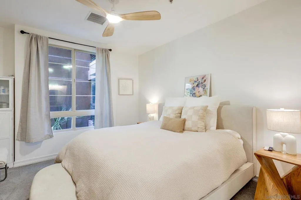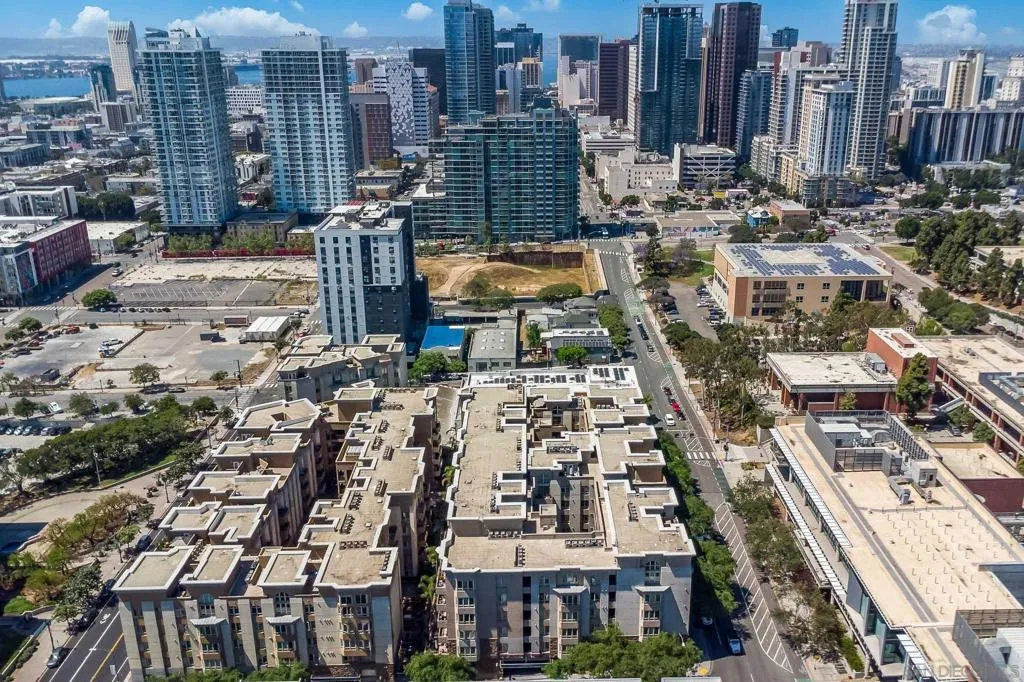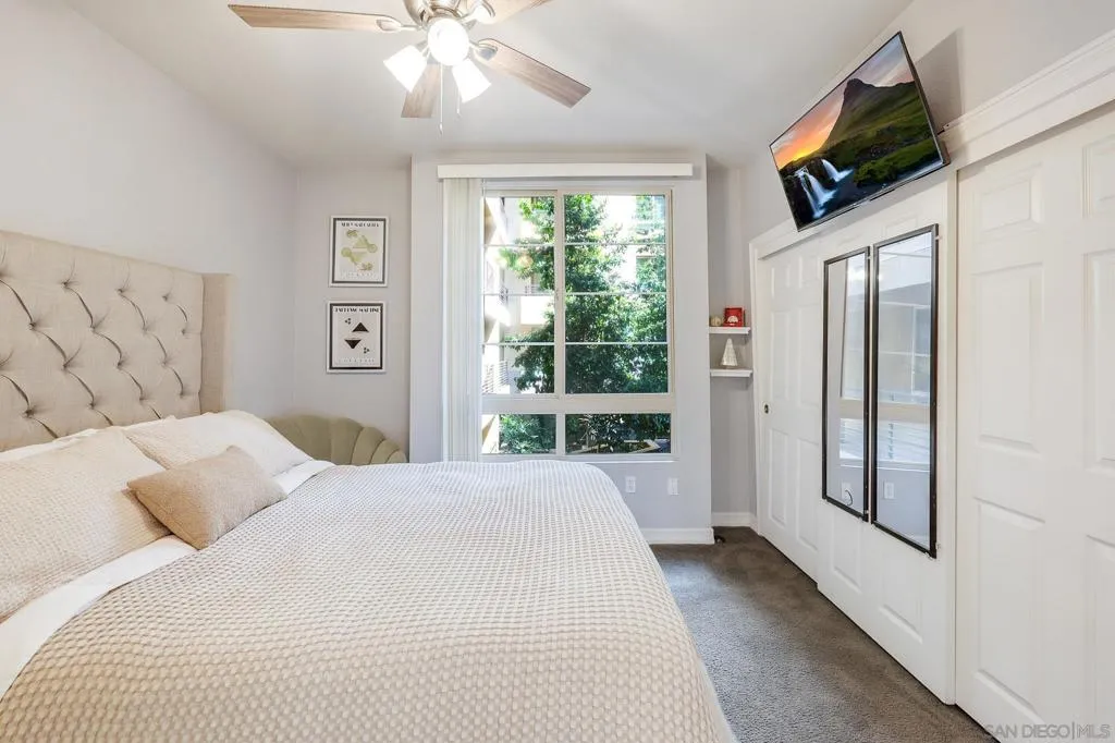 Welcome to Union Square at Broadway, a VA approved community, where comfort, style, and city convenience come together in this updated 2-bedroom, 2-bath residence. This home features a highly desirable split floor plan that ensures privacy and versatility, perfect for accommodating roommates, guests, or a dedicated home office. The interior has been upgraded with luxury vinyl plank flooring (2024), recessed lighting (2024), and a Nest smart home thermostat. The open concept living area offers direct access to a private patio, and with no neighbors on either side, provides a rare level of privacy for downtown condo living. Located in the heart of downtown, this home boasts a Walk Score over 90 and is directly across from San Diego City College with easy access to freeways 163, 5, and 94. Just two blocks away, the highly anticipated East Village Green park is under construction and will feature expansive green space, a community center, dog parks, cafés, and more. Union Square residents enjoy amenities including a fitness center with sauna and jacuzzi, BBQ areas, EV charging stations, a community room, and onsite management, along with community events throughout the year. Don’t miss this opportunity to own a move-in-ready home in one of downtown San Diego’s most dynamic neighborhoods.