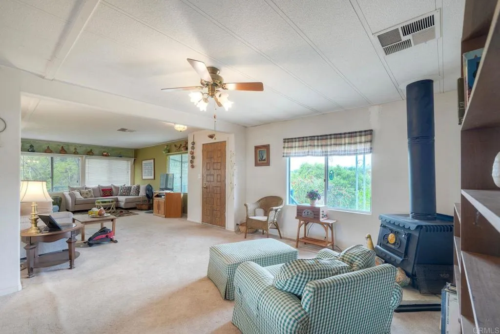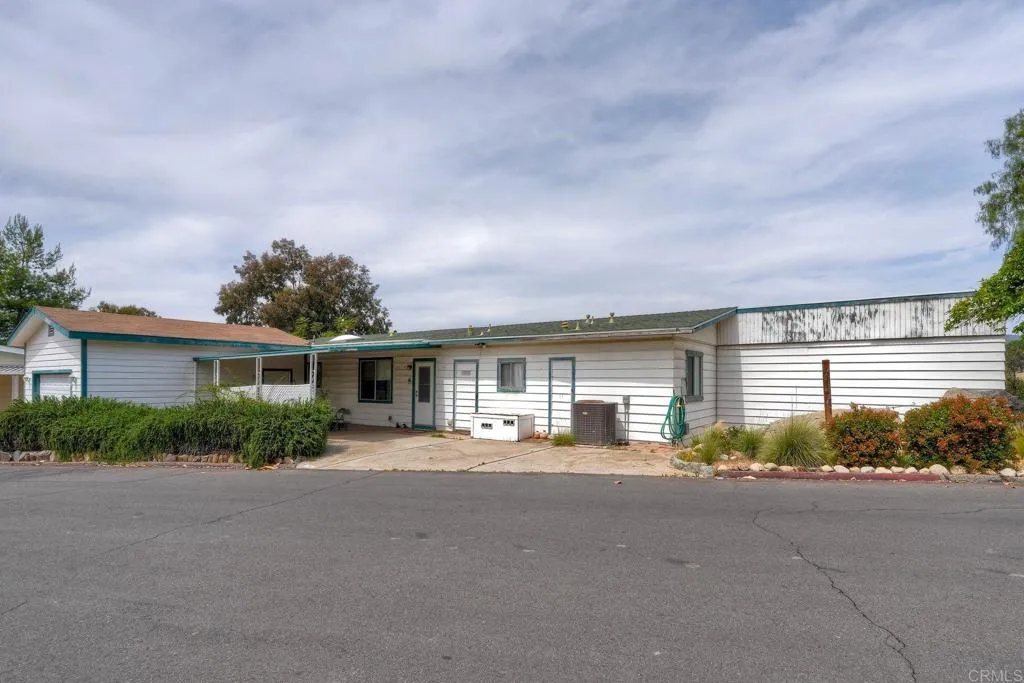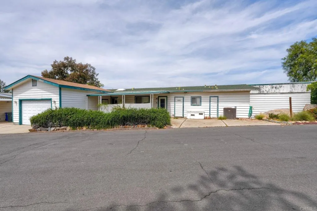 GREAT LOCATION DIRECTLY ACROSS FROM THE CLUBHOUSE!! 1974 2 Bed, 2 bath, at 1440 esf. with a large garage. Priced for only $159,000!!! This is a nice, manufactured home in a Senior Park 55/45 with a lovely wood burning stove in the living room. The primary bedroom has a large walk-in closet and a deck that has a wonderful view of the local mountains. Located in lovely Skyline Ranch Country Club, a premier Senior Park that sits in the foothills of Valley Center. Currently offering FREE golf to all residents, full clubhouse use, gym, gated community, dog park, and much more. This home has a large back yard with mature fruit trees. Skyline Ranch is a land leased park; the monthly space rent here is 1750.00. Please come and see this wonderful home located in a great Senior Park with many amenities.
