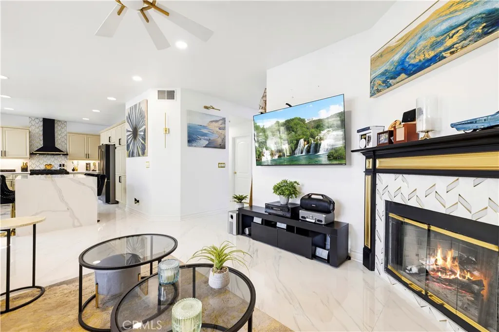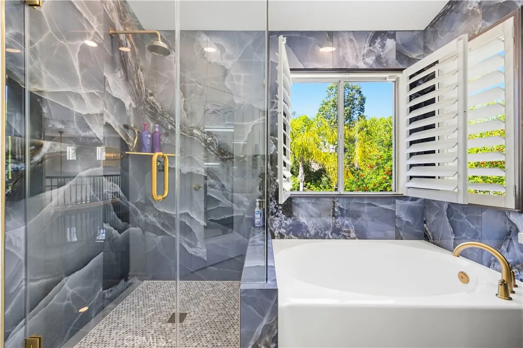 Experience refined living in one of Northpark’s most prestigious enclaves in a forest-like setting. This impeccably remodeled residence is ideally located just a short stroll from the award-winning North Park Elementary School and moments from the scenic beauty of Chesebrough Park. From the moment you enter, you are welcomed by soaring ceilings and an abundance of natural light that highlights the home’s sophisticated design. The main level is adorned with exquisite marble-inspired porcelain flooring, setting a tone of understated luxury throughout. At the heart of the home lies a beautifully appointed kitchen, thoughtfully designed with premium, designer-inspired ZLINE appliances, elegant cabinetry, and an expansive quartz island—perfect for both everyday living and upscale entertaining. The open-concept layout flows seamlessly into the spacious family room, all with effortless access to a spectacular backyard retreat. A desirable downstairs bedroom, paired with a fully upgraded bathroom featuring refined finishes, offers comfort and flexibility for guests or multigenerational living. A striking staircase with rich wood accents leads to the second floor, where wide-plank marble-inspired flooring continues the home’s cohesive, high-end aesthetic. A generous open loft overlooks the main living space, offering endless possibilities as a media room, executive office, fitness studio, or play area. The primary suite is a true sanctuary—expansive and serene, with dual sliding doors that open to a private, oversized deck overlooking the resort-style backyard, framed by lush greenery and swaying palms. The spa-inspired ensuite bath features a grand walk-in shower with custom tilework and thick glass enclosure, a dual-sink vanity with designer fixtures, and a dramatic backlit mirror and a stunning L-shaped walk-in closet. Addtionally, this home offers two well-appointed bedrooms and a fully remodeled bathroom featuring a dual-sink vanity and elegant backlit mirror. The backyard is surrounded by a lush hillside and mature trees, this private oasis offers the perfect blend of shade and sunshine. A sparkling pool with cascading waterfall serves as the focal point, complemented by an elevated spa and inviting firepit—ideal for evenings under the stars. Thoughtfully curated details such as a covered patio, ambient string lighting, artificial turf, and additional side yard space create a truly elevated outdoor living experience.