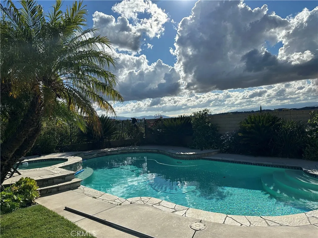 Enjoy beautiful sweeping sunsets from den and kitchen of pool/jacuzzi and mountains with magic mountain in the distance. Sit under covered patio and barbeque while enjoying your privacy on top of a hill over brand new remodeled park with exercise stairs, basketball, softball and children's covered playground. Corner house on cul-de-sac in very quiet neighborhood near the new Skyline Ranch Area. No HOA!