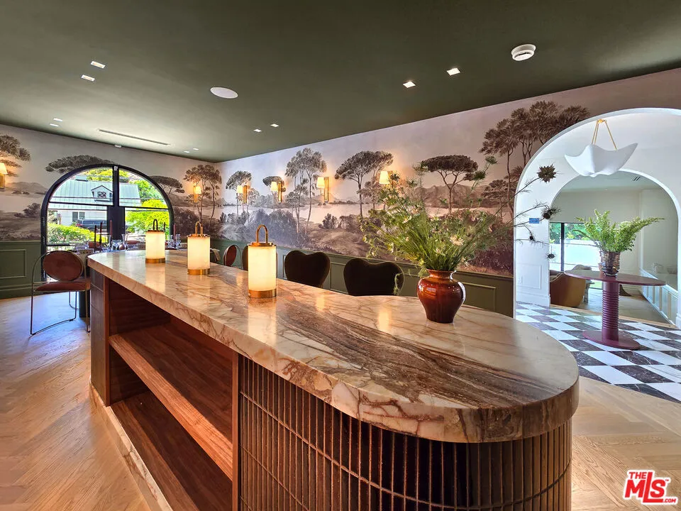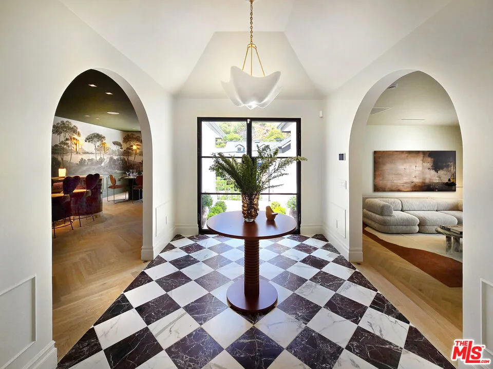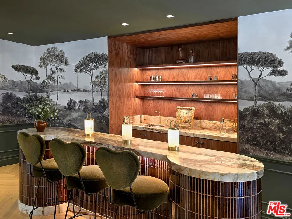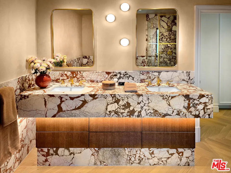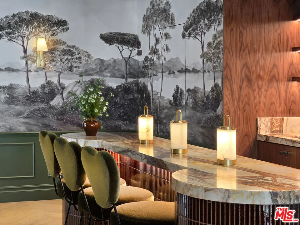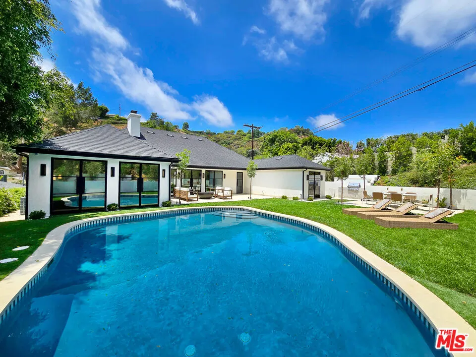 Perched on a corner lot of a serene knoll in the heart of Beverly Hills' coveted Coldwater Canyon, this exquisitely just remodeled single-story Contemporary estate is a newly completed design masterpiece by renowned designer Nina Takesh. Spanning over 2,900 square feet, this four-bedroom, five-bathroom residence redefines bespoke luxury, blending refined sophistication with effortless California living. From the moment you enter through Pinky's custom iron doors, it's clear no expense was spared. The home features engineered herringbone wood floors, Roman Clay walls by Portola, and custom finishes at every turn. The entire property is outfitted in real marble, lending timeless elegance and material integrity throughout. The formal entry, accented by a coved ceiling and sculptural plaster chandelier by Visual Comfort, opens into an oversized, step-down family room that connects seamlessly to a designer bar and dining area. The bar features a rare, hand-hammered polished steel sink by Mick De Giulio for Kallistaone of many exceptional selections, as every plumbing fixture in the home is exclusively from the luxury brand Kallista. The formal living room is centered around a one-of-a-kind fireplace clad in dramatic Rosso Levanto marble and opens to the expansive backyard through three sets of glass doors. The chef's kitchen is a study in both beauty and functionality, with a central island, breakfast bar, top-tier Jenn Air appliances, Calacatta marble backsplash, and flawless flow. All four bedrooms are en suite, including the luxurious primary suite with a walk-in closet and private access to the backyard. Every bathroom features custom glass shower doors inset with a mix of polished nickel and brass, adding a tailored, jewel-box quality to the spaces. Outside, the newly redone resort-style pool, built-in BBQ station with refrigerator, al fresco dining area, and lush landscaping creates a true entertainer's paradise. There's even a dedicated dog run for your four-legged guests. Lighting has been curated down to the last detail: all decorative fixtures are by Visual Comfort, and the recessed lighting is powered by Elemis, Visual Comfort's most advanced home lighting solution. A state-of-the-art home automation system ensures effortless control of lighting, climate, and entertainment. Additional highlights include elegant wainscoting throughout and premium architectural hardware from the luxury Australian brand Bankston. Just minutes from the legendary Beverly Hills Hotel and the world's most coveted shopping and dining on Rodeo Drive, this top-of-the-line residence offers an extraordinary level of design, customization, and comfort designed for the most discerning buyer.
