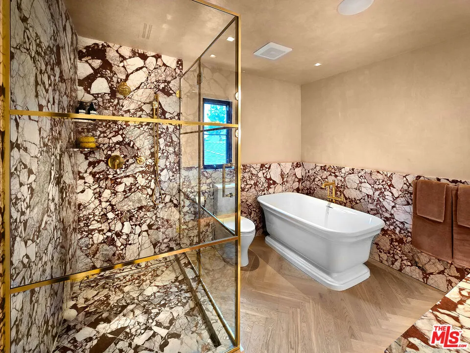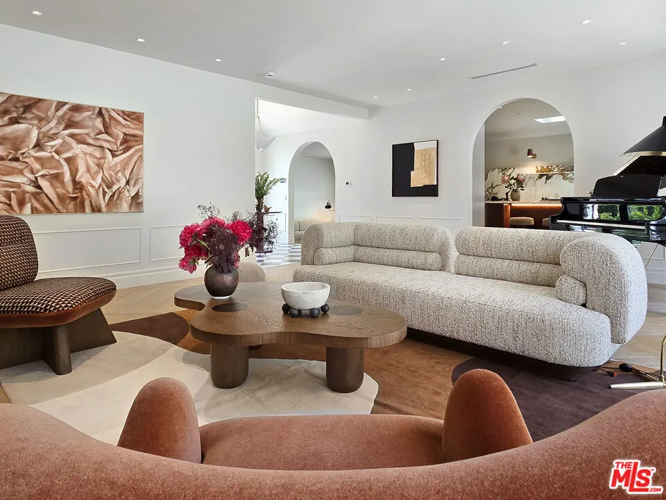 Perched on a corner lot of a serene knoll in the heart of Beverly Hills' coveted Coldwater Canyon, this exquisitely just remodeled single-story Contemporary estate is a newly completed design masterpiece by renowned designer Nina Takesh. Spanning over 2,900 square feet, this four-bedroom, five-bathroom residence redefines bespoke luxury, blending refined sophistication with effortless California living. From the moment you enter through Pinky's custom iron doors, it's clear no expense was spared. The home features engineered herringbone wood floors, Roman Clay walls by Portola, and custom finishes at every turn. The entire property is outfitted in real marble, lending timeless elegance and material integrity throughout. The formal entry, accented by a coved ceiling and sculptural plaster chandelier by Visual Comfort, opens into an oversized, step-down family room that connects seamlessly to a designer bar and dining area. The bar features a rare, hand-hammered polished steel sink by Mick De Giulio for Kallistaone of many exceptional selections, as every plumbing fixture in the home is exclusively from the luxury brand Kallista. The formal living room is centered around a one-of-a-kind fireplace clad in dramatic Rosso Levanto marble and opens to the expansive backyard through three sets of glass doors. The chef's kitchen is a study in both beauty and functionality, with a central island, breakfast bar, top-tier Jenn Air appliances, Calacatta marble backsplash, and flawless flow. All four bedrooms are en suite, including the luxurious primary suite with a walk-in closet and private access to the backyard. Every bathroom features custom glass shower doors inset with a mix of polished nickel and brass, adding a tailored, jewel-box quality to the spaces. Outside, the newly redone resort-style pool, built-in BBQ station with refrigerator, al fresco dining area, and lush landscaping creates a true entertainer's paradise. There's even a dedicated dog run for your four-legged guests. Lighting has been curated down to the last detail: all decorative fixtures are by Visual Comfort, and the recessed lighting is powered by Elemis, Visual Comfort's most advanced home lighting solution. A state-of-the-art home automation system ensures effortless control of lighting, climate, and entertainment. Additional highlights include elegant wainscoting throughout and premium architectural hardware from the luxury Australian brand Bankston. Just minutes from the legendary Beverly Hills Hotel and the world's most coveted shopping and dining on Rodeo Drive, this top-of-the-line residence offers an extraordinary level of design, customization, and comfort designed for the most discerning buyer. Also available short term.