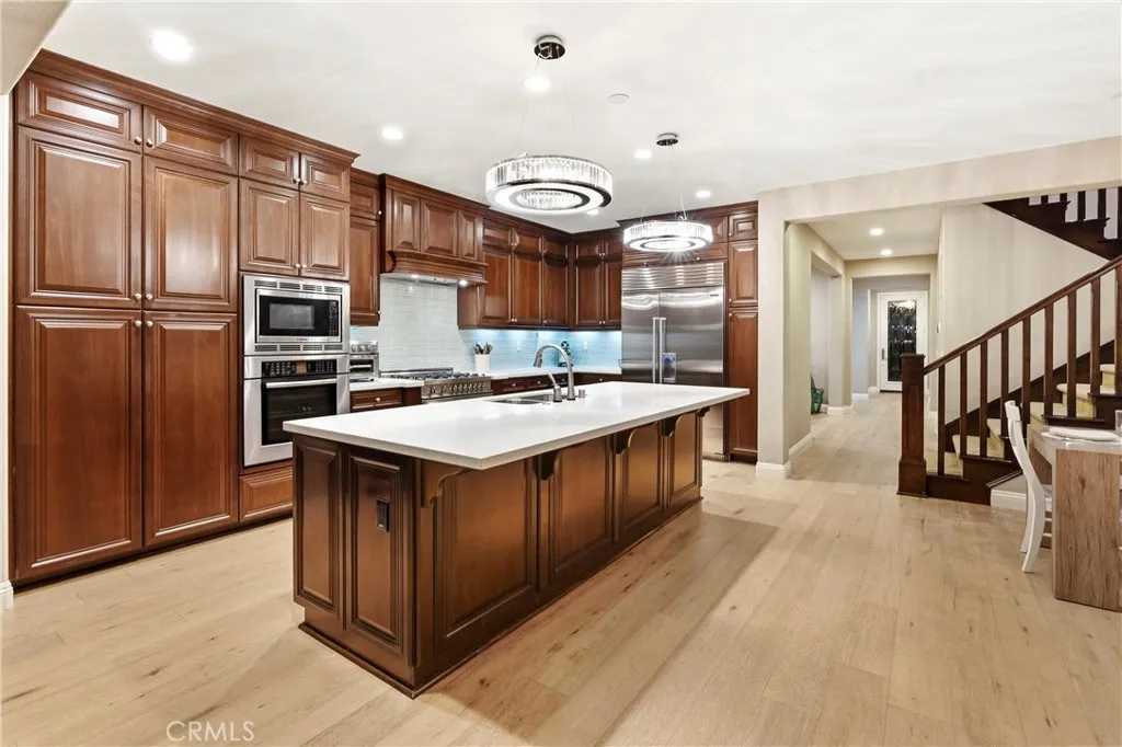 Located in the prestigious Country Club community of Glenwood, this contemporary masterpiece showcases an open-concept floor plan, scenic views, and high-end modern upgrades throughout. From the moment you enter through the striking glass door entry, you are greeted by large-plank rustic hardwood flooring and a seamless blend of luxury and sophistication. The upgraded kitchen features white quartz countertops, a stunning designer backsplash, and high-end appliances, designer crystal chandeliers. The office is enhanced with a custom-built bar and cabinetry, while the formal living room offers a grand fireplace, creating an elegant setting for entertaining. This beautifully appointed home offers exceptional comfort and modern convenience, including recent upgrades such as a built-in Sub-Zero refrigerator, GE Café dishwasher, fresh interior paint and exterior paint. Custom-designed closets are featured throughout, including impressive his-and-hers walk-in closets in the luxurious primary suite. Smart home features include an Eco thermostat, smart sprinkler system, and smart garage door opener. The three-car garage is upgraded with epoxy flooring, built-in storage cabinetry, and an EV charger. Energy efficiency is enhanced with fully owned solar. The backyard, completely reimagined in 2022, offers a private resort-style retreat with a heated pool and water feature, artificial turf, custom TV wall, fire pit, and a fully equipped outdoor kitchen with a Lynx grill and beverage refrigerator. The outdoor space is further complemented by enhanced landscaping, lighting, and a covered California Room with heaters, all overlooking the lush Wild Plant Garden. Additional features include a main-level bedroom, en-suite bathrooms for all secondary bedrooms, a separate guest bath on the main floor, a spacious den, and a luxurious primary suite with elegant stone finishes. Residents enjoy an abundance of premier community amenities, including a social membership to the private Jack Nicklaus-designed 18-hole golf course, a state-of-the-art fitness center, multiple parks, a clubhouse with an executive chef and renowned culinary team. Ideally located just 5 miles from Laguna Beach and minutes from Irvine Spectrum, this home is also part of an award-winning Blue Ribbon school district.