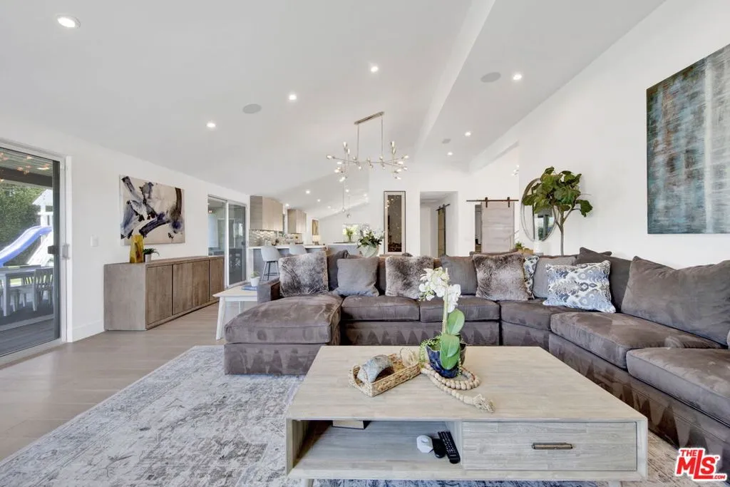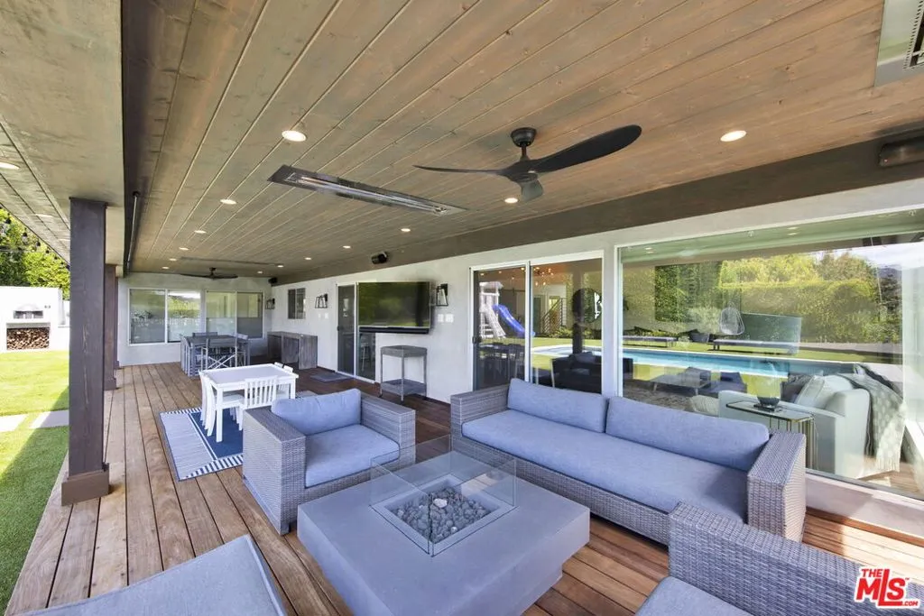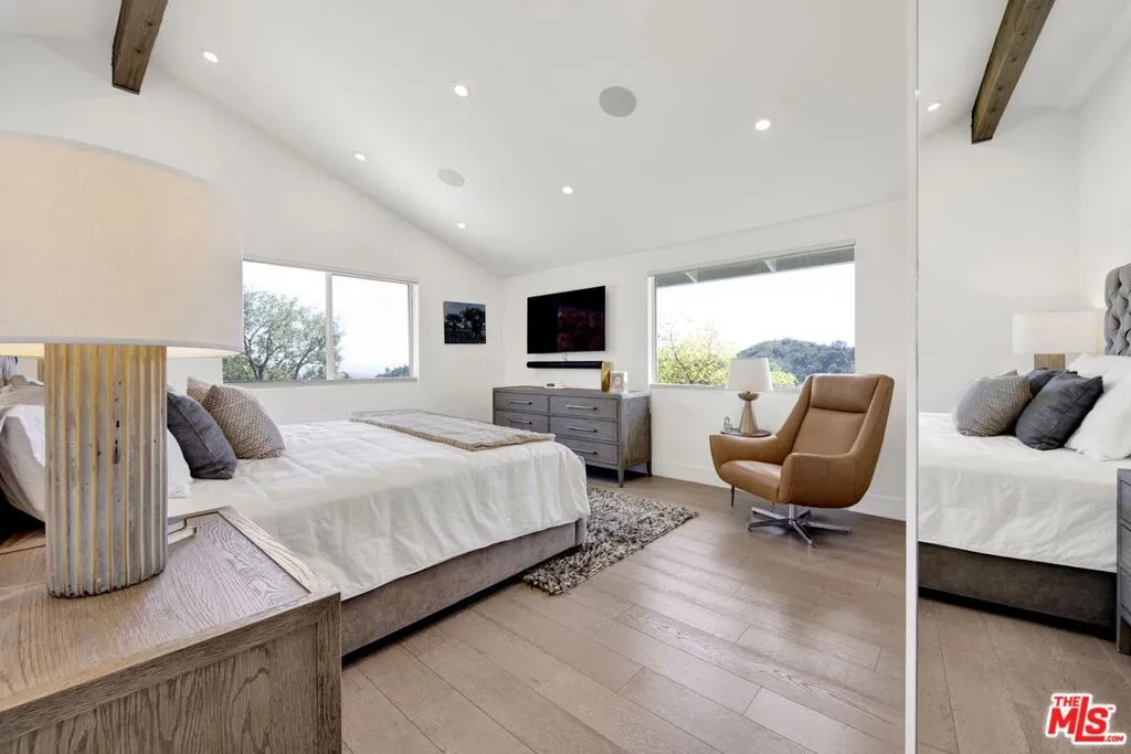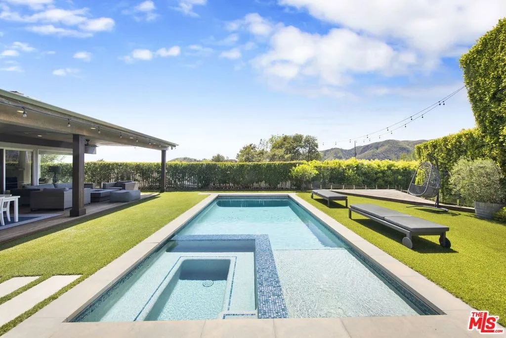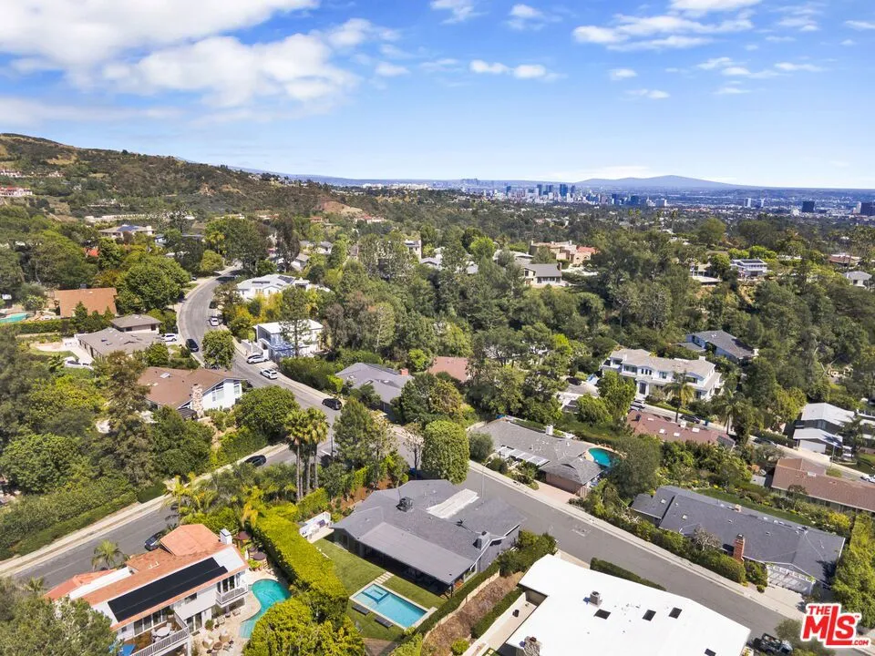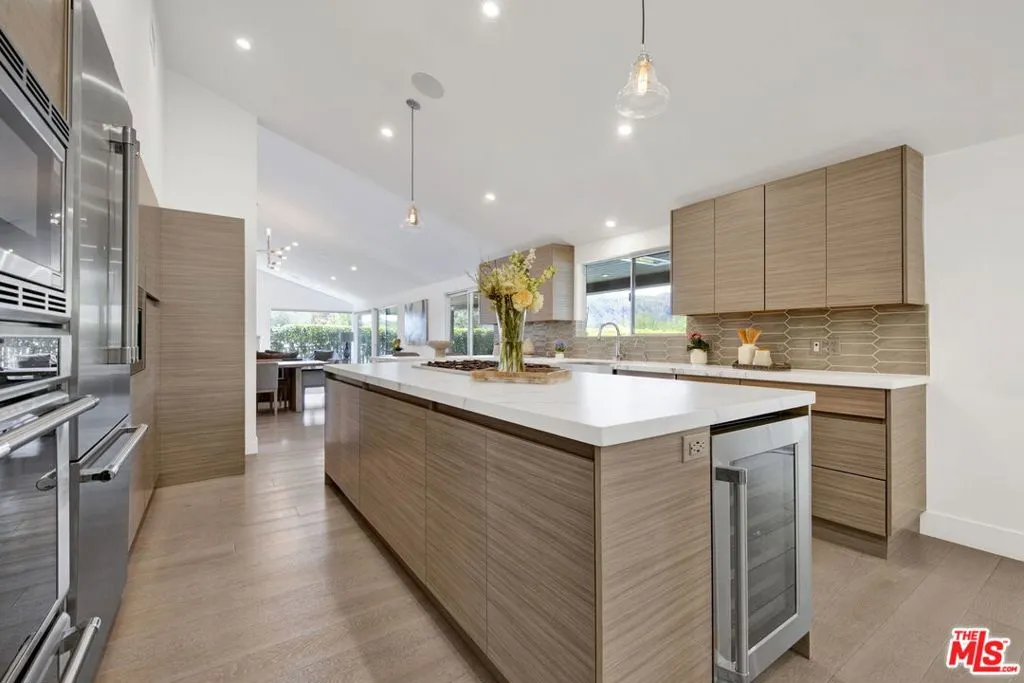 Beautifully remodeled with breathtaking canyon and mountain views, this 5BD/4BA canyon retreat blends timeless design with modern living. Vaulted ceilings, hardwood floors, and walls of glass fill the home with natural light and showcase sweeping vistas. The chef's kitchen features a center island, custom cabinetry, and stainless steel appliances, opening to a spacious family room ideal for entertaining. The dining area flows seamlessly to a resort-style backyard featuring a pool with built-in spa, custom outdoor kitchen with wood-fired pizza oven, built-in BBQ, and beverage refrigerators. Designed for both entertaining and play, the yard also includes a children's play structure with swings, monkey bars, slide, and a sportscourt. A covered outdoor patio with heaters features a full dining table, fire pit, and lounge seating. The upstairs primary suite offers a peaceful retreat with a beautifully updated bath and dual closets. Additional bedrooms on the main level provide flexibility for family, guests or office use. 3000 sq ft of living space set on approximately 10,000 sq ft lot in the tranquil hills of Brentwood. Also available for lease $22,500 per month.