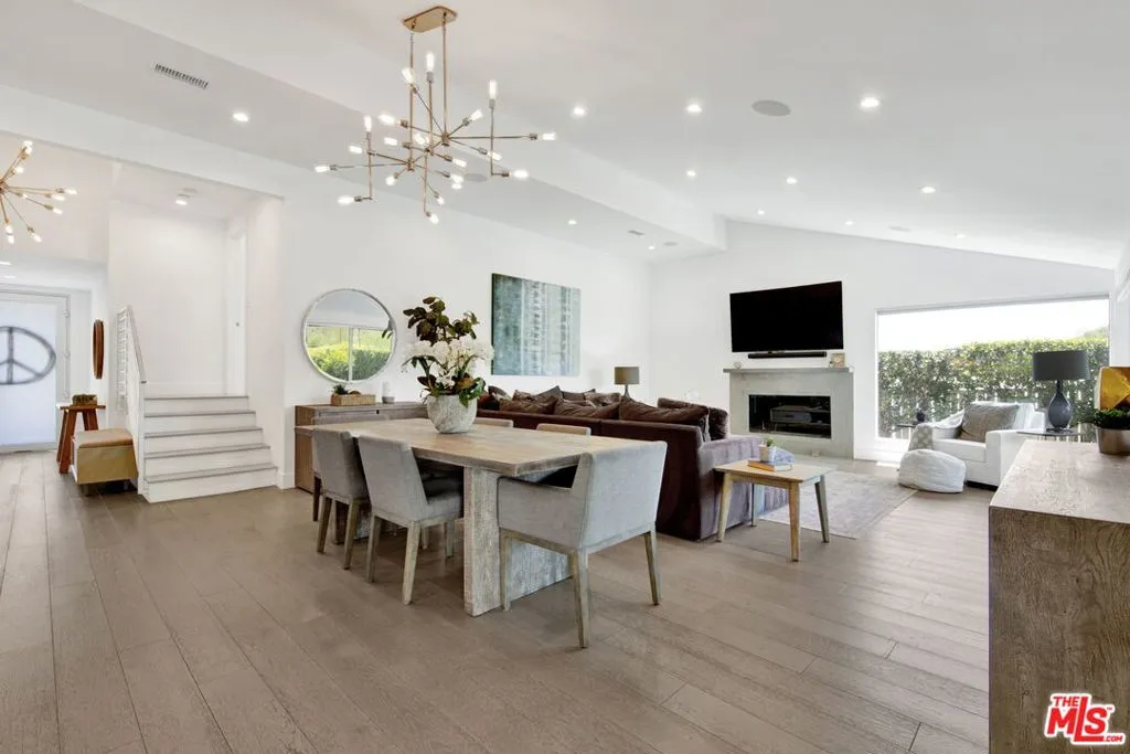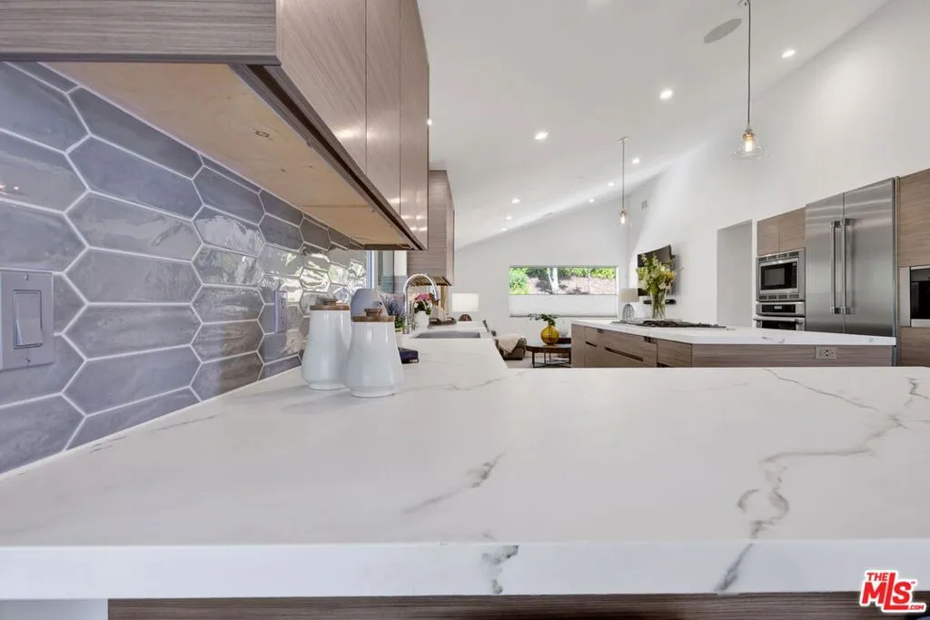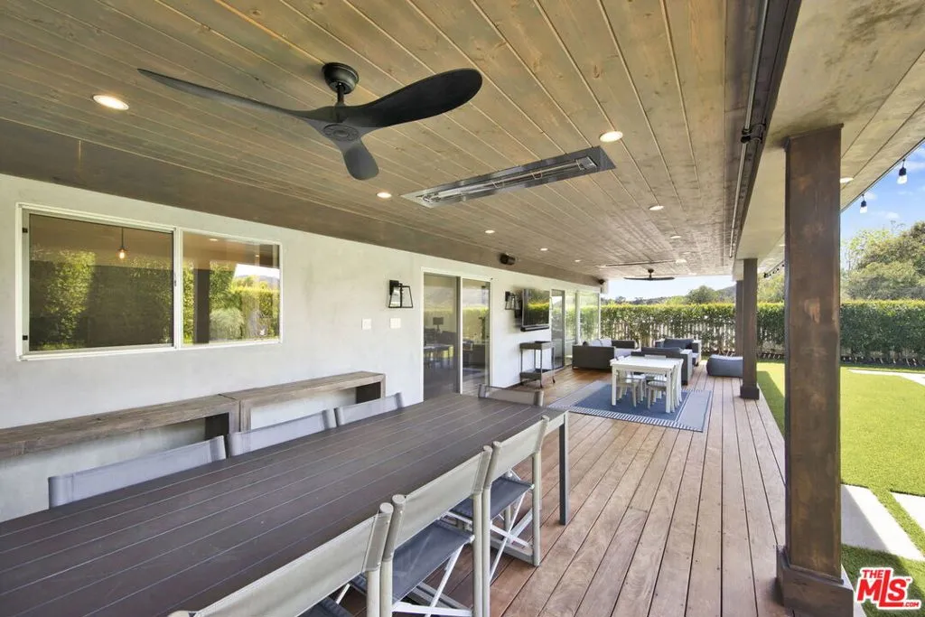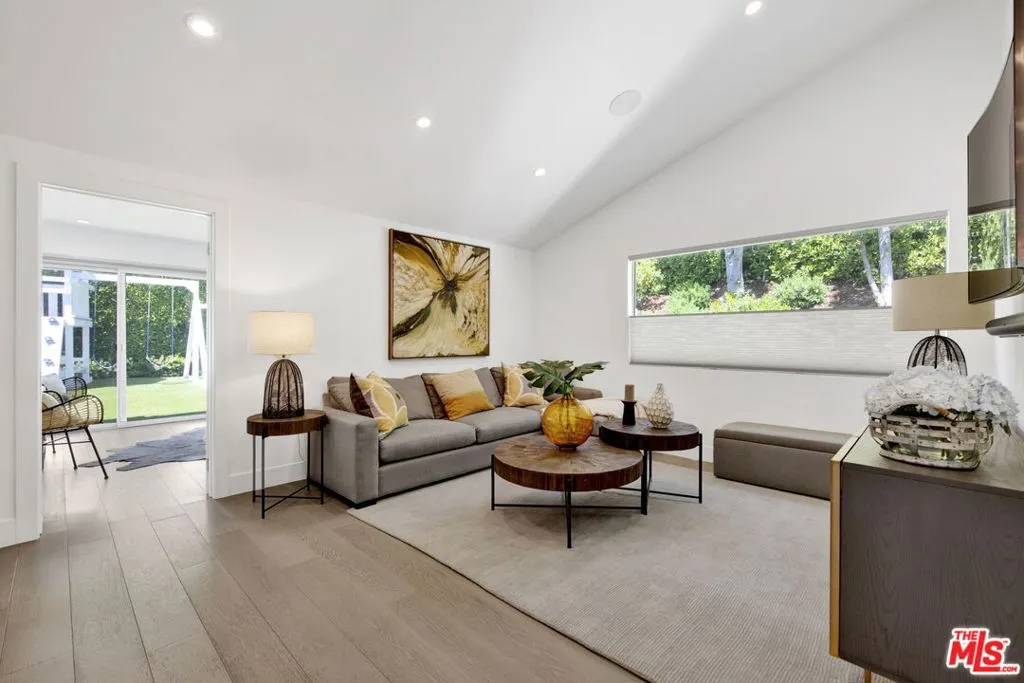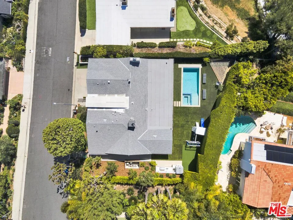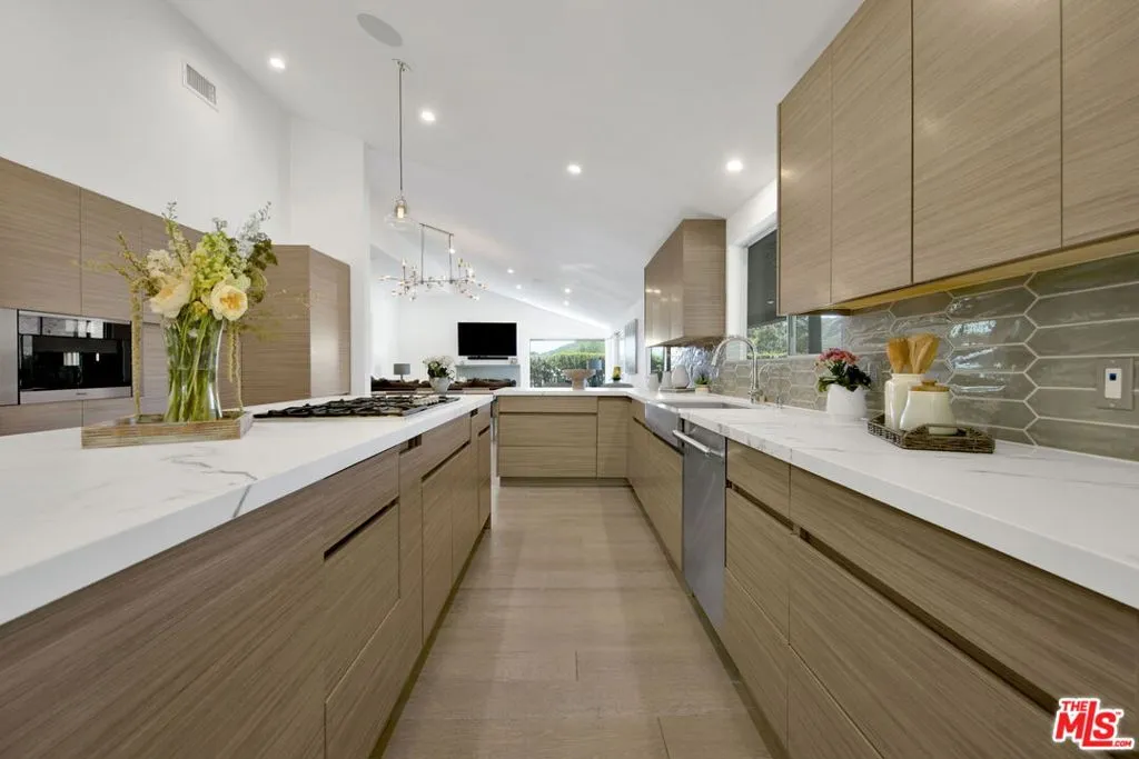 Beautifully remodeled with breathtaking canyon and mountain views, this 5BD/4BA canyon retreat blends timeless design with modern living. Vaulted ceilings, hardwood floors, and walls of glass fill the home with natural light and showcase sweeping vistas. The chef's kitchen features a center island, custom cabinetry, and stainless steel appliances, opening to a spacious family room ideal for entertaining. The dining area flows seamlessly to a resort-style backyard featuring a pool with built-in spa, custom outdoor kitchen with wood-fired pizza oven, built-in BBQ, and beverage refrigerators. Designed for both entertaining and play, the yard also includes a children's play structure with swings, monkey bars, slide, and a sportscourt. A covered outdoor patio with heaters features a full dining table, fire pit, and lounge seating. The upstairs primary suite offers a peaceful retreat with a beautifully updated bath and dual closets. Additional bedrooms on the main level provide flexibility for family, guests or office use. 3000 sq ft of living space set on approximately 10,000 sq ft lot in the tranquil hills of Brentwood. Also available for lease $22,500 per month.