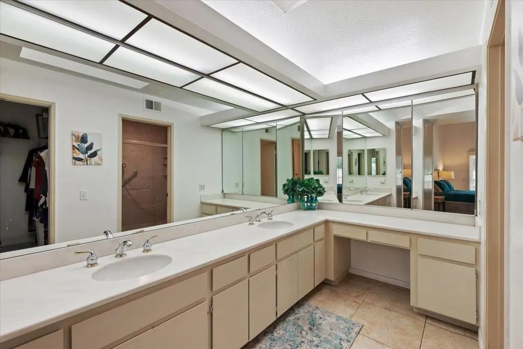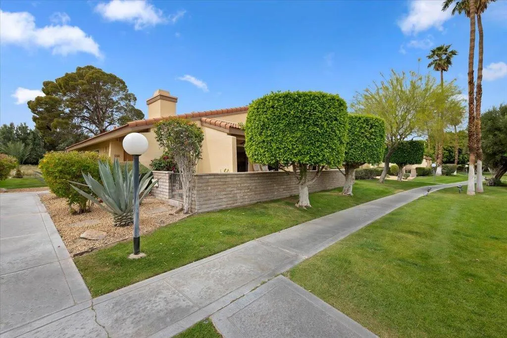 Surround yourself in a Villa-like setting in a highly-desirable 3BD 2BA condo at securely gated Palm Springs Country Club. This one-of-a-kind unit is within the community designed by famous architect William F. Cody when Palm Springs Country Club was home to the Rat Pack golfers. It is one of the largest in the community at nearly 1700 square feet. Four extra large patio doors to the extended front and back decks let in maximum light, but plantation shutters keep the summer heat at bay. Vaulted Ceilings, skylights, and only one shared sound-proofed wall make this this home luxurious. Step out the patio doors from either of the 2 primary bedrooms to the back deck to view Mount San Jacinto. The blue lights at the top of the Tram are visible at night while having cocktails in the back. The bright skylight in the extra large remodeled kitchen makes cooking a dream. The master bathroom walk-in shower was remodeled and extended with built-in seating. It is large enough to accommodate special needs. Relax in either of 2 spas or the sparkling seasonal pool in close walking distance. This has been a successful seasonal rental for the current owners, and also an enjoyable second home.
