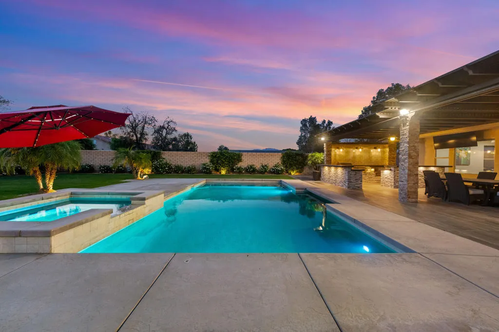 Beautiful Stonegate property in Bermuda Dunes! From the moment you walk up the front path to the front door, this impressive home will excite you. Designed for comfort, style, and incredible entertaining, this property truly merges indoor and outdoor living in the best way. The massive backyard is a showstopper, featuring a sparkling pool, relaxing spa, underwater bar stools, lush palm trees, beautiful landscaping, and mountain views. Sliding doors open wide so the outside flows seamlessly inside, creating the perfect setting for gatherings large or small. Inside, the heart of the home is the spacious great room kitchen with a large center island, 5-burner stove, stainless steel appliances, and a buffet counter ready for entertaining. And the outdoor kitchen is just as impressive, featuring a grill, griddle, burner, built-in ice chest, awning,refrigerator, large screen TV, and sunshades that provide comfort and shade while offering an incredible space for hosting family and friends. The private casita has its own entrance, making it ideal for guests who want privacy and comfort. There is also a separate lounging room with two additional bedrooms, giving everyone room to spread out. Whether you need space for extended family, a playroom, an office, or even another bedroom, this floor plan offers so many opportunities. The primary suite is a dream, complete with an amazing custom closet featuring drawers, pull-outs, lighting, and abundant space. The spa-like bath includes a deep jetted tub, walk-in shower, and separate vanities. And let's not forget the 3-car garage, immaculate and beautifully finished with slurry-coated floors, so pristine you could practically perform surgery in there. This Stonegate beauty offers luxury, flexibility, and fabulous entertaining space all in one gorgeous Bermuda Dunes property.