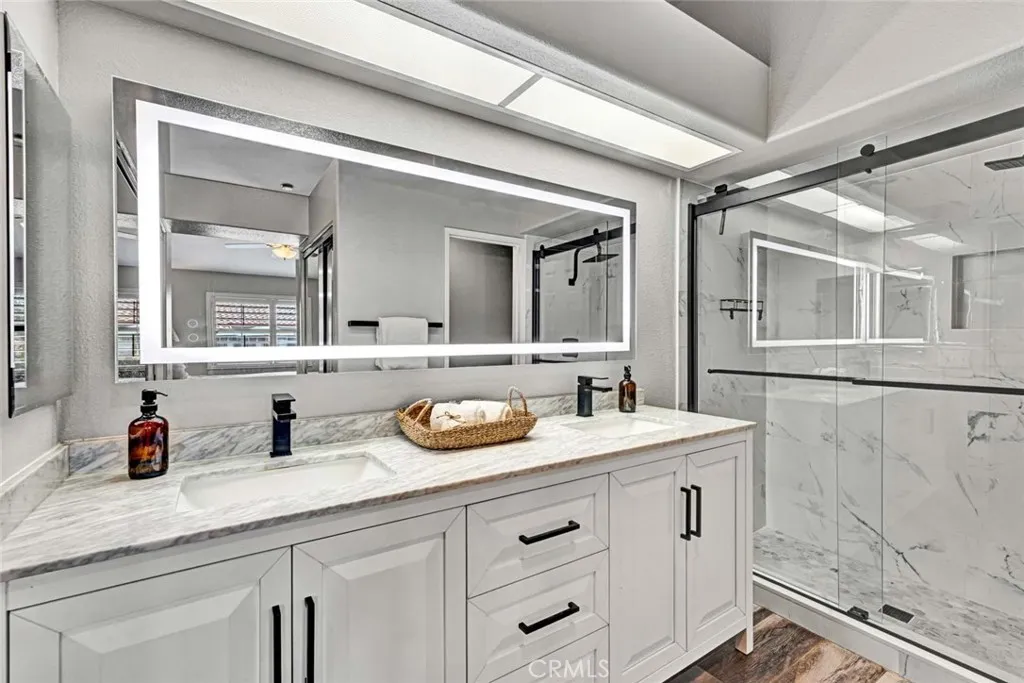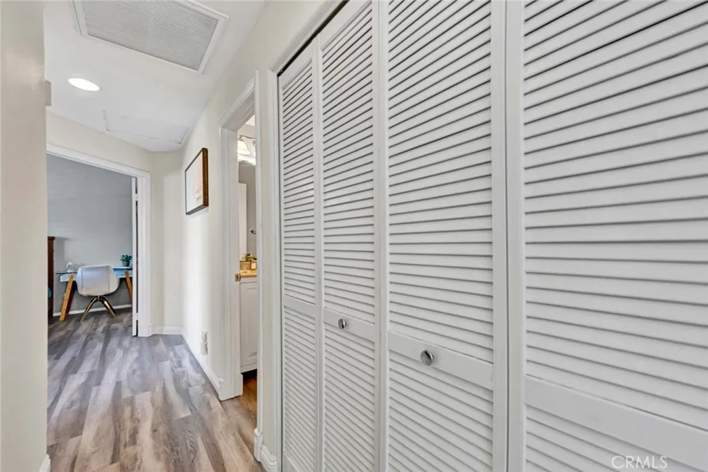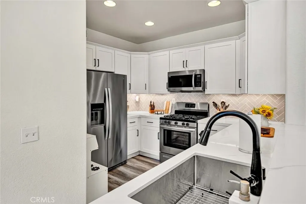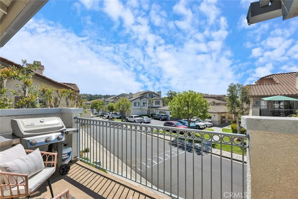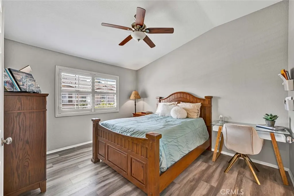 Beautifully remodeled upper end-unit in the highly desirable gated community of Viewpointe North. This light and bright 2 bedroom, 2 bath condo features vaulted ceilings, wood laminate flooring, and plantation shutters throughout. The remodeled kitchen offers white cabinetry with soft-close cabinets and drawers, quartz countertops, stainless steel appliances, and recessed lighting. The inviting living room features a remodeled fireplace and sliding glass door leading to a private balcony, while the adjacent dining area includes a charming window seat and ceiling fan. Additional features include an inside laundry closet for full-size washer and dryer, updated guest bath, spacious primary suite with double-door entry, two mirrored closets, and remodeled en-suite bath with walk-in shower, dual sinks, quartz countertops, and separate privacy toilet area. Secondary bedroom is generously sized with plantation shutters and ceiling fan. Complete with a one-car attached garage with direct access and an additional covered carport. Viewpointe North offers resort-style amenities including two pools, five spas, clubhouse, two gated entrances, mature trees, and lush greenbelts throughout the community.
