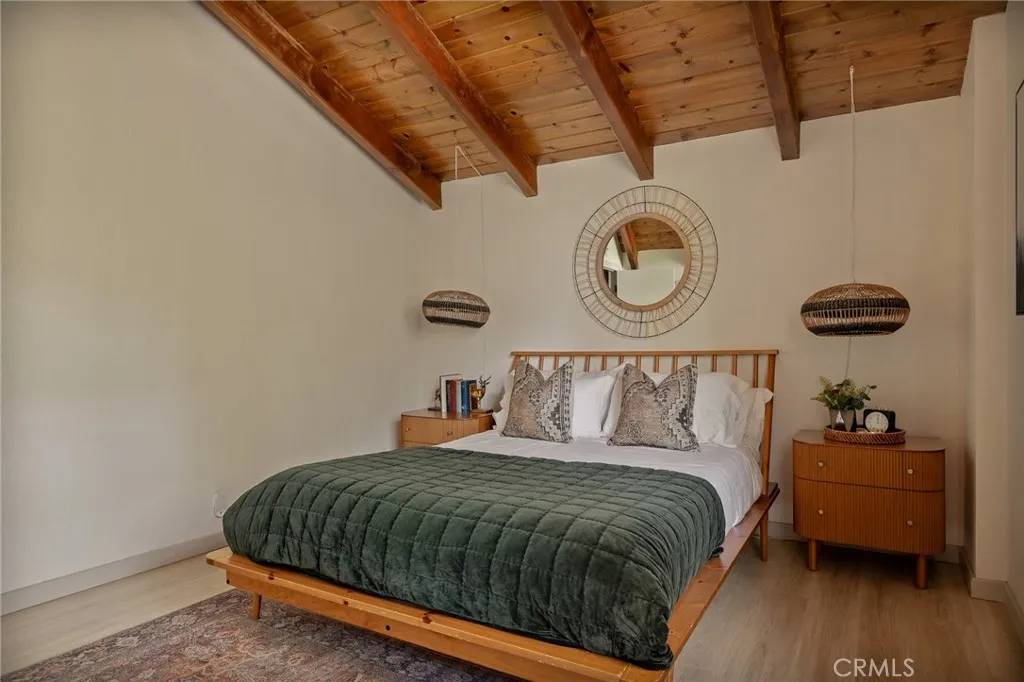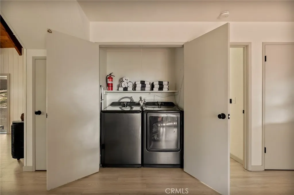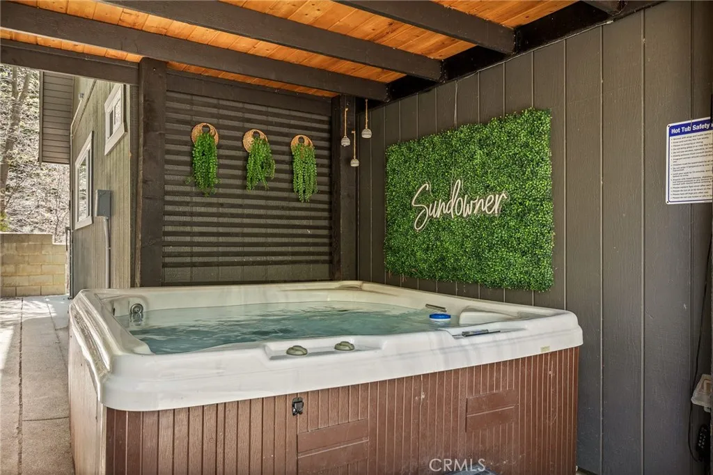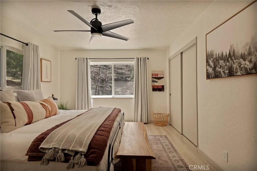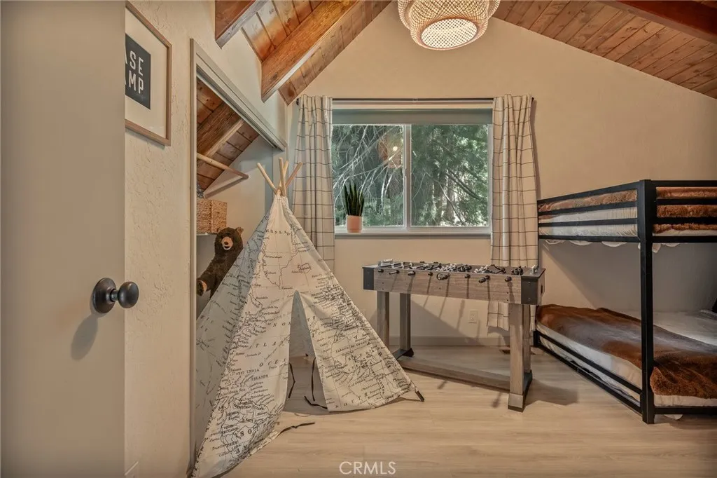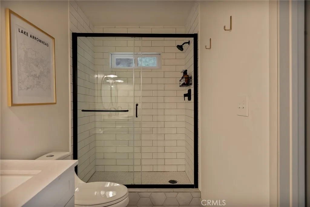 Perched up on the hillside you will find this stunning remodeled home located close to the Lake Arrowhead Village and Hwy 18. Enter in to this stunning high vaulted ceiling open floor concept home with primary bedroom on the main. Home was remodeled in 2020 and boasts an equipped kitchen with Calacatta Quartz counters, black stainless appliances, and a sliding glass door that leads to the expanded front near wrap around deck. The main living room boasts a large rock wall that exudes the focal point of the room. The back area has a covered private spa area that allows you to take in the mountain surroundings. Upstairs is 2 more bedrooms with high ceilings, and a bath. Home has been a successful Airbnb and has been used for multiple catalog branding shoots. Home has been updated with Dual Pane windows, and Pergo WetProtect flooring along with a curated style to exude the current trend. Home comes furnished and is located in Lake Rights. You will find lots of privacy on this lot, tucked in with the cedars, oaks, and dogwoods. Don't let this one pass you up.