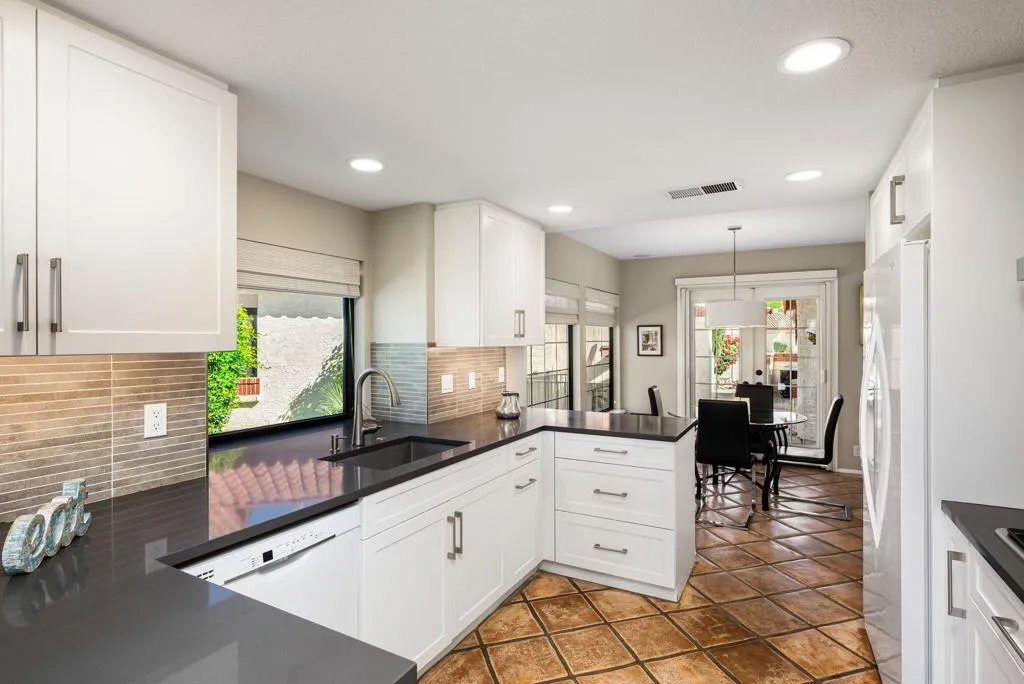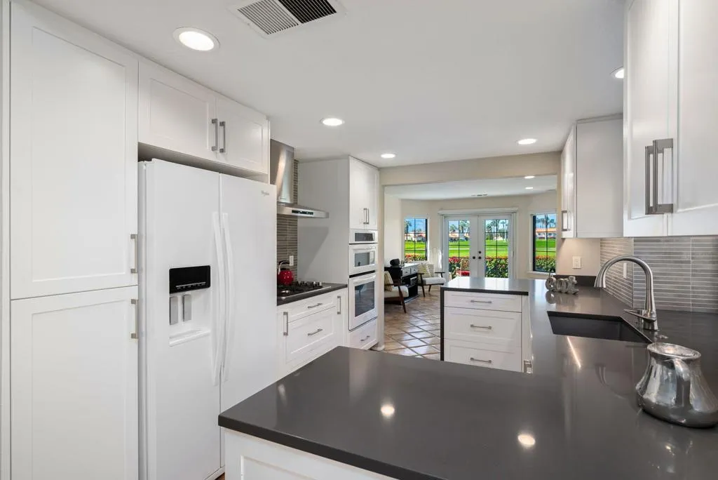 One-of-a-kind opportunity on highly desirable Avellino Circle in guard-gated Desert Falls Country Club, featuring breathtaking 180 views over shimmering water, multiple golf course fairways, and dramatic mountain backdrops. This single-level condo offers 2 bedrooms and 2 baths and has been updated for effortless desert living and entertaining.The remodeled kitchen with an eat-in nook is designed to gather--featuring a gas cooktop, gray quartz countertops, white cabinetry, beverage fridge, and a peninsula with bar-height dining for casual meals and hosting. Both bathrooms have been beautifully remodeled with floor-to-ceiling tiled showers, quartz countertops, and newer cabinetry; the primary bath includes a walk-in shower.Outdoor spaces are equally inviting: a gated, tiled front courtyard wraps around to an expanded back patio, creating multiple places to relax and enjoy the scenery. French doors from both the living area and family room enhance the indoor-outdoor flow and bring the views front and center.A rare view setting in one of Palm Desert's most sought-after communities--minutes to El Paseo's renowned dining and shopping, and Acrisure Arena. Located mid-valley close to fine dining, groceries, and retail. Desert Falls Country Club is privately owned and offers pay-as-you-play and membership options. Don't miss this special home.