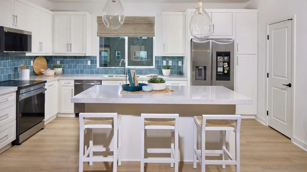 This home is a former model with an upgraded backsplash and upgraded flooring, is ready for moving in. This new three-story townhome features a bedroom with an en-suite bathroom on the first floor. On the second floor, an open-concept layout combines the kitchen with the living and dining areas, and a deck offers convenient outdoor access. Three bedrooms can be found on the top floor, including the luxe owner’s suite, complete with a private bathroom and walk-in closet. A two-bay garage completes the home. The Trails is a brand-new masterplan with single-family and attached homes in Carmel Mountain Ranch, San Diego, CA. Five communities of attached homes now selling! Lavender is a collection of brand-new townhomes for sale within The Trails masterplan in San Diego, CA. Residents enjoy a great central location and easy access to I-15 and 56 freeways for simplified commutes and getting around. The community is conveniently close to shopping at Carmel Mountain Ranch and UTC, 4S Ranch, Del Sur and more. Students will attend schools within the Poway School District.