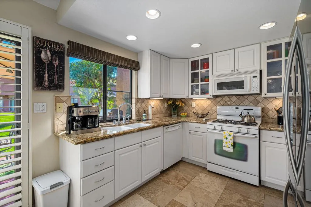 Welcome to this 1,139 sq. ft., 2-bedroom, 2-bath condo, offering a thoughtful blend of style, functionality, and value in the desirable Oasis Country Club. The private entry courtyard sets the tone with a calm, inviting space, perfect for morning coffee or evening relaxation. As you step inside, the bright living room welcomes you with vaulted ceilings, a cozy fireplace, and abundant natural light that enhances the open, airy atmosphere. Just beyond, the updated kitchen connects seamlessly to the dining area, where sliding doors open to lush green common area, your private patio, and a BBQ, creating an effortless indoor-outdoor living experience.Thoughtfully designed, the main level also features a spacious guest bedroom off the foyer, complete with sliding access to the shared patio. This flexible space works beautifully for visitors, a home office, or a quiet retreat. A full bathroom and conveniently located laundry closet complete the first floor.Upstairs, the private primary suite serves as your personal sanctuary. Step onto the balcony to unwind and take in the stunning desert sunsets that define desert living.For added convenience, this condo includes an attached garage.Oasis Country Club offers an exceptional lifestyle filled with resort-style amenities and breathtaking surroundings. Residents enjoy an 18-hole golf course with 22 sparkling lakes, multiple pools and spas, pickleball and tennis courts, a putting course, and a variety of fitness and social activities. The community also features convenient on-site dining at the newly renovated Grille, a dog park, card room, lending library, and beautifully maintained grounds framed by mountain and fairway views. For homeowners, Oasis Country Club delivers not only comfort and recreation, but a vibrant, welcoming community that feels like a true desert retreat.Oasis Country Club isn't just a place to live, it's a lifestyle. Come tour this desert gem and experience why so many are proud to call it home.