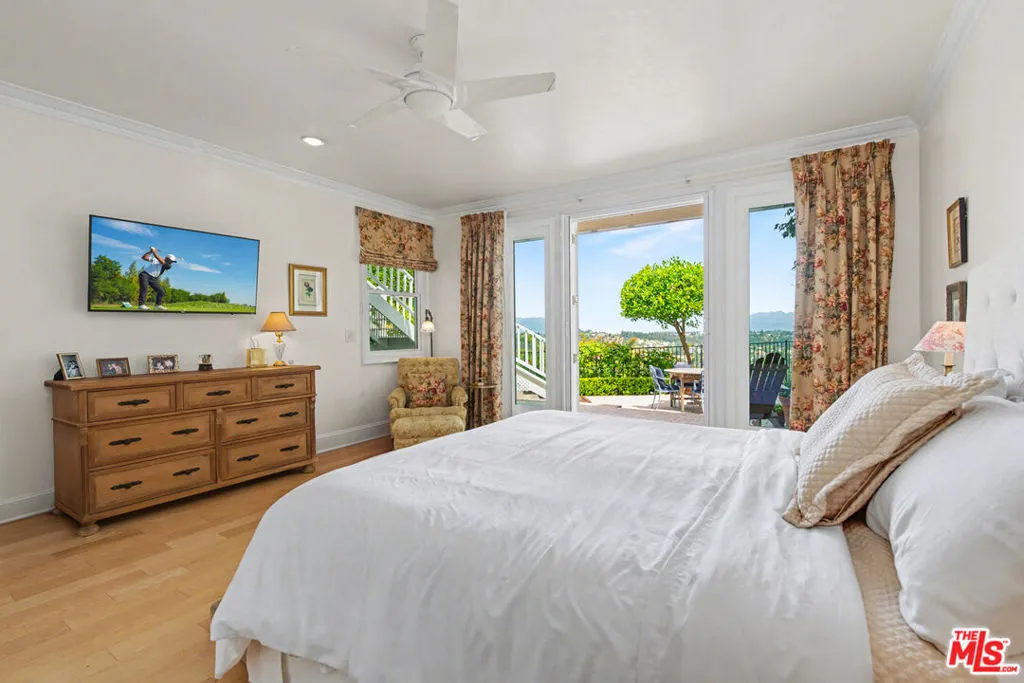 24-hour guard-gated security, a premiere golf course location and breathtaking 180' views set the stage for this exceptional Mountaingate townhome in Brentwood. Overlooking lush green fairways, sparkling city lights, and majestic mountain vistas, this apprx 2,750 sqft residence featuring 2 BR, 2.50 BA + DEN offers one of the most desirable and quiet locations in the community. Privately sited on a cul-de-sac, this rare offering combines charm, privacy, and abundant natural light. Bright and inviting, the warm dramatic interior is enhanced with soaring double-height ceilings, crown moldings, custom bookcases, built-ins, and rich wood floors throughout. Lovingly maintained, impeccable move-in condition with new French doors, new windows, and numerous updates throughout. An expansive living room provides the perfect setting for both relaxed living and entertaining, while the formal dining room accommodates large gatherings with ease and flexibility. The well-designed remodeled chef's kitchen overlooks scenic views and features top-grade appliances, generous storage, ample prep space, high ceilings, and a sunlit breakfast area. A very spacious den overlooks treetops and offers versatility as a home office, comfortable TV room, or potential third bedroom. The garden-side primary suite is a peaceful retreat opening to the backyard and includes a luxurious remodeled bath w/heated floors and ample closet spaces. An oversized secondary suite also opens directly to the yard. Enjoy al fresco dining and relaxation from your private veranda overlooking forever views and enjoy the low-maintenance backyard with its pretty gardens and patio spaces, all set against a backdrop of sweeping views creating seamless indoor-outdoor living. Mountaingate is well-known for its on-site 24HR Security with hourly roving patrol, beautifully maintained grounds, and access to scenic hiking trails in the Santa Monica Mountains. The Vista Townhomes, an intimate enclave of just 19 residences offer a rare combination of privacy and resort-style living. HOA dues include exterior fire and earthquake insurance, roof coverage, exterior paint maintenance, community pool and spa, a dog park, trash-can services, and lush, meticulously maintained landscaping creating a setting that truly lives like a private resort. The renowned Mountaingate Country Club offers optional golf, tennis, and social memberships, plus a fabulous restaurant for members. Ideally located near Brentwood's premier dining and shopping, with convenient access to the 405 freeway and close proximity to LAX, UCLA and USC. An extraordinary Westside value, offering a rare combination of security, scale, views, and amenities - the ambiance is nothing short of breathtaking! Please see agent for dog breed restrictions. The Den has potential to be converted to a 3rd bedroom. Easy to show - Call today and don't delay!