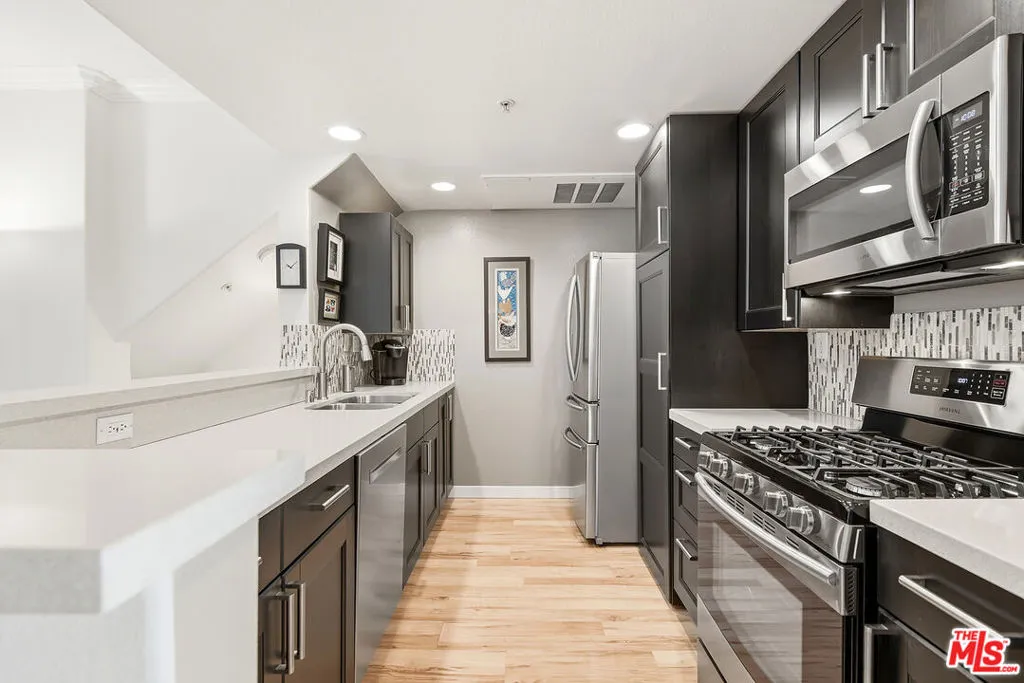 Welcome to this beautifully remodeled one-bedroom end-unit townhome nestled in the sought-after Bella Montagna community, where comfort meets resort-style living. Ideally located in the foothills just south of Ventura Boulevard, this serene and stylish home greets you with a private patio and a bright, open-concept living space designed for both relaxation and entertaining. The modern kitchen shines with quartz countertops, a designer tile backsplash, custom cabinetry, and stainless steel appliances, perfectly blending form and function. Throughout the home, light-filled interiors and sleek laminate flooring create a warm, contemporary feel. The spacious en-suite bedroom offers generous storage and features a charming Juliet balcony that invites in natural light and fresh air. Additional highlights include a direct-access one-car garage, extra storage, and a convenient downstairs laundry area with a side-by-side washer and dryer. Bella Montagna offers beautifully maintained grounds and an impressive array of amenities, including scenic walking trails, a basketball court, resort-style pool and spa, fitness center, BBQ areas, and a private theater room in the clubhouse. With gated entry, ample guest parking, and close proximity to shopping, dining, and freeway access, this home delivers the perfect balance of tranquility and convenience.