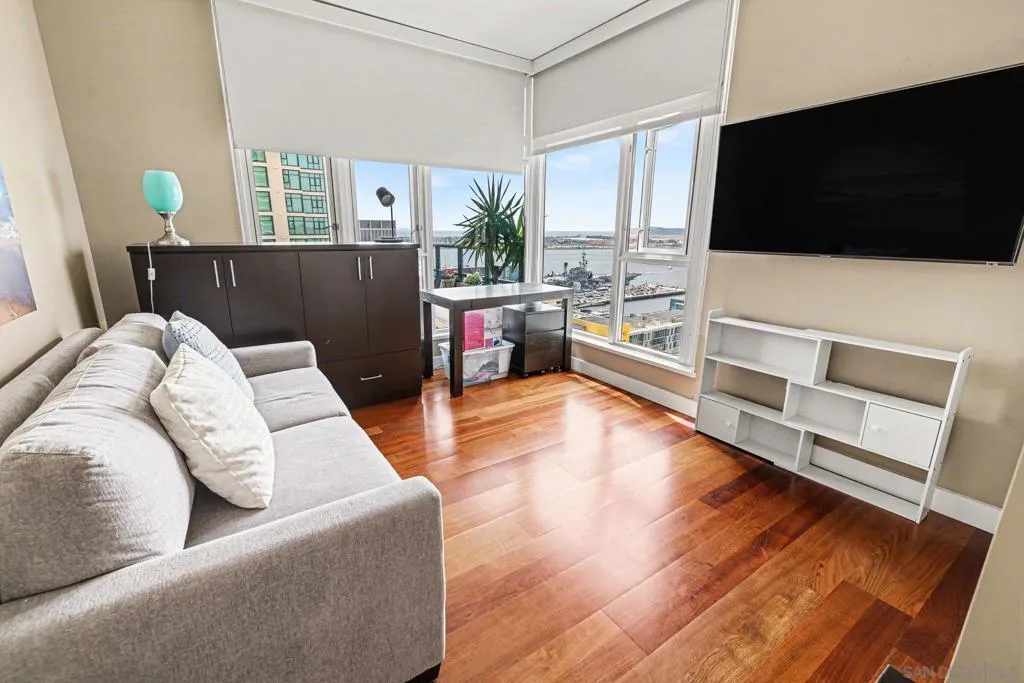 Perched on the 29th floor of The Grande North, this stunning 2-bedroom + den, 2-bath residence offers breathtaking panoramic views of the San Diego Bay, Pacific Ocean, and city skyline. Floor-to-ceiling windows flood the home with natural light, seamlessly blending indoor and outdoor living. The spacious open-concept layout features a modern kitchen with high-end appliances, quartz countertops, and ample cabinetry. The versatile den is ideal for a home office or optional third bedroom. The primary suite offers a spa-inspired bathroom and generous closet space. Enjoy resort-style living with 24-hour concierge, pool, spa, fitness center, sauna, and guest suite. Located in the highly sought-after Columbia District, just steps from the waterfront, Little Italy, dining, and entertainment. Includes two assigned parking spaces and in-unit laundry.