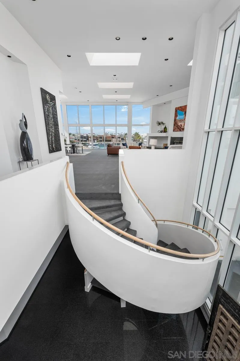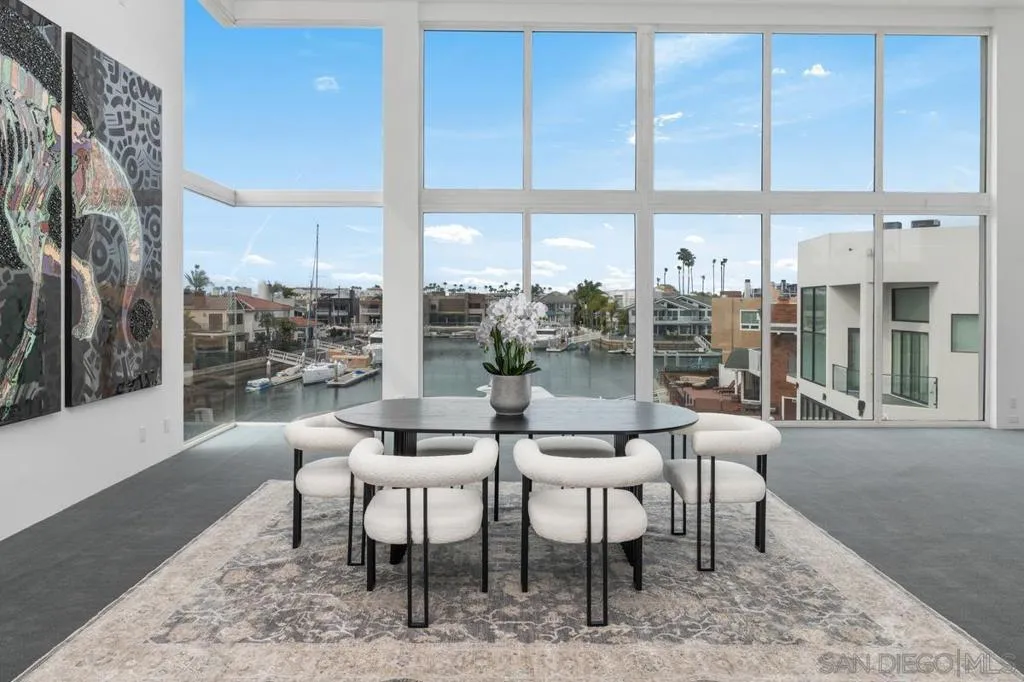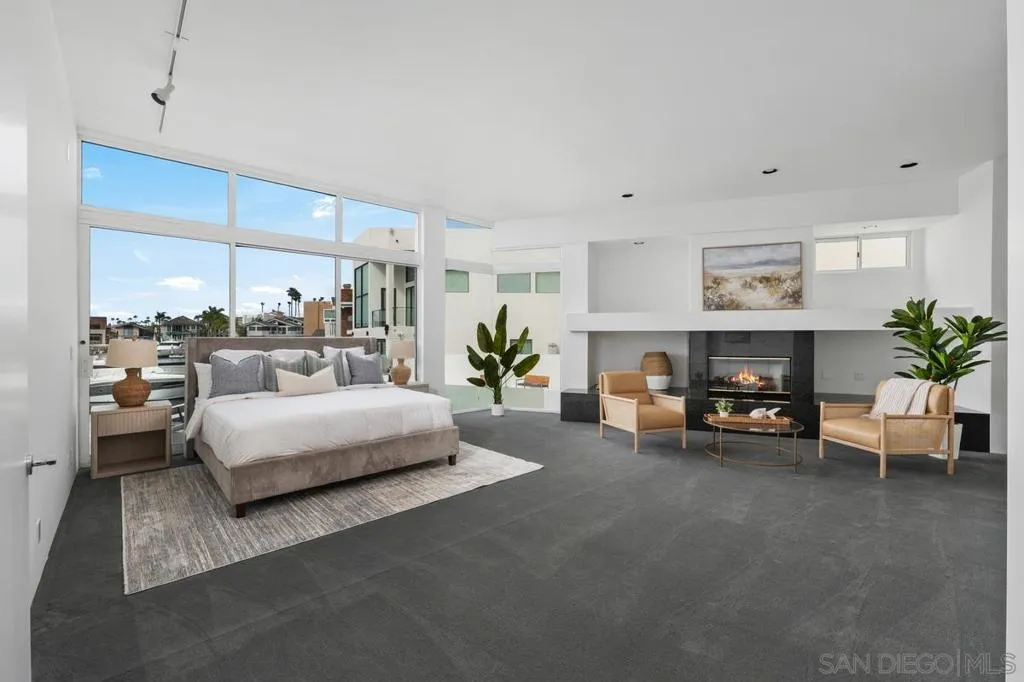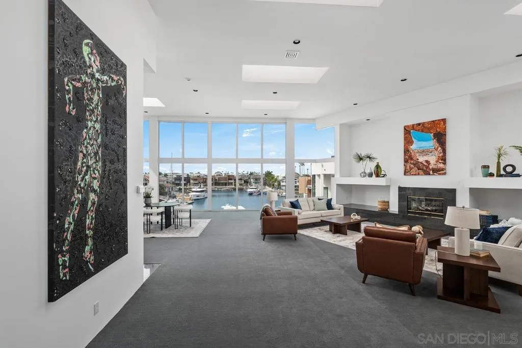 Soaring 33 feet, this custom waterfront residence with prime dock space features rare architecture predating current HOA limits, offering a scale and grandeur that cannot be replicated today. A striking white modern facade creates distinct curb appeal. A true entertainer's paradise, the layout flows effortlessly across all levels. Level one features four en-suite bedrooms, including a primary suite with a spa bath, walk-in closet and a grand fireplace. The second floor boasts a massive, open-concept layout with 21-foot ceilings, floor-to-ceiling windows framing tranquil waterway views, two expansive living areas, dining, a gourmet kitchen and a full bath. At the top, the expansive Rooftop Lounge, encased in glass railings, treats you to 360-degree panoramic views of the bay, ocean, skyline, and mountains. It is the ultimate private setting for spectacular sunsets and the annual Big Bay Boom fireworks. Step outside to dock space accommodating up to a 45-foot vessel for immediate deep-water bay access. Below lies one of the home's most coveted features: a rare subterranean garage with 10-foot ceilings, secure parking for 6+ vehicles (ideal for collectors), a dedicated wine cellar, a workshop, and large storage rooms. Boasting phenomenal light-filled spaces, this architectural masterpiece offers a rare opportunity to elegantly personalize a legacy property. Embrace the unparalleled Coronado Cays lifestyle, featuring 24/7 security, resort amenities, tennis, pristine parks, Silver Strand beach access, and effortless waterfront living.