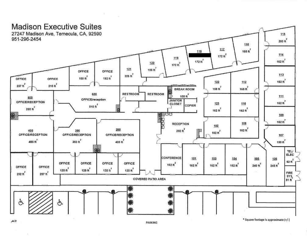 Looking for a professional office space but don't want the overhead? Then please consider Madison Executive Suites --Temecula's premier commercial location for professionals. Each individual suite includes access to the conference room, lunch room, copy room, and a receptionist desk that is staffed Monday - Friday from 9:00 to 4:00. Ample parking. Easy freeway access off the 15 & Winchester. Very easy to find (across the street from Boot Barn). Please click on the arrows for more photos, and stop by for a tour today!