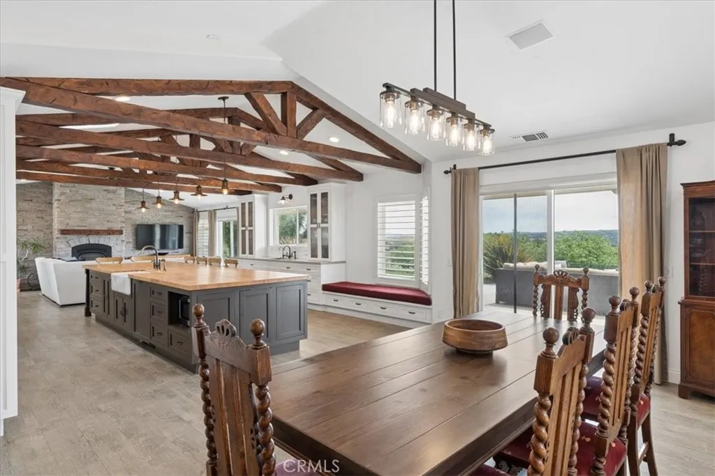 Stunning panoramic views and refined country living define this exceptional single-level estate on a picturesque 10+ acre hilltop parcel just minutes east of Paso Robles. The open-concept ranch-style home is designed for comfort and entertaining, with the living room, dining area, and kitchen flowing seamlessly together around a striking custom 20-foot island. The kitchen is further enhanced by a Viking range, while a wood-burning fireplace adds warmth and charm to the living room. Expansive windows frame the surrounding landscape and capture breathtaking views from nearly every room. The spacious floorplan includes three bedrooms, an office, bonus room, and large walk-in pantry/storage room. An attached three-car garage and substantial detached shop offer exceptional space for vehicles, equipment, hobbies, or agricultural use, with the shop featuring two roll-up doors, a large workroom, half bath, and walk-in cooler. Approximately six acres of mature organic pistachio trees create privacy and a beautiful setting. Owned solar, pipe fencing, and gated entry complete this remarkable Paso Robles area property.