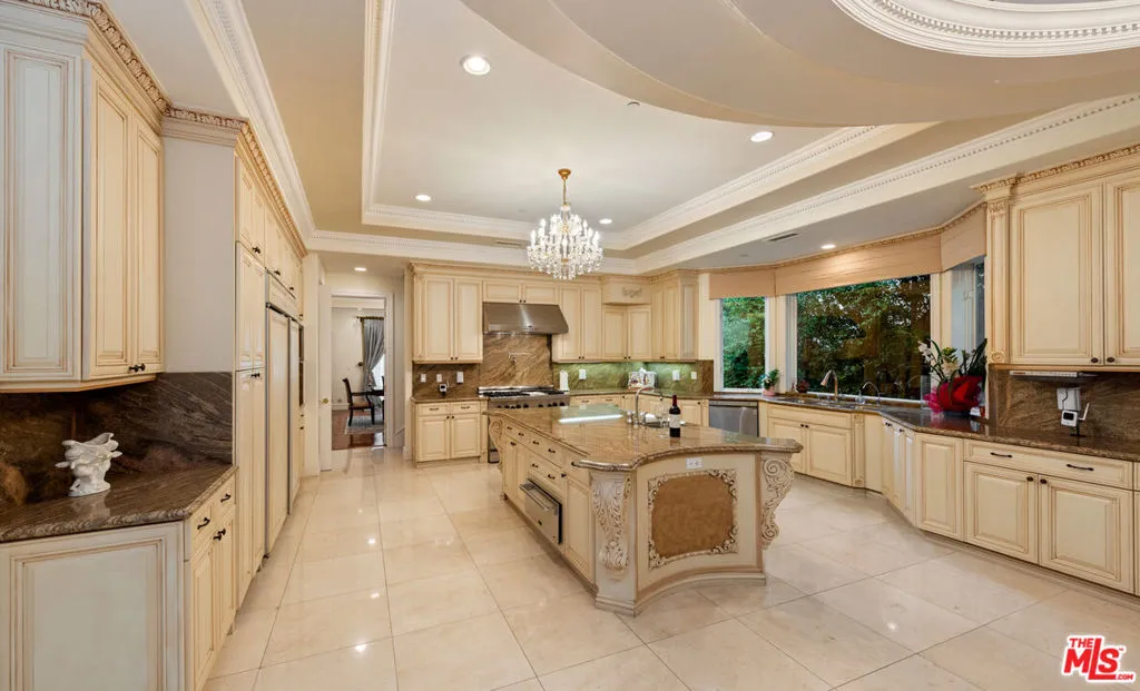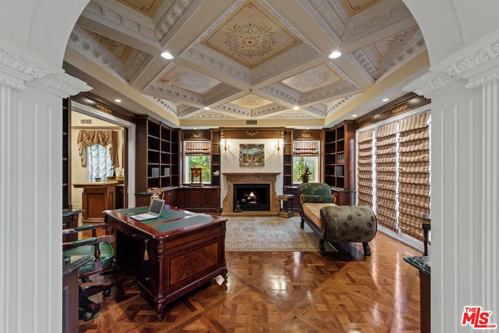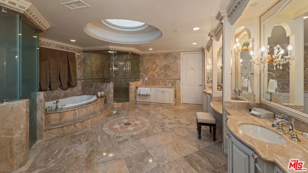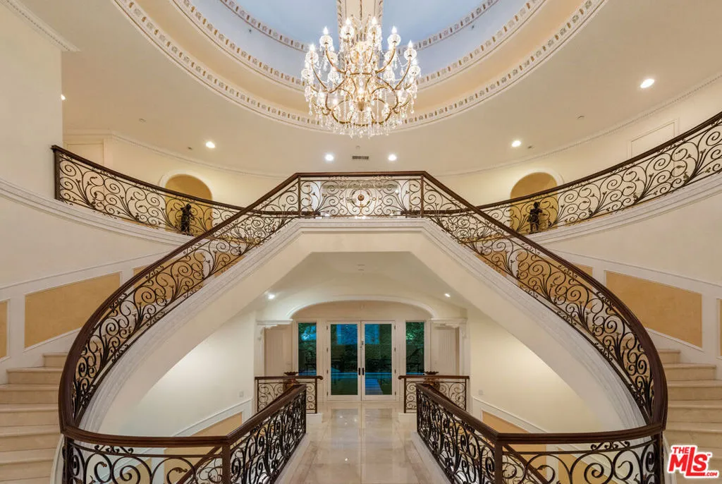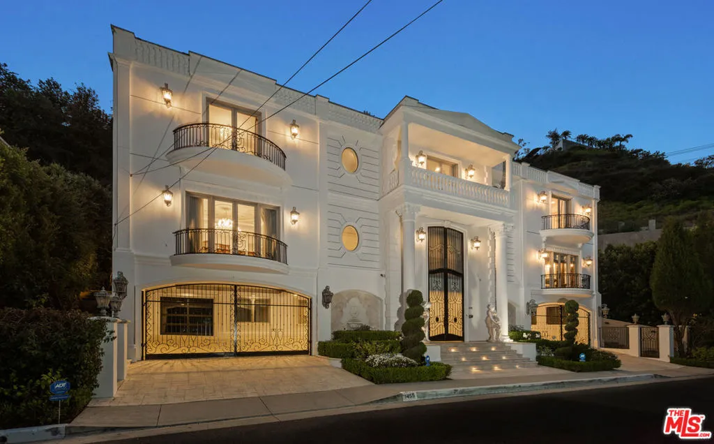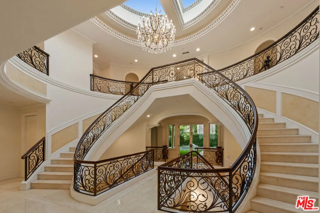 Available furnished and turnkey for long term or multi-month lease. Welcome to a world of timeless grandeur and refined elegance in this spectacular French Colonial estate, originally envisioned to host diplomats and royalty with the utmost discretion and comfort. Nestled on prestigious Robmar Drive, just moments from the pulse of Beverly Hills and iconic Rodeo Drive, this palatial residence offers an unmatched lifestyle of luxury and sophistication. With 5 bedrooms and 8 bathrooms, the home welcomes you with a dramatic double-height foyer, where sweeping twin staircases with ornate wrought-iron railings ascend beneath a magnificent chandelier. The main level is anchored by a lavish great room perfect for entertaining on any scale. The gourmet kitchen is a chef's dream, complete with sculpted marble countertops and a charming breakfast nook. Adjacent, the formal dining room is accented by a hand carved marble fireplace, while the family room offers a warm ambiance with a custom hardwood entertainment center and additional fireplace. The stately library impresses with a richly detailed coffered ceiling, fireplace, and custom-built bookshelves and cabinetry. Upstairs, the expansive primary suite is a true sanctuary, boasting both a luxurious sleeping chamber and an elegant sitting room each with its own fireplace. The oversized walk-in closet features custom hardwood cabinetry and a central island, while the spa-like primary bathroom includes dual vanities, dual showers, a soaking tub, and exquisite inlaid marble flooring. Three additional en suite guest bedrooms offer comfort and privacy for family and visitors alike. Thoughtfully designed for both beauty and functionality, the home is served by an elevator and adorned with polished marble and inlaid hardwood flooring, hand-painted ceilings, charming chandeliers, French doors, balconies, and opulent window treatments throughout. Outdoors, a serene private patio leads to a lush lawn, sparkling pool, and relaxing spa, all set against a terraced hillside of mature landscaping with fruit trees. The lower level completes the estate with a state-of-the-art gym, a professional-grade screening room, and a crescent-shaped, dual-gated motor court for secure, stylish arrivals. Meticulously maintained, this architectural masterpiece is a rare offering providing privacy, prestige, and proximity to the best shopping, dining, and entertainment in the world-renowned city of Beverly Hills.