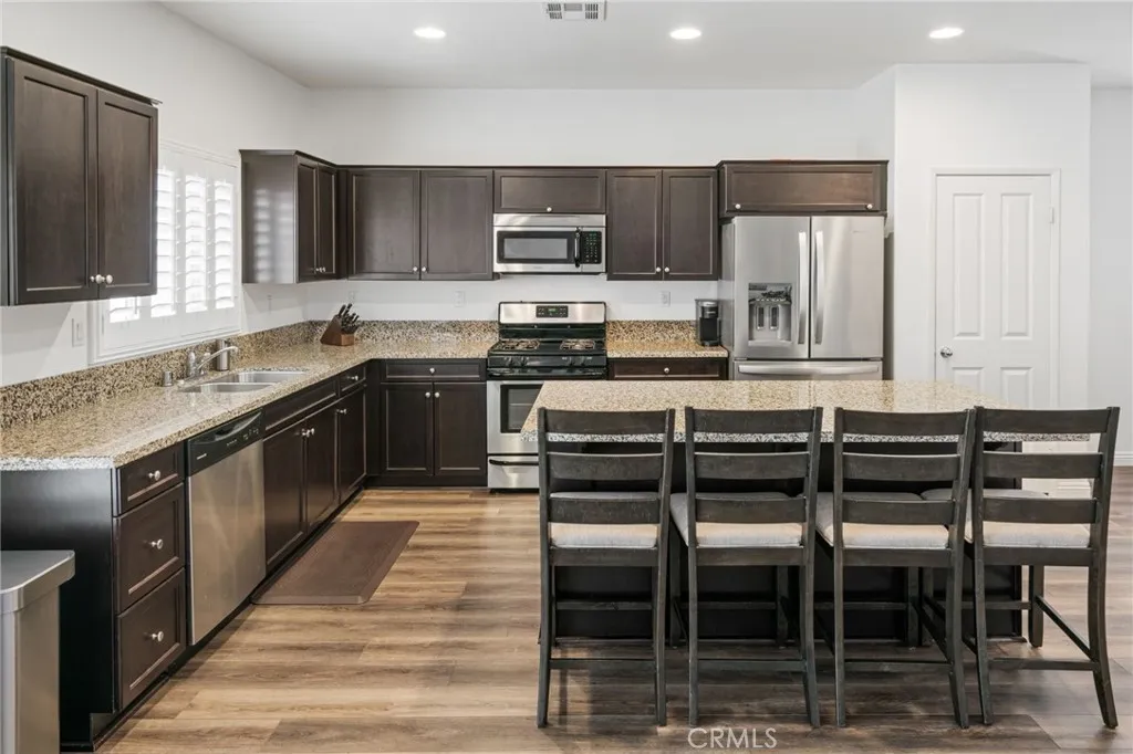 Beautiful 4 bedroom, 3 bathroom home in the Bella Strada community of Fontana. Built in 2017, this spacious two story home offers approximately 2,760 square feet with a highly functional open floor plan. The main level features a downstairs bedroom and full bathroom, ideal for guests, multigenerational living, or a home office. The kitchen opens to the dining area and large family room and includes granite countertops, a large center island with seating, dark wood cabinetry, stainless steel appliances, a gas range, built-in microwave, and walk-in pantry. Upstairs features a large loft, spacious secondary bedrooms, convenient laundry room, and an oversized primary suite with dual walk-in closets and an ensuite bath with dual sinks and a large glass-enclosed shower. Additional highlights include luxury vinyl flooring throughout, new baseboards throughout, plantation shutters, and recessed lighting. The backyard is designed for low maintenance with extensive concrete hardscape, a long covered pergola patio, side yard space, raised planter beds, block wall fencing, and a storage shed. Bella Strada HOA amenities include a pool, park, and playground.