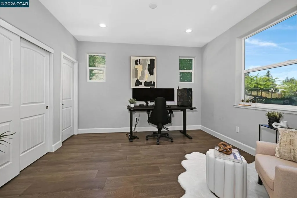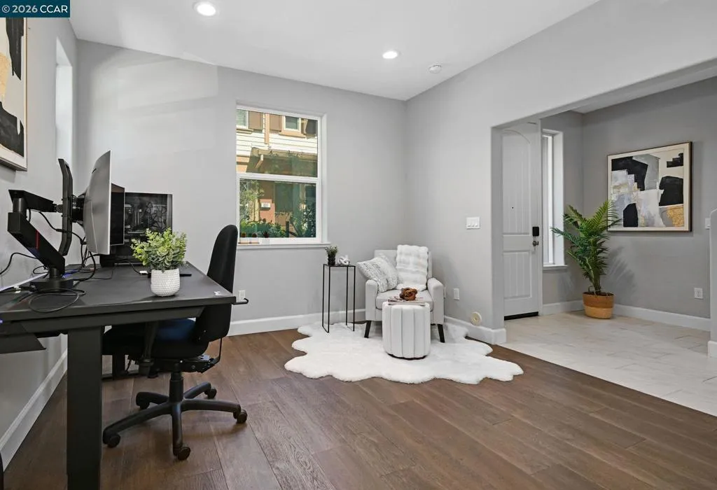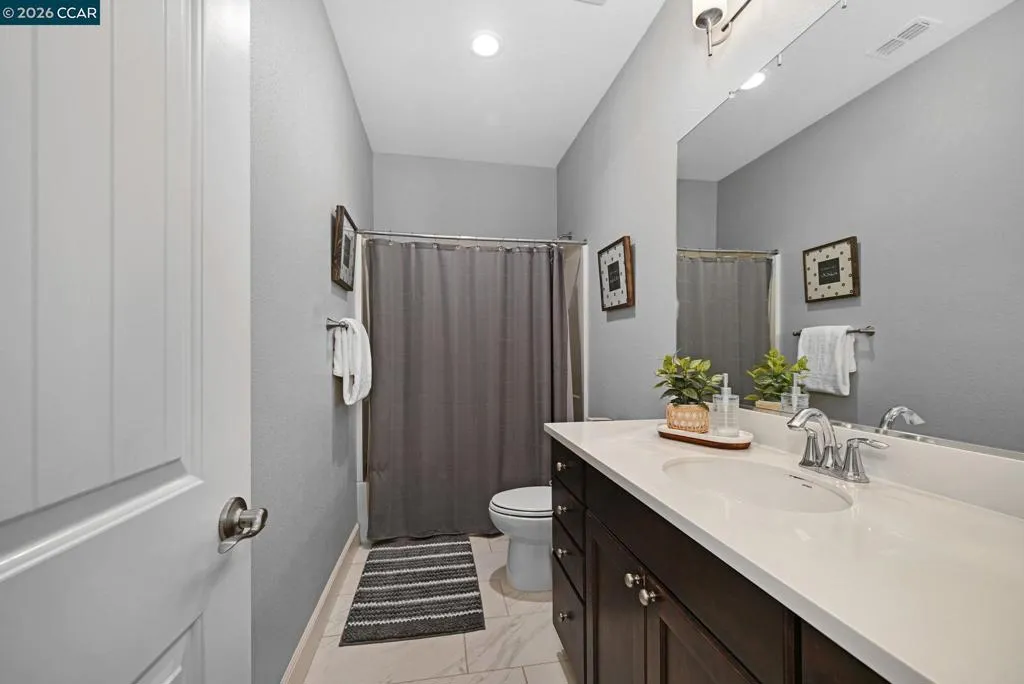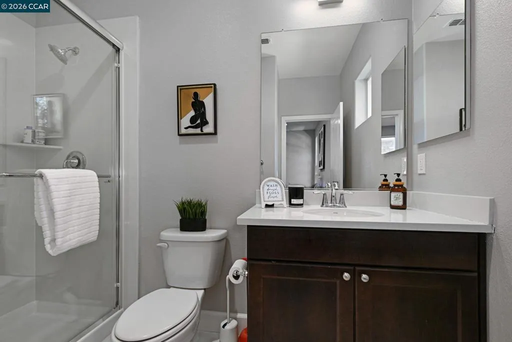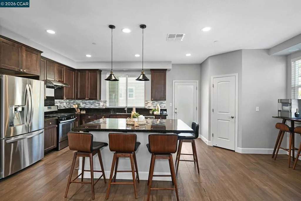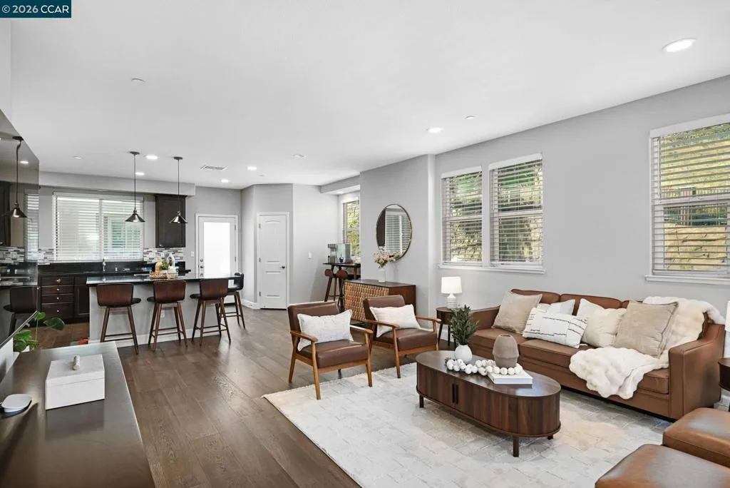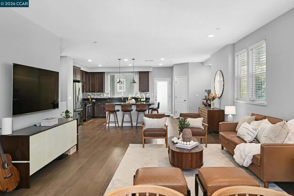 Experience elevated living in this stunning end-unit home that lives like a single-family residence. With over 2,000 sq ft, this light-filled home offers 4 bedrooms, 3.5 baths, and an ideal open-concept layout designed for both everyday living and unforgettable entertaining. The beautifully appointed kitchen features a gas range, walk-in pantry, and generous prep space, flowing seamlessly into the expansive great room with sleek engineered wood flooring, a modern aesthetic, and room for both a large dining table and big screen TV. Step onto the private balcony—perfect for grilling or unwinding at sunset. A highly desirable main-level bedroom with a full bath offers flexibility for guests, a home office, or multigenerational living. Upstairs, retreat to the luxurious primary suite with a spa-inspired bath, dual vanities, and an oversized walk-in closet. Two additional spacious bedrooms, a convenient laundry room, and a tankless water heater complete the upper level. Enjoy energy efficiency, abundant storage, and a two-car garage. Ideally located in The Villages at Arnold with distant views of Mt. Diablo, a community tot lot, and close proximity to parks, top-rated schools, BART, freeways, and vibrant Downtown Martinez. Don’t miss this exceptional opportunity!