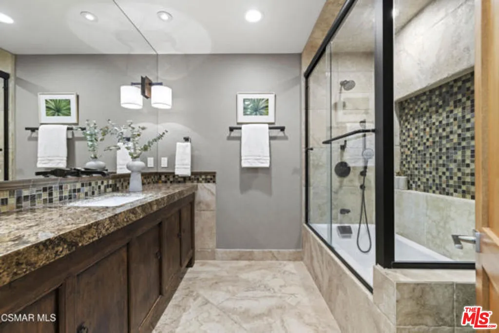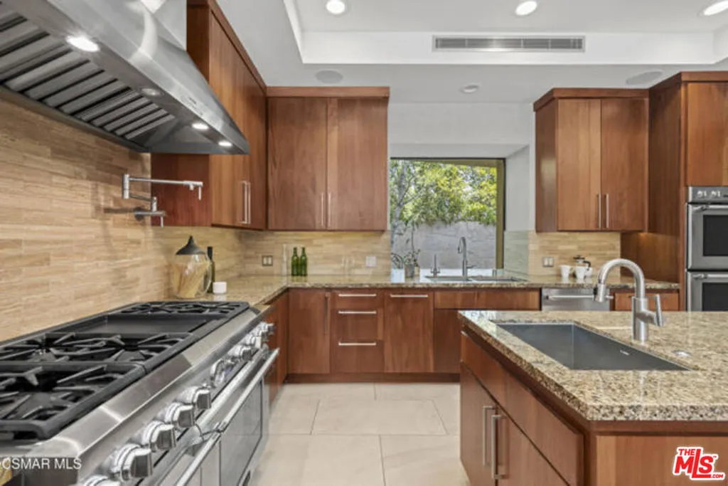 Welcome to a truly one-of-a-kind architectural estate in the prestigious Amestoy Estates of Encino. Rebuilt in 2014, this exceptional single-story Mid-Century Modern residence masterfully blends timeless design with refined modern luxury, offering an elevated living experience on a quiet private cul-de-sac.Spanning approximately 3,835 square feet, the home is thoughtfully configured with three bedrooms and 3.5 bathrooms, along with a beautifully designed office that can easily serve as a fourth bedroom if desired. Every detail reflects exceptional craftsmanship, with interiors showcasing exposed wood beams, clerestory windows, skylights, coffered ceilings, and rich custom wood inlays. Stacked stone accents, bespoke millwork, and curated designer lighting create a warm yet sophisticated atmosphere throughout. At the center of the home, the expansive great room opens seamlessly to a stunning open-air atrium, where cascading waterfalls and lush landscaping create a serene, resort-like setting that beautifully blurs the line between indoor and outdoor living.Custom built-in cabinetry, stone slab surfaces, and heated flooring further highlight the home's commitment to quality and comfort. The gourmet kitchen is a true chef's showcase, featuring premium Thermador appliances, including a dual-oven gas range with custom hood, additional wall ovens, built-in refrigerator, and dishwasher. A spacious walk-in pantry, elegant finishes, and a highly functional layout make it ideal for both everyday living and entertaining. A sophisticated wine bar completes the space.The primary suite offers a private retreat with its own fireplace and a spa-inspired bathroom featuring a jetted soaking tub, steam shower, and luxurious finishes throughout. Secondary bedrooms include custom walk-in closets with cedar paneling and automated lighting, combining thoughtful design with everyday convenience.Modern amenities include solar panels, a whole-house water filtration system, dual tankless water heaters, dual HVAC systems, a dedicated utility room, and a three-car garage with epoxy flooring and custom built-in storage.The resort-style backyard is designed for both relaxation and recreation, featuring a full-size tennis court and a sparkling pool, creating an extraordinary outdoor living experience. This remarkable residence is more than a homeit is a statement of design, lifestyle, and distinction, offering a rare opportunity in one of Encino's most coveted neighborhoods.