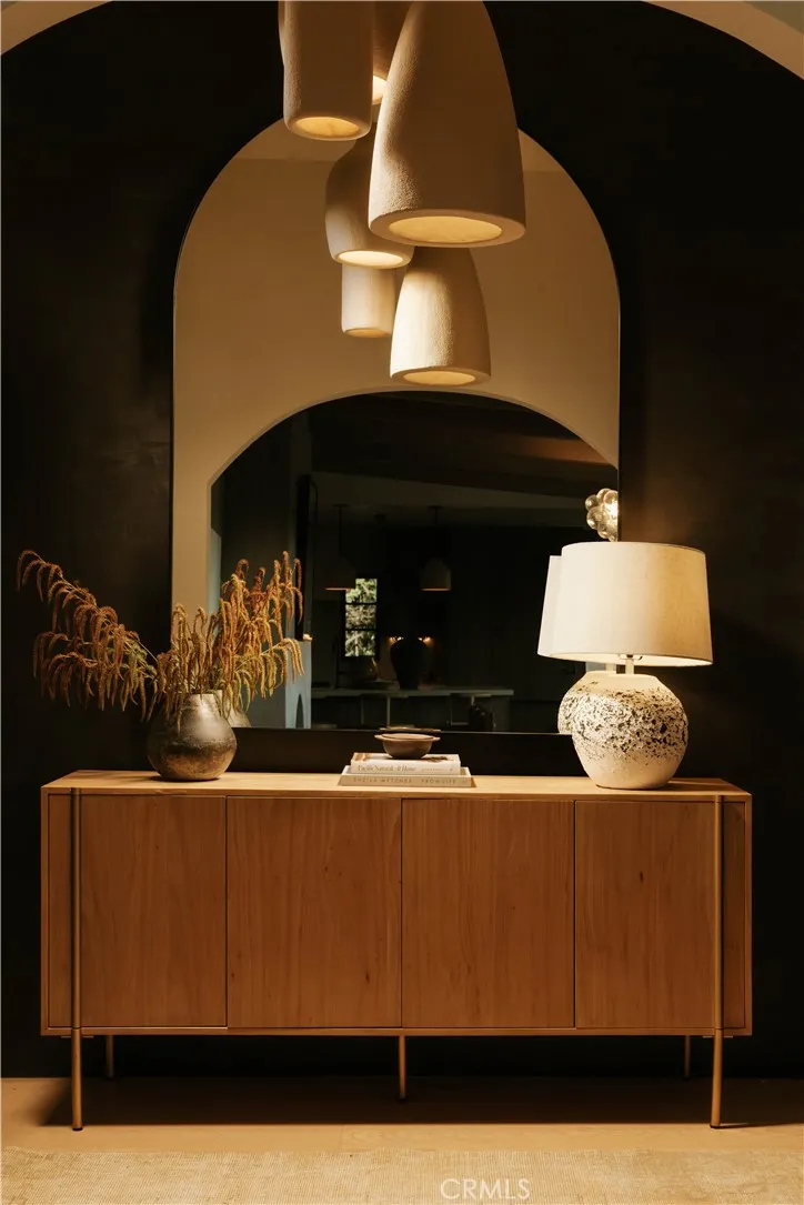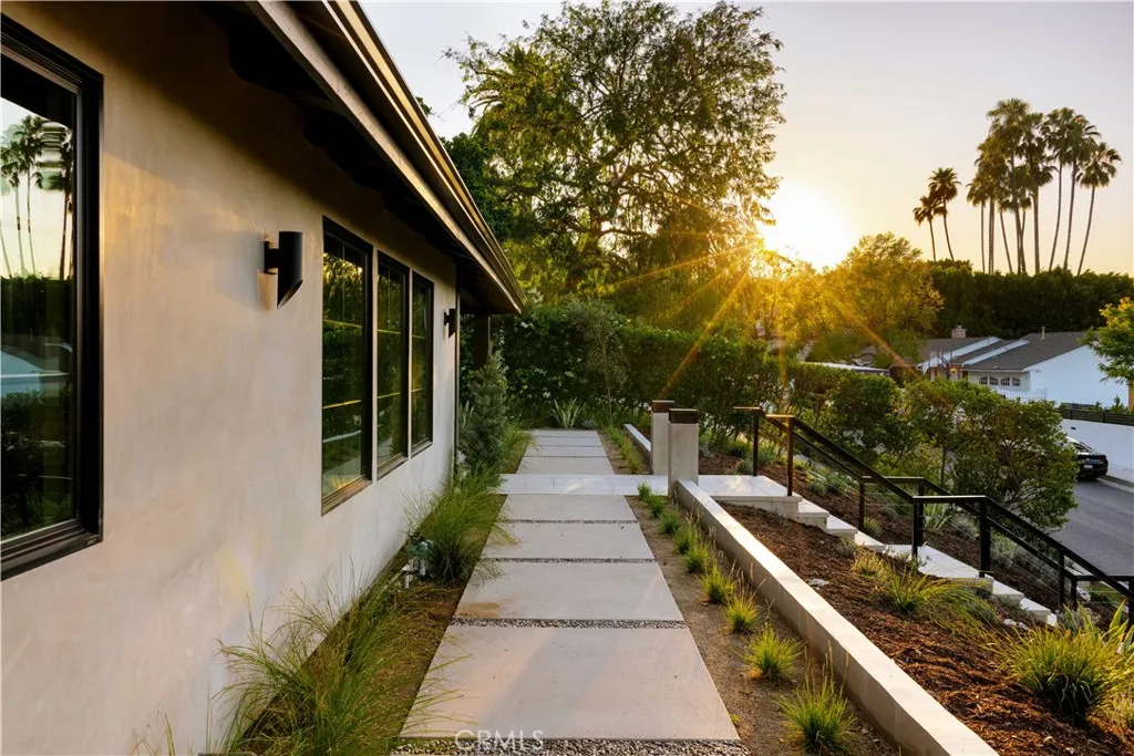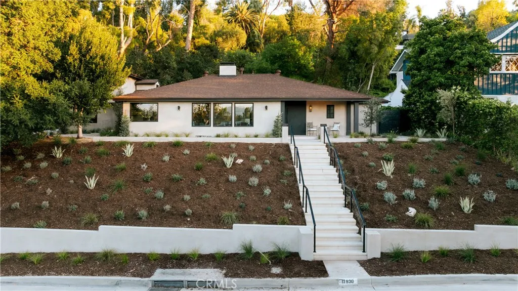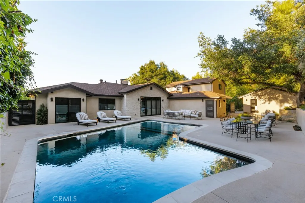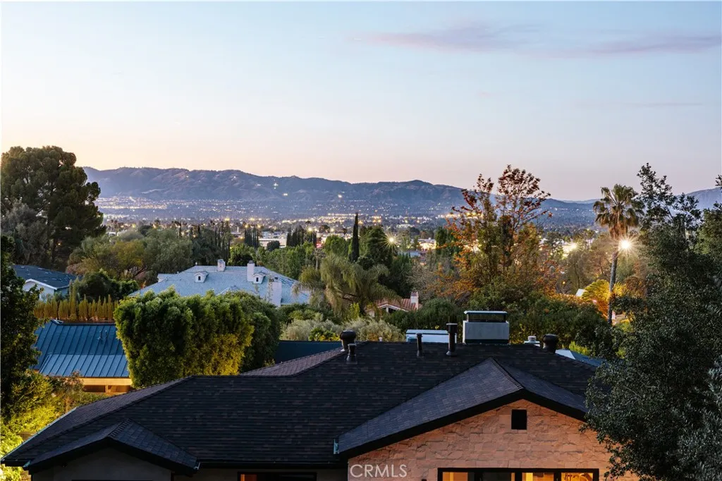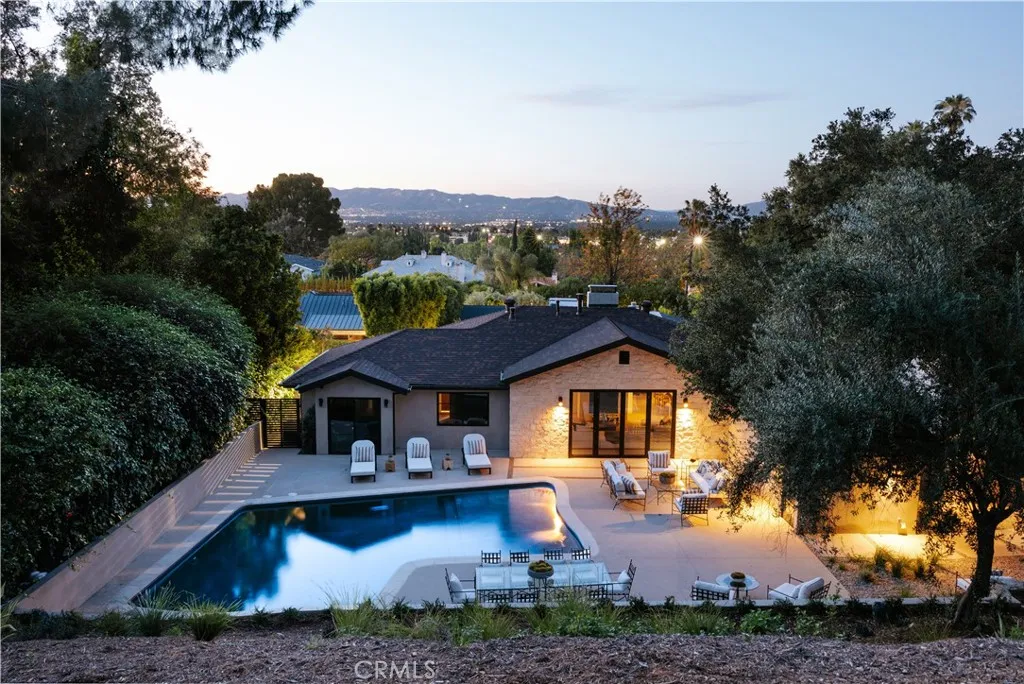 Perched above the street with commanding views, this gated Encino estate offers a rare blend of privacy, scale, and refined design. Set behind a private driveway south of Ventura Boulevard, the residence has been meticulously reimagined to embody a sophisticated, modern Mediterranean aesthetic. Every detail has been thoughtfully curated, with a full rebuild including new plumbing, electrical, and roof systems. Interiors are defined by a rich, organic palette of white oak floors, clay and hand-applied plaster walls, and custom walnut cabinetry, layered with exposed wood beams and sculptural architectural lines that evoke understated luxury. Designed for both grand entertaining and elevated everyday living, the main living spaces unfold with effortless flow, bathed in natural light and seamlessly connecting to the outdoors. The chef’s kitchen serves as a striking centerpiece, appointed with travertine-look surfaces, integrated Thermador appliances, and a sculptural island that anchors the space with quiet sophistication. Bathrooms are finished in microcement, offering a clean, gallery-like aesthetic that complements the home’s natural materials and refined tone. The primary suite is a private sanctuary, designed with a spa-like sensibility, while each secondary bedroom reflects the same level of craftsmanship and intention. Outdoors, the grounds feel like a secluded retreat. A Pebble Tec pool, multiple lounge areas, and expansive entertaining spaces are set against a backdrop of sweeping views, creating an atmosphere that is both serene and cinematic. Modern living is elevated through a fully integrated smart home system, with seamless control of audio, security, and climate. All of this is just minutes from the vibrant amenities of Ventura Blvd, including top-rated restaurants, shops, grocery stores, and hiking trails. The home is also conveniently close to prestigious private schools & public schools, offering the best of both privacy and convenience.