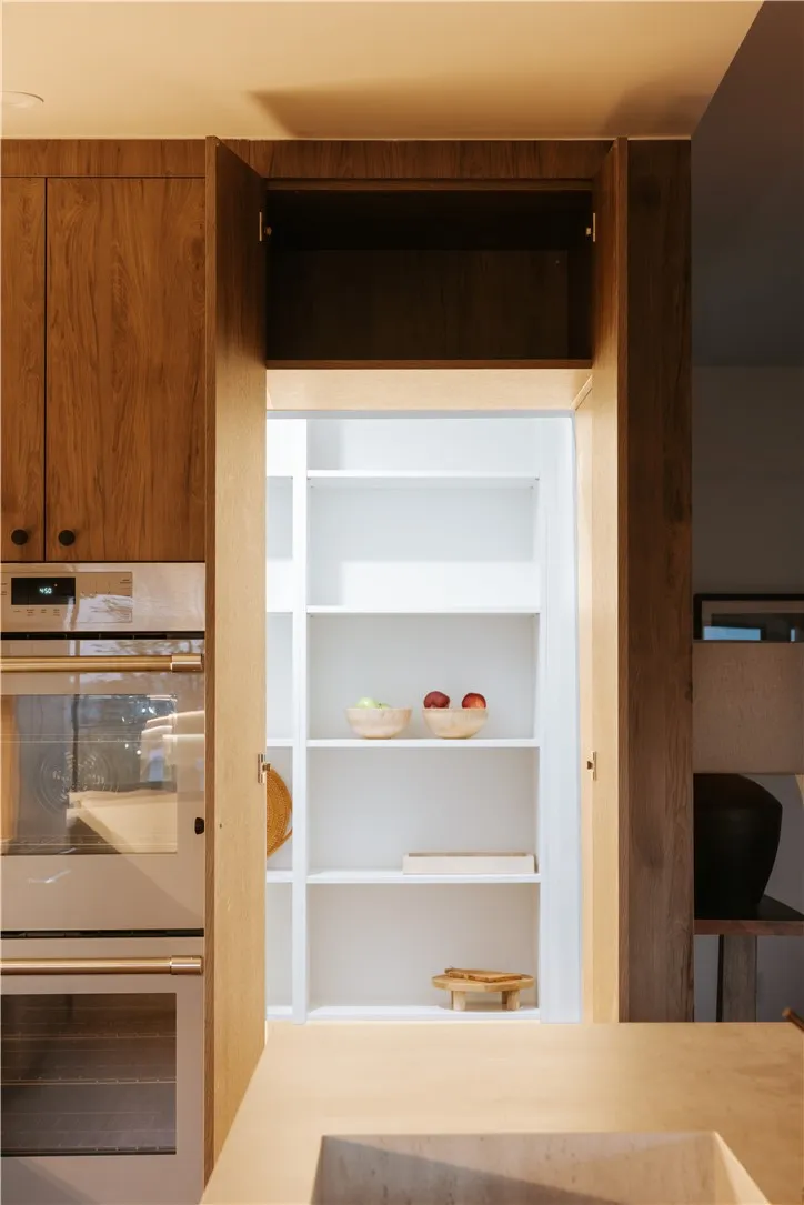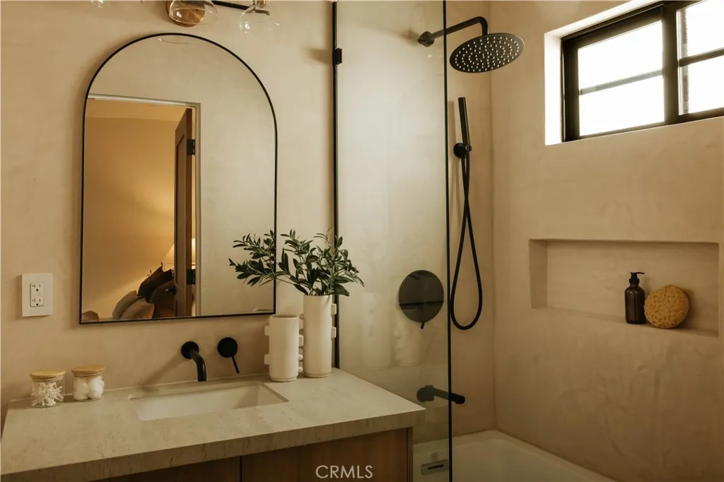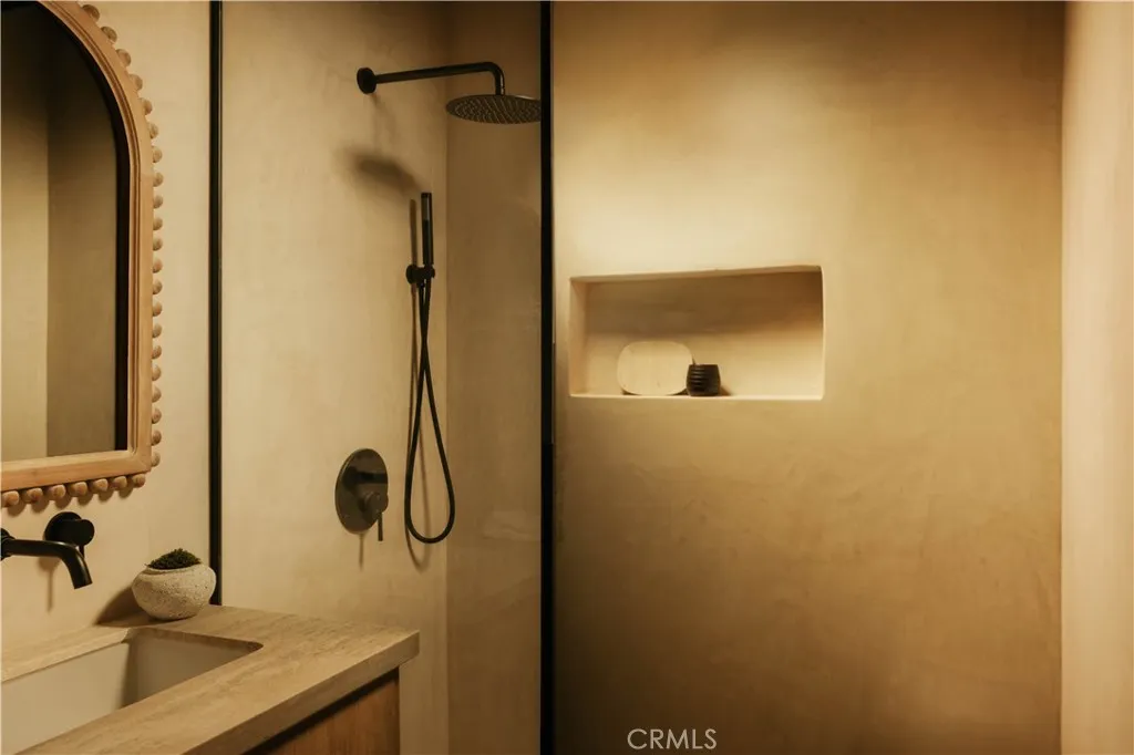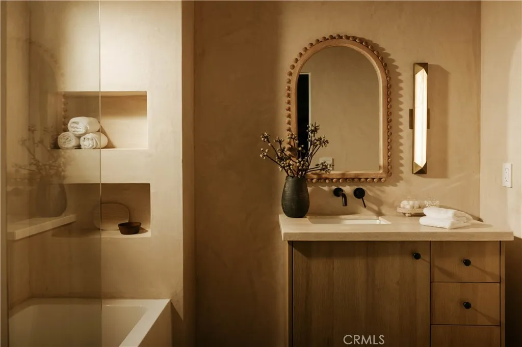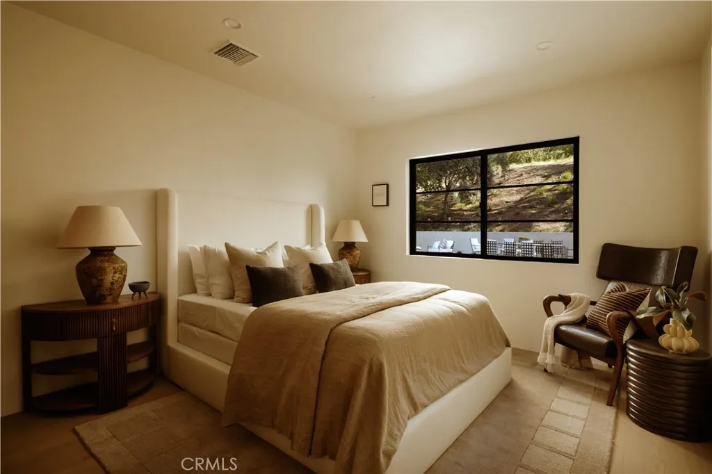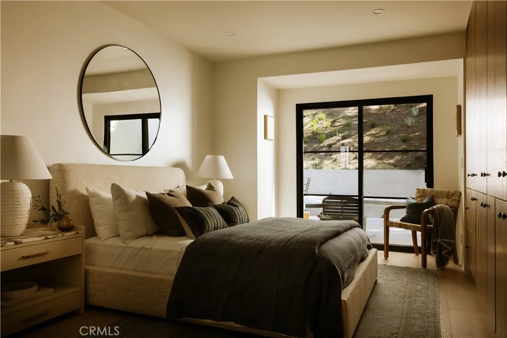 Perched above the street with commanding views, this gated Encino estate offers a rare blend of privacy, scale, and refined design. Set behind a private driveway south of Ventura Boulevard, the residence has been meticulously reimagined to embody a sophisticated, modern Mediterranean aesthetic. Every detail has been thoughtfully curated, with a full rebuild including new plumbing, electrical, and roof systems. Interiors are defined by a rich, organic palette of white oak floors, clay and hand-applied plaster walls, and custom walnut cabinetry, layered with exposed wood beams and sculptural architectural lines that evoke understated luxury. Designed for both grand entertaining and elevated everyday living, the main living spaces unfold with effortless flow, bathed in natural light and seamlessly connecting to the outdoors. The chef’s kitchen serves as a striking centerpiece, appointed with travertine-look surfaces, integrated Thermador appliances, and a sculptural island that anchors the space with quiet sophistication. Bathrooms are finished in microcement, offering a clean, gallery-like aesthetic that complements the home’s natural materials and refined tone. The primary suite is a private sanctuary, designed with a spa-like sensibility, while each secondary bedroom reflects the same level of craftsmanship and intention. Outdoors, the grounds feel like a secluded retreat. A Pebble Tec pool, multiple lounge areas, and expansive entertaining spaces are set against a backdrop of sweeping views, creating an atmosphere that is both serene and cinematic. Modern living is elevated through a fully integrated smart home system, with seamless control of audio, security, and climate. All of this is just minutes from the vibrant amenities of Ventura Blvd, including top-rated restaurants, shops, grocery stores, and hiking trails. The home is also conveniently close to prestigious private schools & public schools, offering the best of both privacy and convenience.