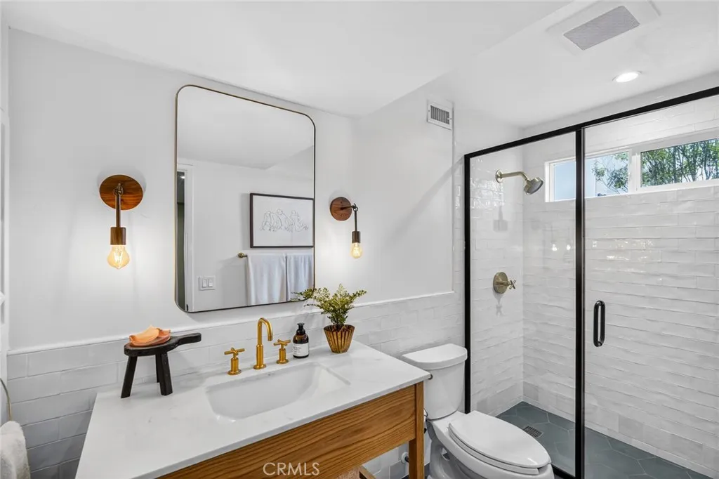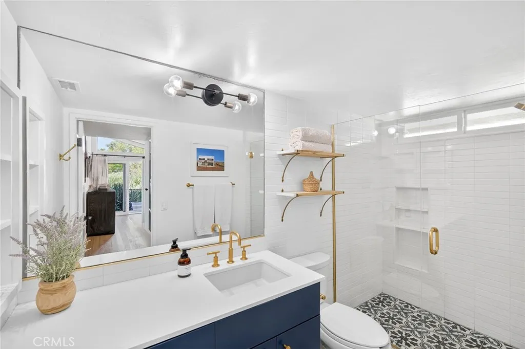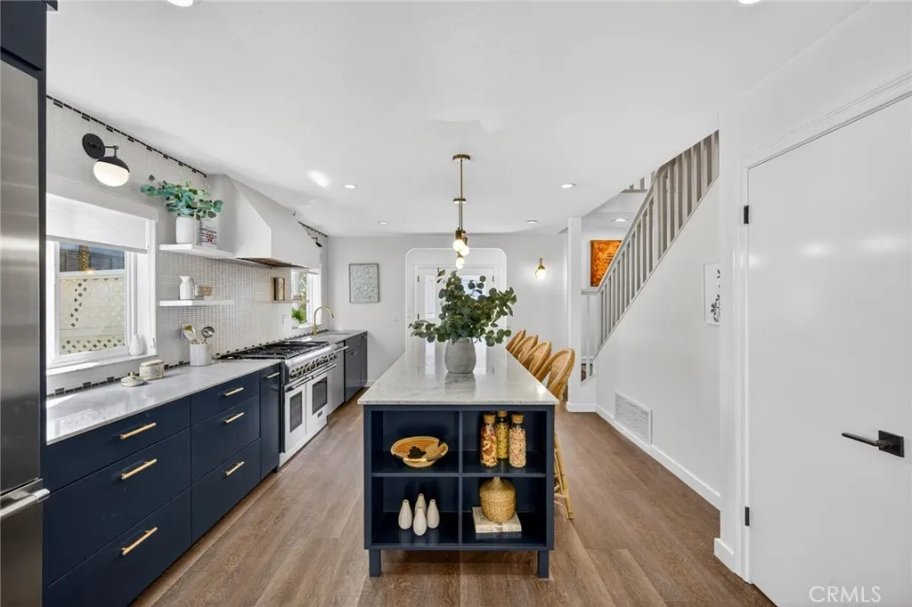 Perched in the coveted Arch Beach Heights neighborhood, this coastal retreat is a rare offering that pairs a clean, modern aesthetic with the uncommon luxury of an oversized double lot. Just one block from the community park, hiking trails, and neighborhood amenities, the home has been thoughtfully upgraded to deliver both elevated design and effortless indoor-outdoor living. At the heart of the home, a chef’s kitchen anchors the main level with a striking marble island, custom navy cabinetry, and refined gold hardware. Outfitted with Thermador appliances and Kohler fixtures, the space blends performance with style, while flowing seamlessly into light-filled living areas defined by warm wood flooring and curated designer finishes. Throughout the home, high-end materials—including tile and finishes sourced from Walker Zanger, Ann Sacks, Cement Tile Shop, and Concrete Collaborative—add a level of craftsmanship and detail that quietly sets it apart. The floor plan offers exceptional versatility, featuring a dedicated office that can easily function as an additional bedroom, along with a playroom or secondary den that provides flexible space for families or guests. Upstairs, a second living area creates the perfect entertaining retreat, complete with a custom bar accented by a dark penny-tile backsplash, built-in shelving, and polished brass details. This space opens to a private balcony with tranquil treetop and neighborhood views, enhancing the home’s seamless connection to its surroundings. Outside, the oversized lot becomes a private sanctuary—an increasingly rare find in Laguna Beach. Designed for both relaxation and entertaining, the backyard features a built-in BBQ, expansive sun deck, and lush, mature landscaping that creates a sense of total seclusion. Whether hosting gatherings or enjoying quiet coastal evenings, the setting is both intimate and inviting. Combining thoughtful design, flexible living spaces, and a premier location just moments from the best of Laguna Beach, this property offers a compelling blend of scale, style, and lifestyle.