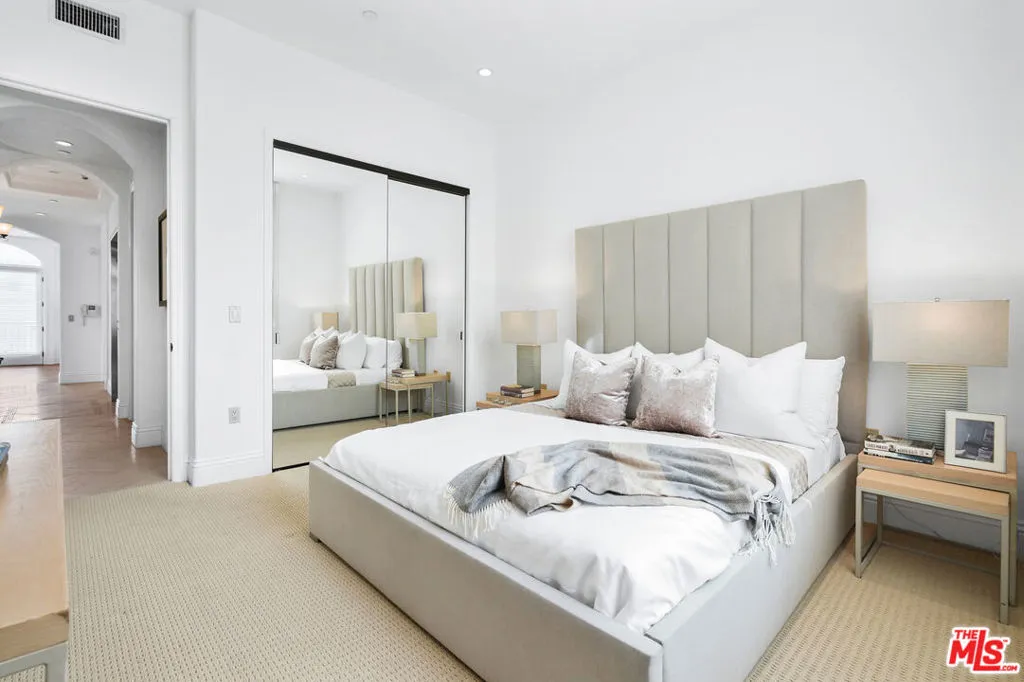 Live in this spectacular top-floor Penthouse unit in a boutique 8 unit building mere steps from Beverly Hills and historic Burton Way. Epitome of luxury living with extra high ceilings (10+ft), high-end finishes, floor to ceiling French doors with tons of natural light from coveted Southern and Western exposure. This executive unit takes up half the Penthouse floor with more than 2,200 living space. Direct entry elevator opens to the foyer with immediate access to modern "great room" layout perfect for large family and friends gatherings. Upgraded kitchen boasts professional Viking appliances, wine fridge and large center island, and opens to spacious living room with fireplace and formal dining room - an entertainer's dream. Grand double doors lead to front-facing terrace with tree-top views and sunsets. Separate bedroom wing has 2 guest bedrooms and huge Primary Bedroom retreat with fireplace, enormous walk-in closet, and sumptuous spa-like bath. Comfort features include hardwood floors throughout, shades on windows, tuned HVAC and full size side-by-side laundry in unit. Incredible location without the zipcode pricing: short stroll or roll to the Beverly Center, high-end Roberston Blvd shopping district, boutiques and restaurants on 3rd street, The Grove/Farmers Market and Cedars Sinai.
