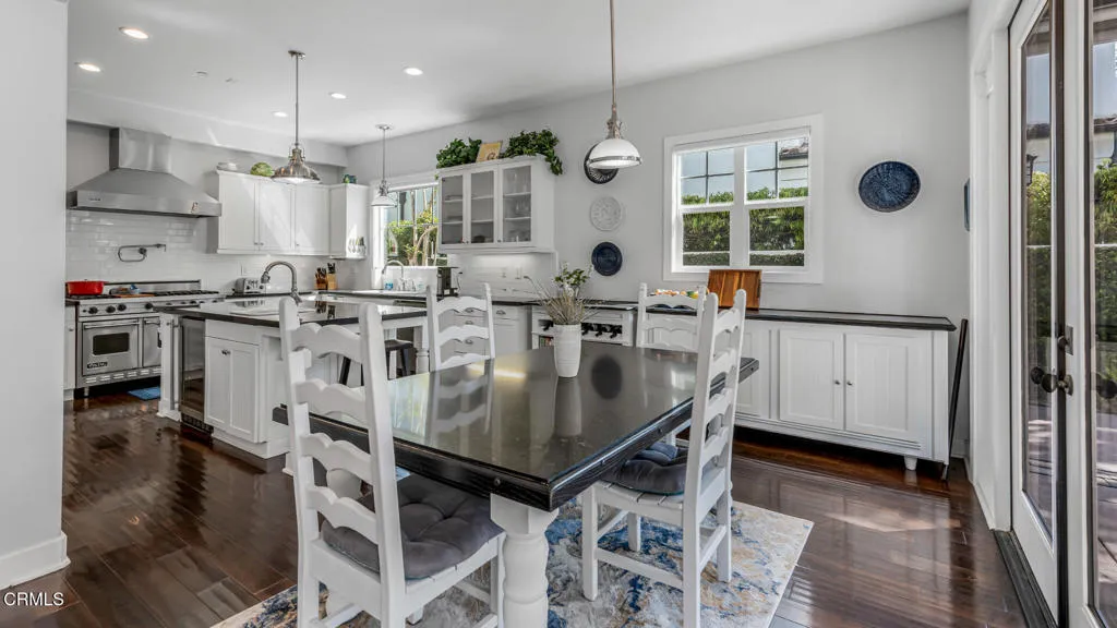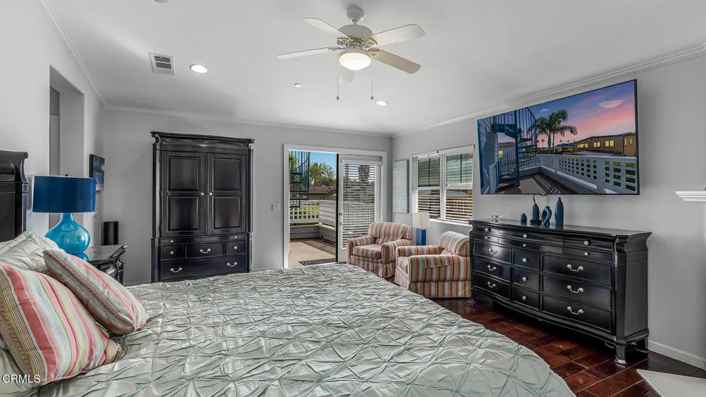 Just moments from the sand, this beautifully maintained coastal residence offers a wonderful blend of warmth, thoughtful design, and effortless beach-side living. Lovingly cared for by its original owners, the home welcomes you with a dramatic entry featuring soaring ceilings and an immediate sense of light and openness that carries throughout.Sunlight fills the living spaces, enhanced by a desirable orientation and a private backyard that feels both peaceful and inviting. The main level unfolds with a natural flow, including a formal dining room that opens to a serene side yard with a fountain, a comfortable great room centered around a cozy fireplace, and a dedicated library with custom woodwork and built-ins, ideal for quiet mornings or working from home. The kitchen is designed for both gathering and functionality, complete with a generous island, prep sink, pot filler, and premium Viking appliances.Upstairs, spacious bedrooms provide comfort and flexibility, while the primary suite serves as a true retreat with a beautifully appointed bath and an expansive walk-in closet. Private balconies extend the living space outdoors, and a spiral staircase leads to a stunning rooftop deck where Channel Island and Ventura mountain views create an unforgettable setting for entertaining or unwinding.Additional features include abundant storage throughout, a dedicated laundry room, a well-equipped garage, and a private pathway offering convenient access toward the beach, completing this exceptional coastal offering.