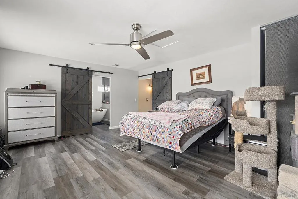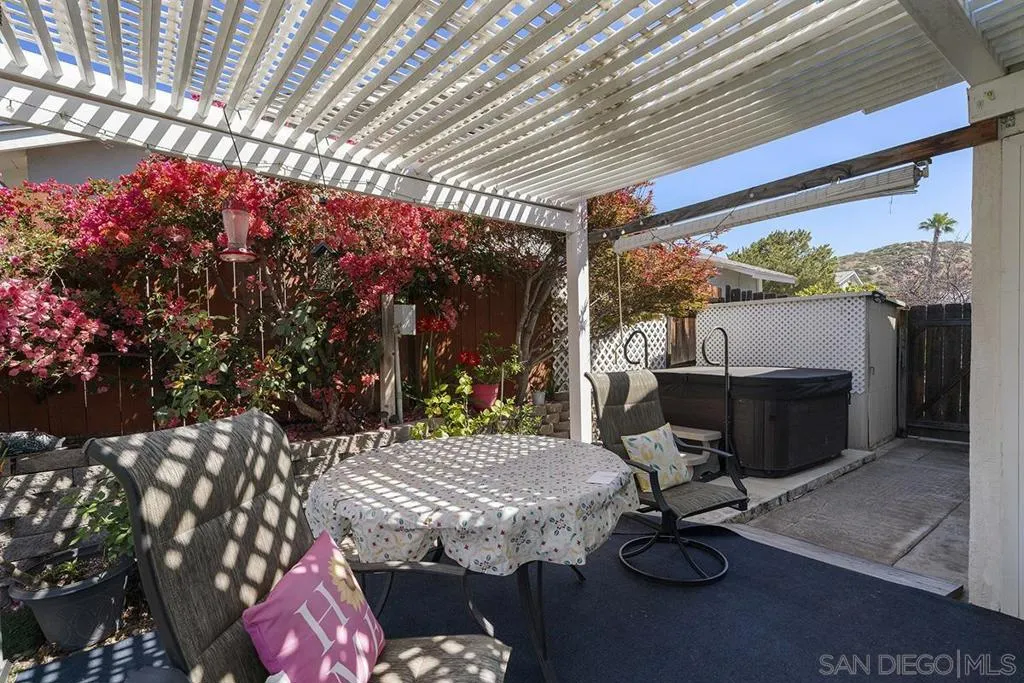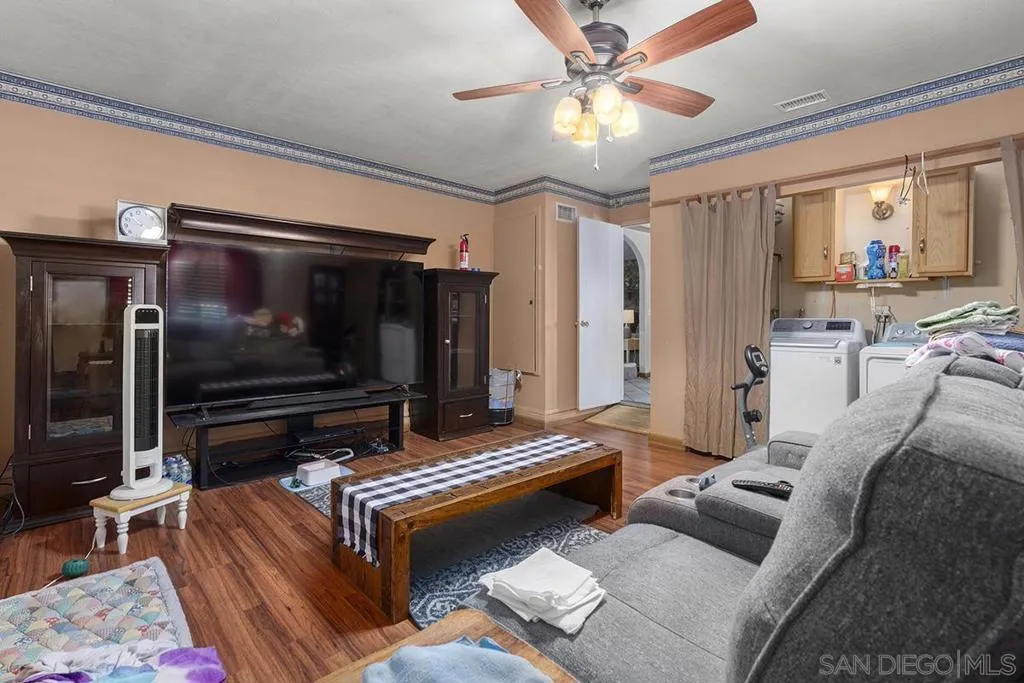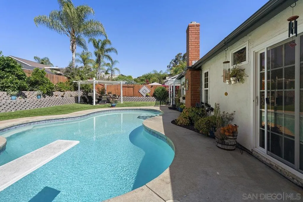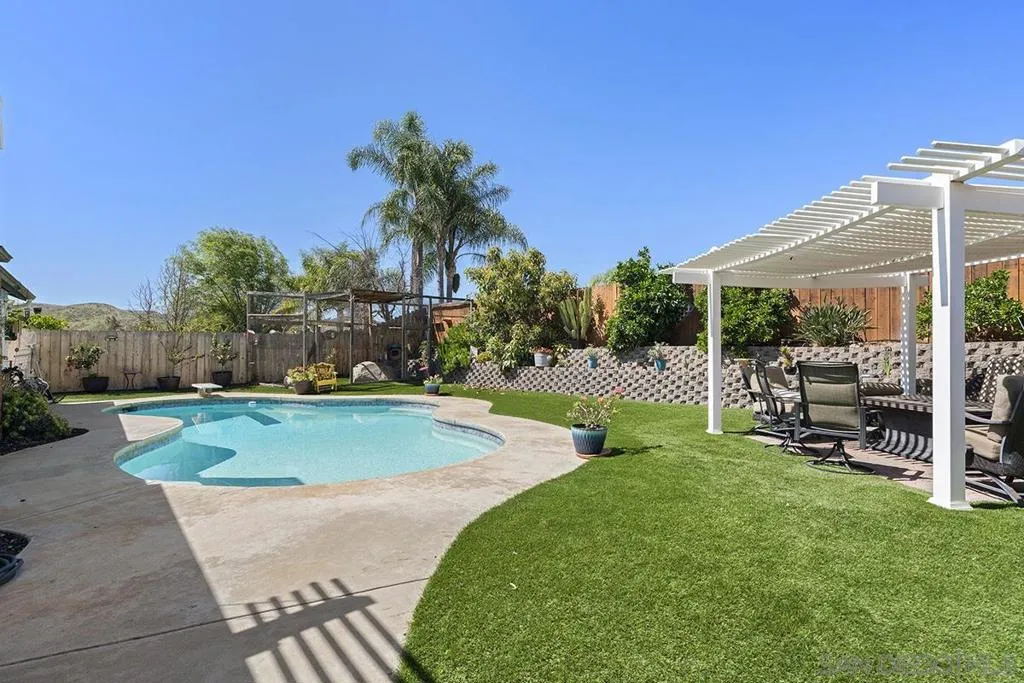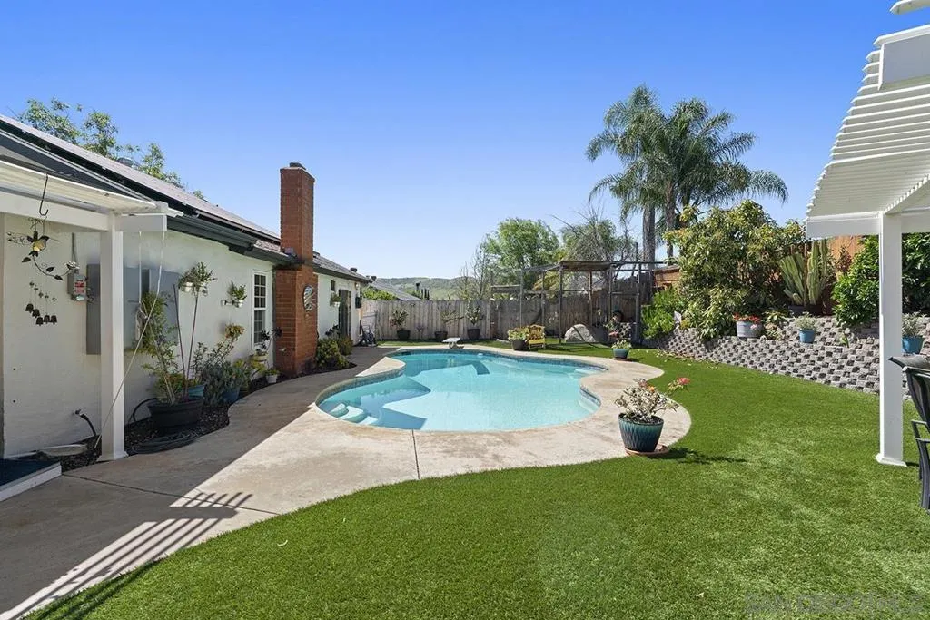 4 bedrooms and a full 3 baths. Quiet street. Move in ready home with a pool and an above ground spa. Two rooms could be primary. One downstairs and one large one upstairs (this was 2 rooms when it was built, now one large mster bedroom, the only room upstairs). Huge vaulted ceilings in the living room give this is grand feel. 49 solar panels and a new solar battery system. see attached. Recent SDGE bill was 23.00. Floor plan is in the pictures. Garage door is still on the front of this garage. Garage is partially converted to a family room. This is the room with the large TV in the pics. This is not permitted. This garage conversion is not part of the square footed listed in MLS. Garage has a few feet deep of storage. New owner could opt to remove one wall and turn this back into a garage.