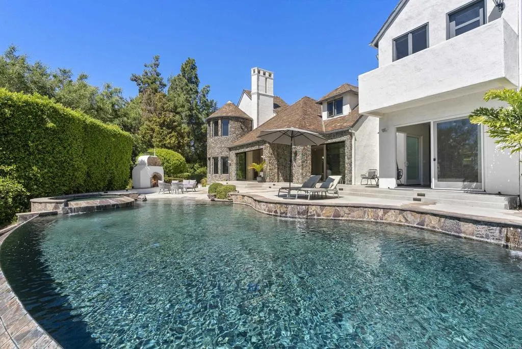 Extraordinary views are featured from this elevated site on the desirable north side of the guard-gated community of Fairbanks Ranch. This French-inspired chateau blends timeless architectural style with modern luxury. A dramatic stone-lined driveway continues through a tunnel below the estate leading to a private motor court, setting the stage for this exceptional property. The ~7,174 sq. ft. residence is designed for both comfort and entertaining. The remodeled interior features an open concept with hardwood flooring, chic lighting and sliding doors for seamless indoor-outdoor flow. Highlights include a chef’s kitchen with commercial-grade appliances, sun drenched breakfast nook, a theater with tiered seating, and an old-world wine cellar. Panoramic views complement the primary suite with 2 walk-in closets, a stunning bath, fireplace, an office, and an exercise/sitting room with vaulted ceiling. Set on 1.1 acres, the resort-style grounds offer an infinity pool, spa, outdoor fireplace, sports/pickleball court and owned whole house solar with Tesla battery. A charming, detached guest house with fireplace and sauna adds privacy and flexibility. Walking distance to all neighborhood amenities that include 75-acres of common area with walking and equestrian trails, a private lake with fishing and paddle boating, four tennis courts, four pickleball courts, clubhouse, private park with playground for children, sand volleyball and half basketball court, and a first class equestrian center. A rare opportunity to own a private hilltop retreat just minutes from world-class dining, shopping, and beaches.