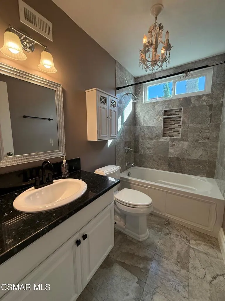 Welcome to this beautifully remodeled home with stunning views in the heart of Thousand Oaks! A charming, drought-tolerant landscaped walkway leads you to the inviting entry and into a bright, open living room featuring a cozy fireplace. The spacious, updated kitchen offers abundant cabinetry, stainless steel appliances, and flows seamlessly into the family room, which is perfect for everyday living and entertaining. Upstairs, you'll find generously sized secondary bedrooms complete with ceiling fans, ample closet space, and plush carpeting. The stunning hallway bathroom is complete with a large bathtub and shower and thoughtful upgrades. The light-filled primary suite boasts a large closet and a sliding door that open to beautiful scenic views. The attached bathroom has been tastefully updated and includes a well-sized bathtub for relaxation. Step outside to your private backyard oasis, featuring a covered patio, low-maintenance drought-tolerant landscaping, and plenty of space to entertain, which is all set against a backdrop of breathtaking views. An additional lower-level area provides even more flexible space to suit your needs. Additional highlights include tile flooring throughout the downstairs, window coverings, recessed lighting, updated light fixtures, an updated powder room, and an indoor washer and dryer. Ideally located near excellent shopping and dining, this home is also part of the highly regarded Conejo Valley Unified School District.