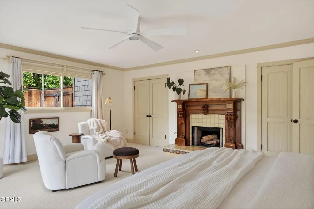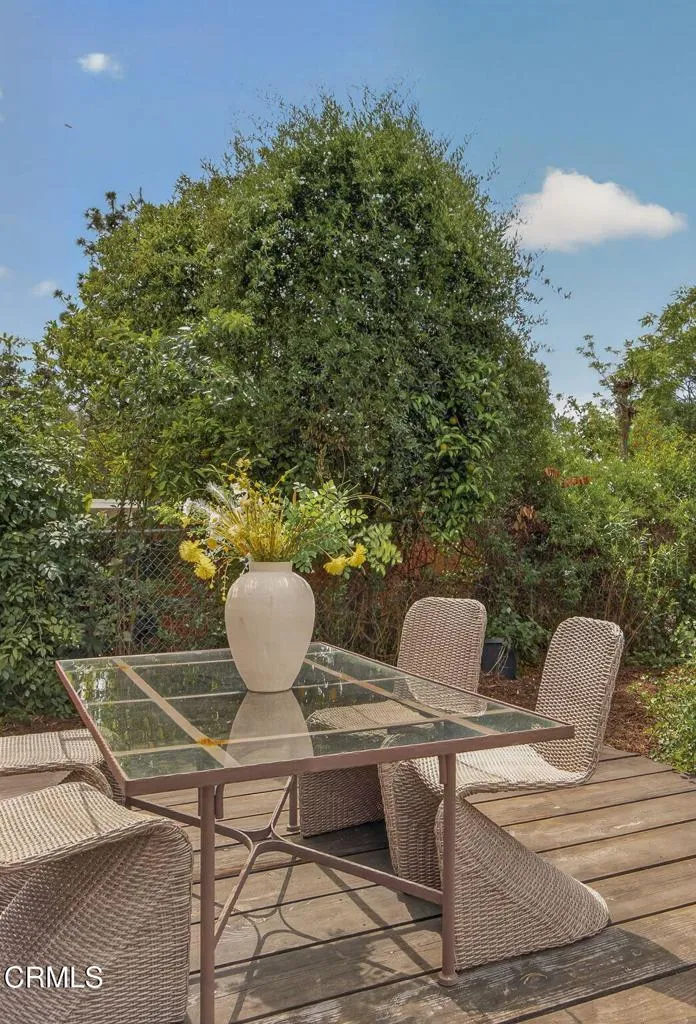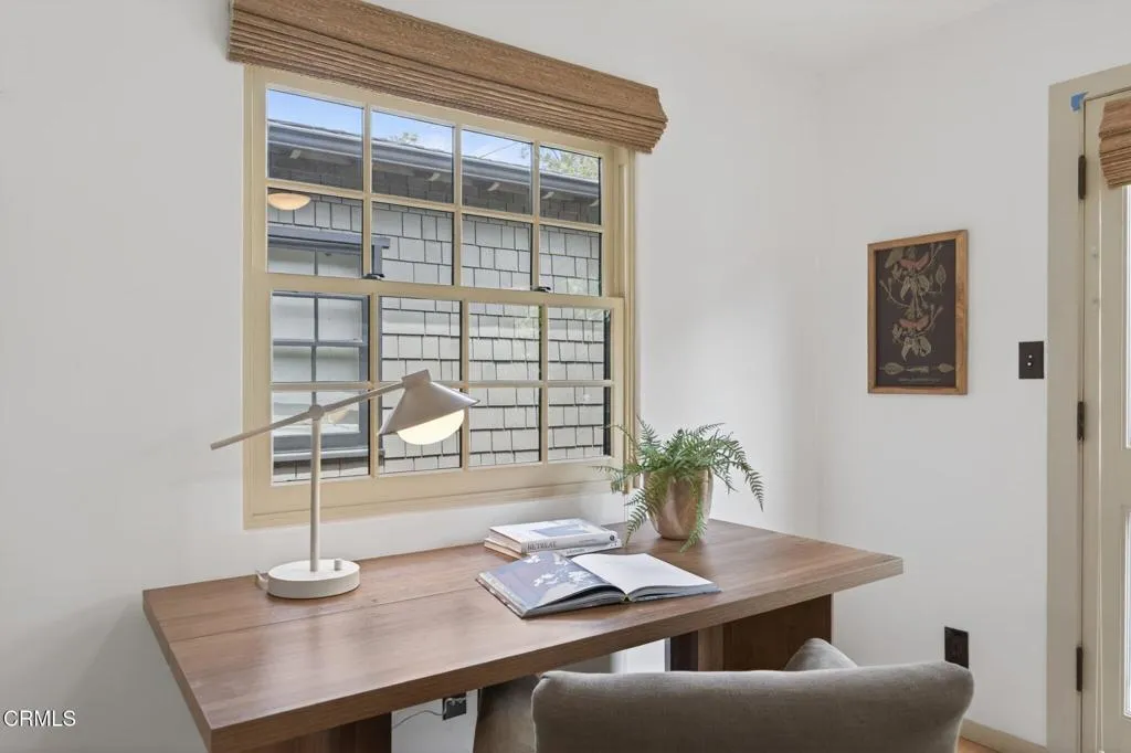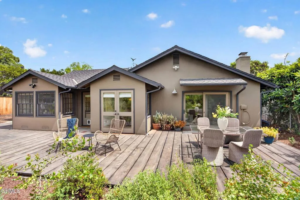 Thoughtfully designed single-level Arts and Crafts home with 2,110 sq ft, 3 bedrooms plus office, 2 baths, and a two-car garage. Warm wood floors, abundant natural light, and a functional layout with two bedrooms and an office on one wing and a private primary suite on the other. The primary suite features a fireplace, walk-in closet, French doors to a private patio, and an ensuite bath with soaking tub and separate shower.The kitchen is a true Craftsman expression, centered around an authentic vintage stove and complemented by ornate cabinetry, rich tilework, a dedicated workstation, and pantry area. Formal dining overlooks the backyard, while the living room offers built-in bookshelves, a fireplace, and sliding doors that open to the deck with mountain views.The 10,454 sq ft lot is thoughtfully designed as a curated native plant garden, featured in the 2024 Re-Wild Ojai Native Garden Tour, with meandering pathways and a variety of edible plantings including elderberry, currant, wild grape, chia, pomegranate, black fig, mulberry, persimmon, olive, and blackberry. A custom-built tool shed designed as an art piece and a sculptural stone water feature enhance the property's unique character. Additional features include owned solar and French doors in the office and one guest bedroom. A rare blend of location, design, and natural beauty in the heart of Ojai.