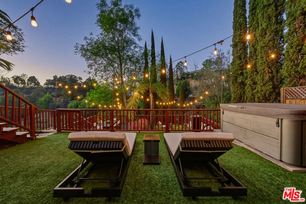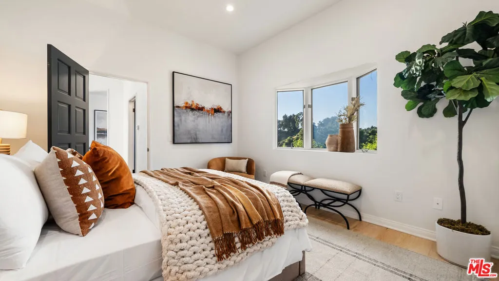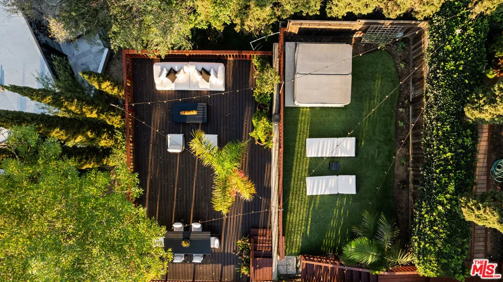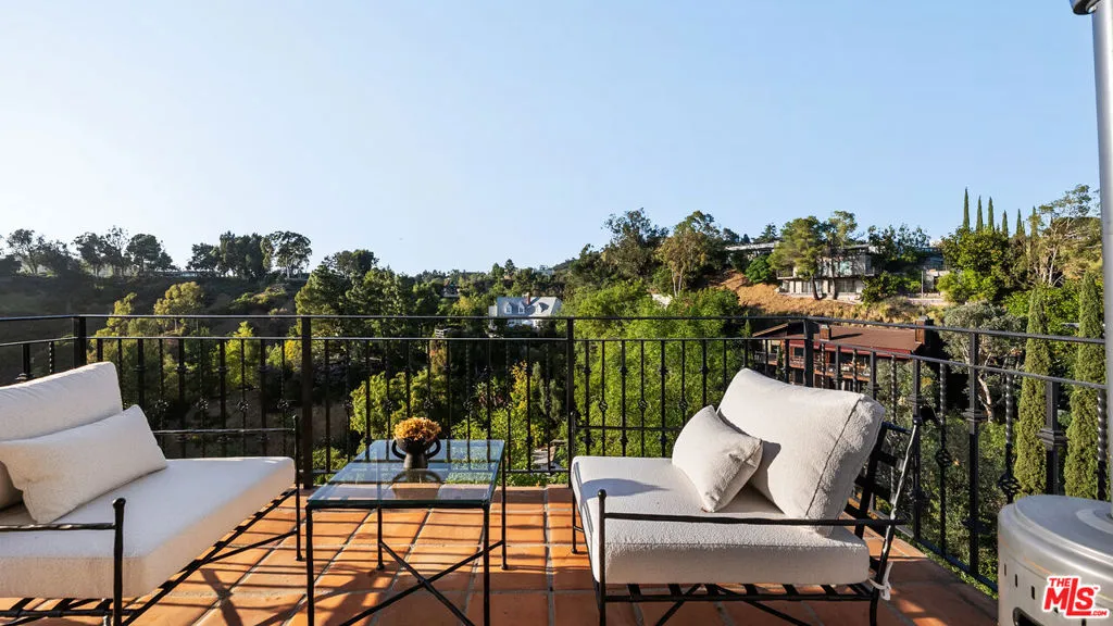 Tucked away in the privacy of Laurel Canyon, this thoughtfully updated contemporary art-deco retreat offers sweeping views of rolling hills and a true sense of calm, all while remaining just minutes from the heart of Los Angeles. Framed by mature cypress trees and filled with natural light, the home feels like a private escape with a strong connection to its canyon setting. The main residence features four bedrooms and four bathrooms with refined finishes and a highly functional layout ideal for both everyday living and entertaining. Two distinct living areas flow seamlessly into a gourmet kitchen, while multiple balconies invite indoor outdoor living and showcase serene canyon views from nearly every angle. The primary suite serves as a private sanctuary with expansive views, custom closets, and a spa inspired bathroom featuring marble finishes, a soaking tub, heated floors, and a glass enclosed shower. Below the main home, a separate one bedroom guest residence offers its own private entrance, full kitchen, in unit laundry, sunroom, and wrap around deck, making it ideal for guests, extended family, or a home office. Outdoor living is exceptional with multiple tiered decks designed for lounging, dining, and entertaining, along with a spa perfect for relaxing day or night. Additional amenities include a two car garage, private carport, ample parking, and a quiet cul de sac location, delivering a rare blend of privacy, comfort, and refined canyon living in one of the most sought after enclaves of the Hollywood Hills.