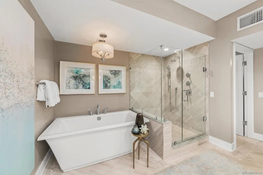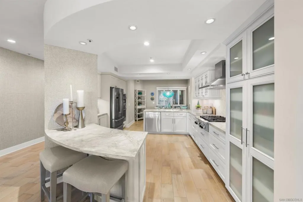 This truly stunning Coronado Point bayfront condo is graced with an abundance of light, sophisticated ambiance & fabulous coastal style. Featuring exquisite decor and details throughout this spacious approx. 2589 sq. ft. 3 bedroom, 3 bath single level residence. Completely remodeled with articulate attention to a design showcasing an open-concept floor plan that seamlessly connects the elegant living inside to a large wrap-around patio with skyline views, the perfect setting for entertaining and al fresco dining. A gourmet kitchen with beautiful stone tiles & counters, top-of-the-line appliances & breakfast nook adjoins the living & dining spaces. Custom flooring, stunning cabinetry, spa-like primary suite with gorgeous bath & patio, plus two very large secondary suites. Coronado Point features luxury vacation style living in a private gated community with pool, spa, BBQs, gym & lavish gardens. 2 parking spaces plus private storage room. It is Gorgeous! Welcome Home.