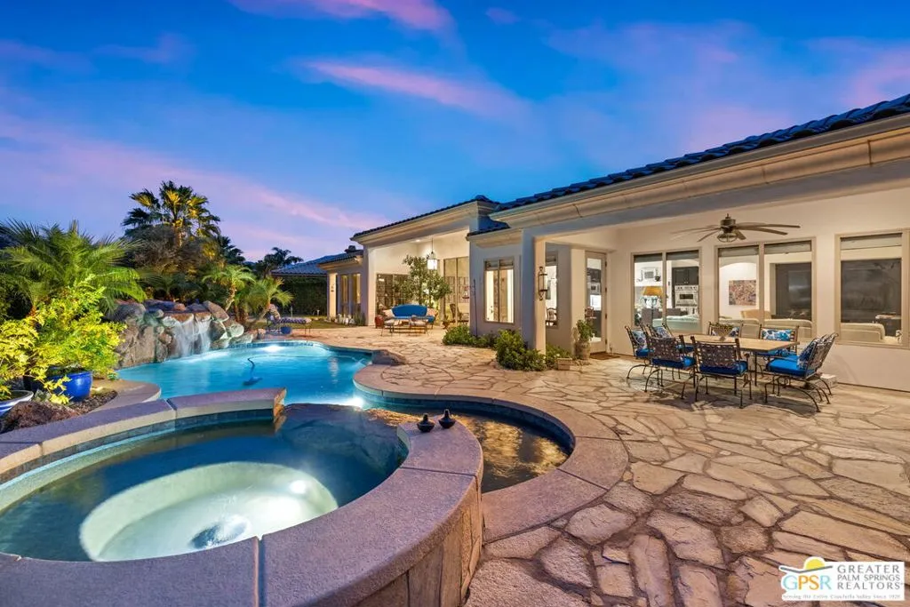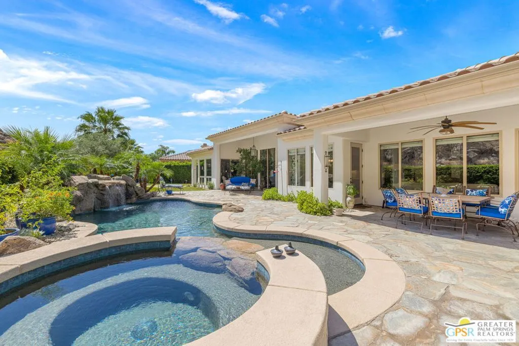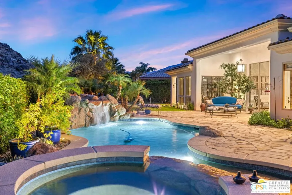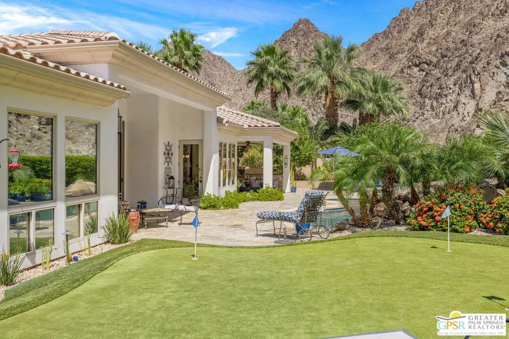 Welcome to the gated enclave of Hidden Canyon where you will find this extraordinary La Quinta residence. This home is the epitome of a private desert sanctuary, set against a breathtaking backdrop of dramatic rock hills, enveloped in serenity, with hummingbirds and butterflies enhancing the peaceful ambiance. The backyard is nothing short of spectacular, an entertainer's dream featuring a pebble-tec saltwater pool and spa with a cascading rock waterfall (recently refreshed) alongside a fire feature, flagstone hardscape, built-in BBQ, and multiple spaces for dining al fresco under a covered patio. Lush, mature landscaping surrounds you, including a rose garden, vibrant hibiscus, citrus trees (orange, lemon, and lime), and even a private putting green creating a true oasis. This home features four spacious en-suite bedrooms, plus an additional den or study that functions beautifully as a fifth bedroom. The primary suite is a true retreat, complete with dual walk-in closets, a spa-inspired bath with soaking tub, dual vanities, and backyard access. Inside you will find a thoughtful renovation with elevated finishes throughout. Travertine flooring flows seamlessly through expansive living spaces, including two distinct living areas, one anchored by a charming gas fireplace. The oversized gourmet kitchen is a showpiece, featuring quartz countertops, custom cabinetry, a designer backsplash, Sub-Zero refrigeration, stainless steel Viking appliances including a six-burner range, double ovens, a walk-in pantry, and dry bar, perfect for both everyday living and entertaining at scale. Additional highlights include plantation shutters throughout, abundant natural light, electric bamboo shades in the living room, automatic outdoor shades, a dedicated laundry room, and exceptional storage. Modern conveniences include two AC units, an 85-gallon water heater with recirculating pump, and updated systems. The three-car garage includes a separate golf cart garage with windows, plus additional refrigeration and wine fridge. The front yard has been upgraded with new pavers and low-maintenance turf, enhancing curb appeal while preserving ease of living. Ideally located just moments from La Quinta's Town Center with shopping and dining nearby. This dream home offers the perfect blend of privacy, luxury, and convenience.