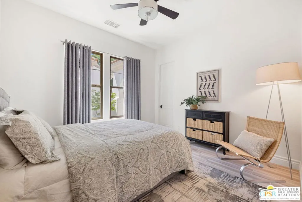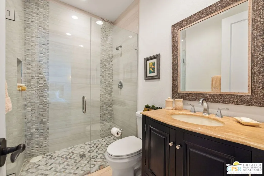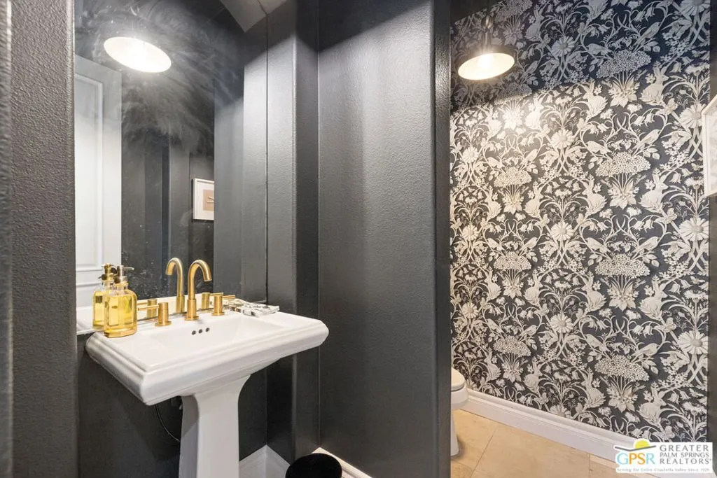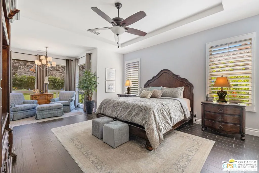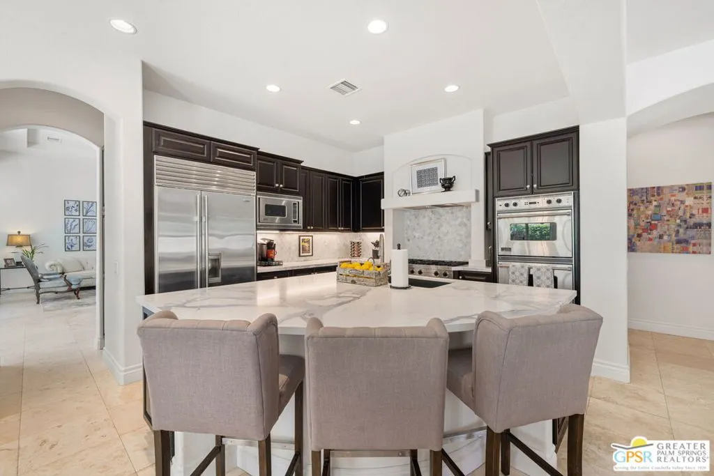 Welcome to the gated enclave of Hidden Canyon where you will find this extraordinary La Quinta residence. This home is the epitome of a private desert sanctuary, set against a breathtaking backdrop of dramatic rock hills, enveloped in serenity, with hummingbirds and butterflies enhancing the peaceful ambiance. The backyard is nothing short of spectacular, an entertainer's dream featuring a pebble-tec saltwater pool and spa with a cascading rock waterfall (recently refreshed) alongside a fire feature, flagstone hardscape, built-in BBQ, and multiple spaces for dining al fresco under a covered patio. Lush, mature landscaping surrounds you, including a rose garden, vibrant hibiscus, citrus trees (orange, lemon, and lime), and even a private putting green creating a true oasis. This home features four spacious en-suite bedrooms, plus an additional den or study that functions beautifully as a fifth bedroom. The primary suite is a true retreat, complete with dual walk-in closets, a spa-inspired bath with soaking tub, dual vanities, and backyard access. Inside you will find a thoughtful renovation with elevated finishes throughout. Travertine flooring flows seamlessly through expansive living spaces, including two distinct living areas, one anchored by a charming gas fireplace. The oversized gourmet kitchen is a showpiece, featuring quartz countertops, custom cabinetry, a designer backsplash, Sub-Zero refrigeration, stainless steel Viking appliances including a six-burner range, double ovens, a walk-in pantry, and dry bar, perfect for both everyday living and entertaining at scale. Additional highlights include plantation shutters throughout, abundant natural light, electric bamboo shades in the living room, automatic outdoor shades, a dedicated laundry room, and exceptional storage. Modern conveniences include two AC units, an 85-gallon water heater with recirculating pump, and updated systems. The three-car garage includes a separate golf cart garage with windows, plus additional refrigeration and wine fridge. The front yard has been upgraded with new pavers and low-maintenance turf, enhancing curb appeal while preserving ease of living. Ideally located just moments from La Quinta's Town Center with shopping and dining nearby. This dream home offers the perfect blend of privacy, luxury, and convenience.