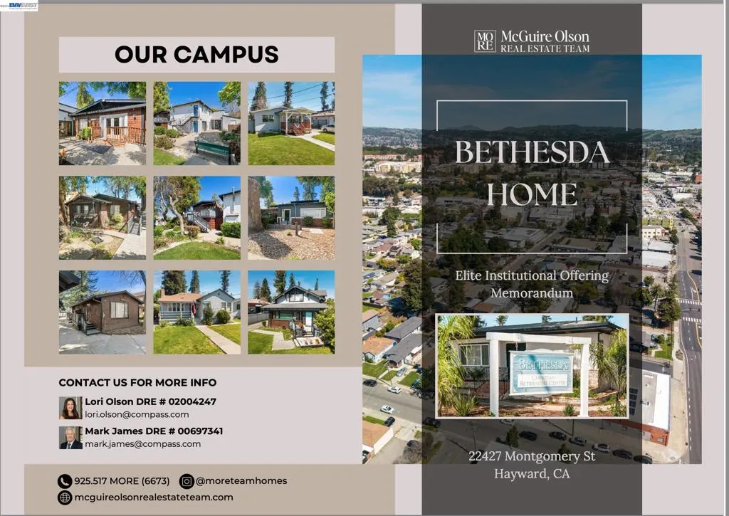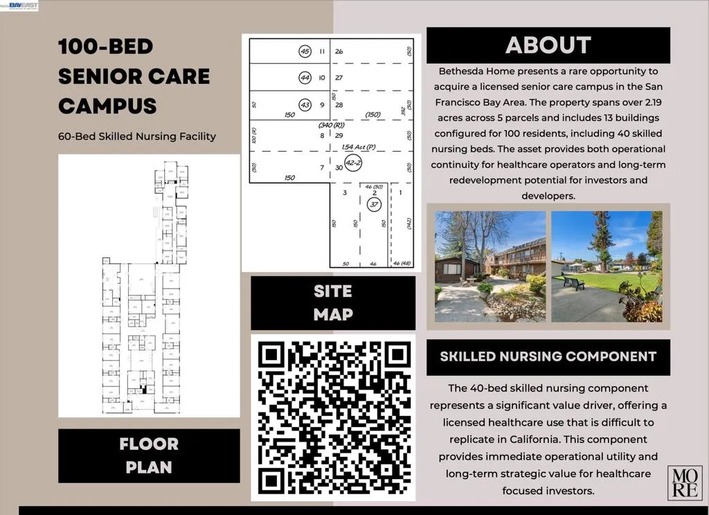 Bethesda Home is a licensed senior care campus located in Hayward, California, situated on 2.19 acres across 5 parcels. The property includes 13 buildings and is currently configured to accommodate up to 100 residents, including 40 skilled nursing beds, along with assisted and independent living components. The campus features secure outdoor areas, landscaped courtyards, and a walkable layout designed for residential care operations. This offering presents a rare opportunity for operators seeking a licensed skilled nursing facility with additional residential care components, as well as for developers exploring higher-density redevelopment potential along A Street. Offered as-is, the property combines existing healthcare infrastructure with long-term land value in a high-demand Bay Area market.