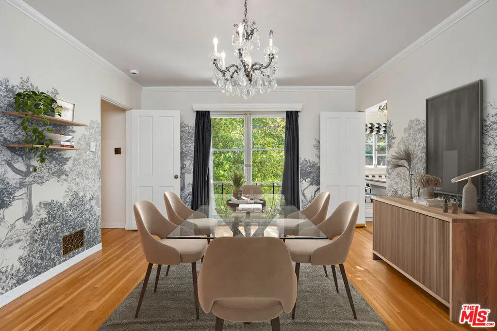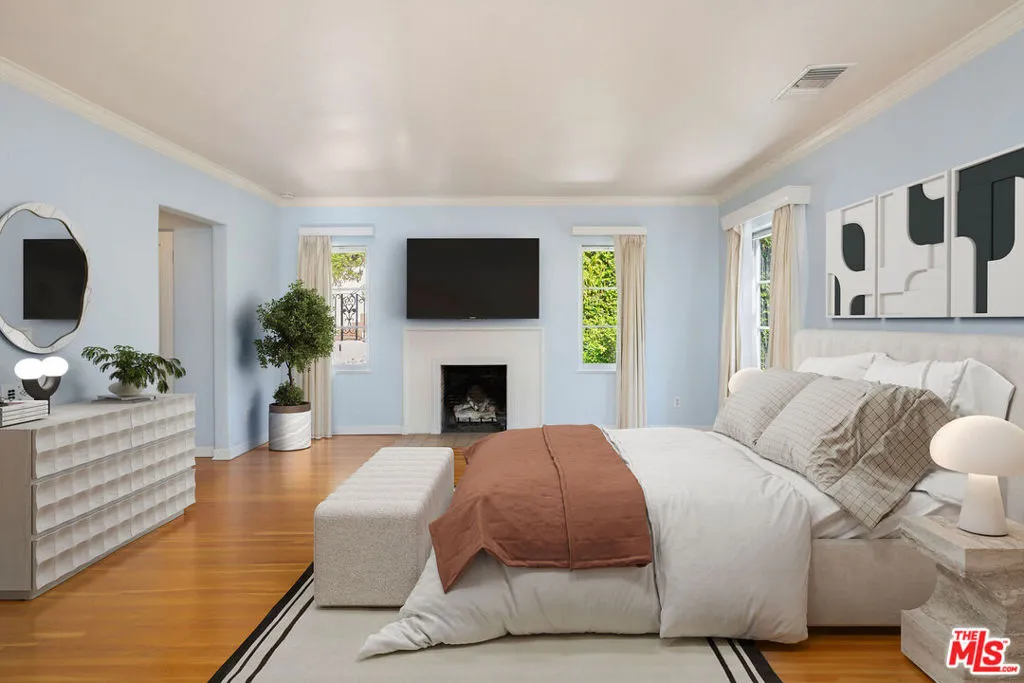 Beautifully landscaped, light-filled and gated Monterrey Colonial in Outpost Estates loaded with charm and abundant outdoor space. Formal entry provides access to a spacious living room with fireplace and views, a sunlit breakfast room and kitchen. First floor also includes an en-suite guest room, laundry room and powder. Upstairs are three spacious bedrooms including the en-suite primary with fireplace and balcony. Multiple patios provide all the space you'll need for al fresco dining and outdoor living space, with canyon vistas and peeks at the city lights. Two-car garage with direct access also connects to a den/office with separate entrance, potential to become an ADU. Coveted location with great access to Runyon Canyon.